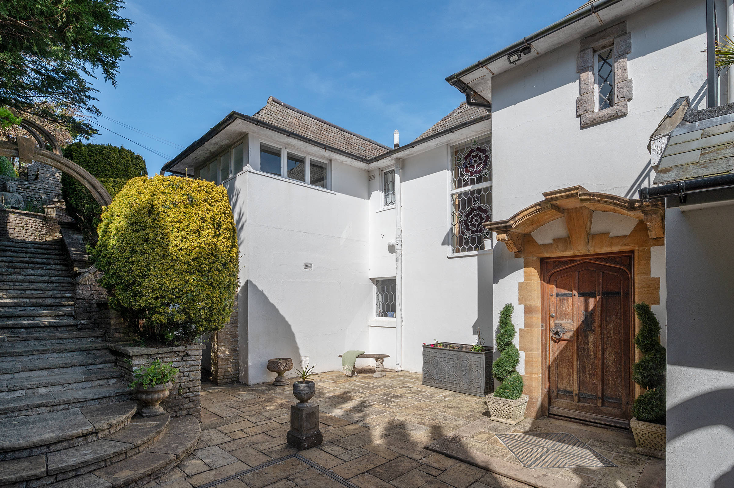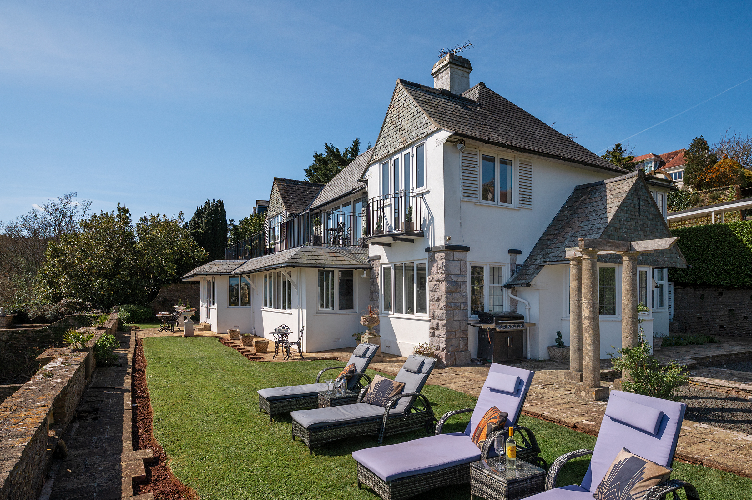 A sunken Rose Garden provides a more intimate setting, enclosed by pergolas carried on Tuscan columns, offering both structure and softness in equal measure. From here, a pathway leads directly to Lincombe Drive, placing Wellswood, Lincombe Woods and Meadfoot Beach within easy reach, and reinforcing the sense that the Gardens are not only beautiful in themselves but also gently connected to the surrounding landscape.