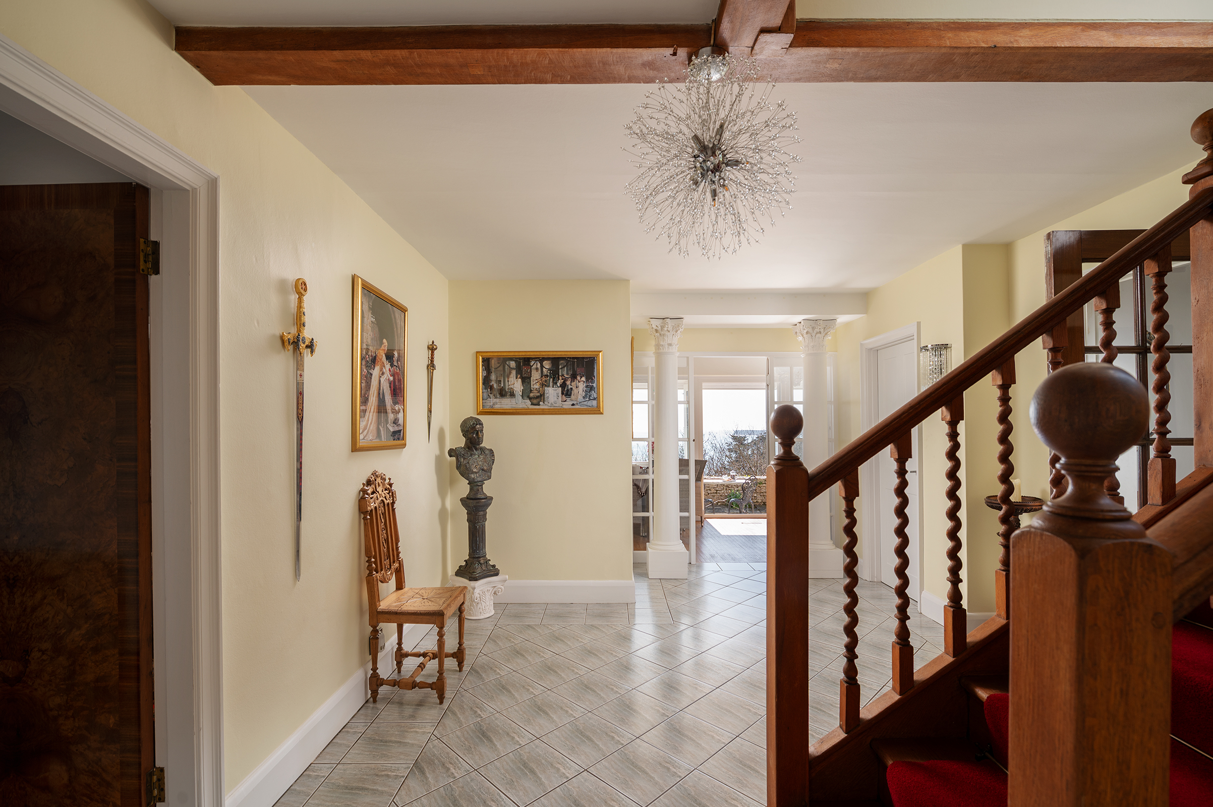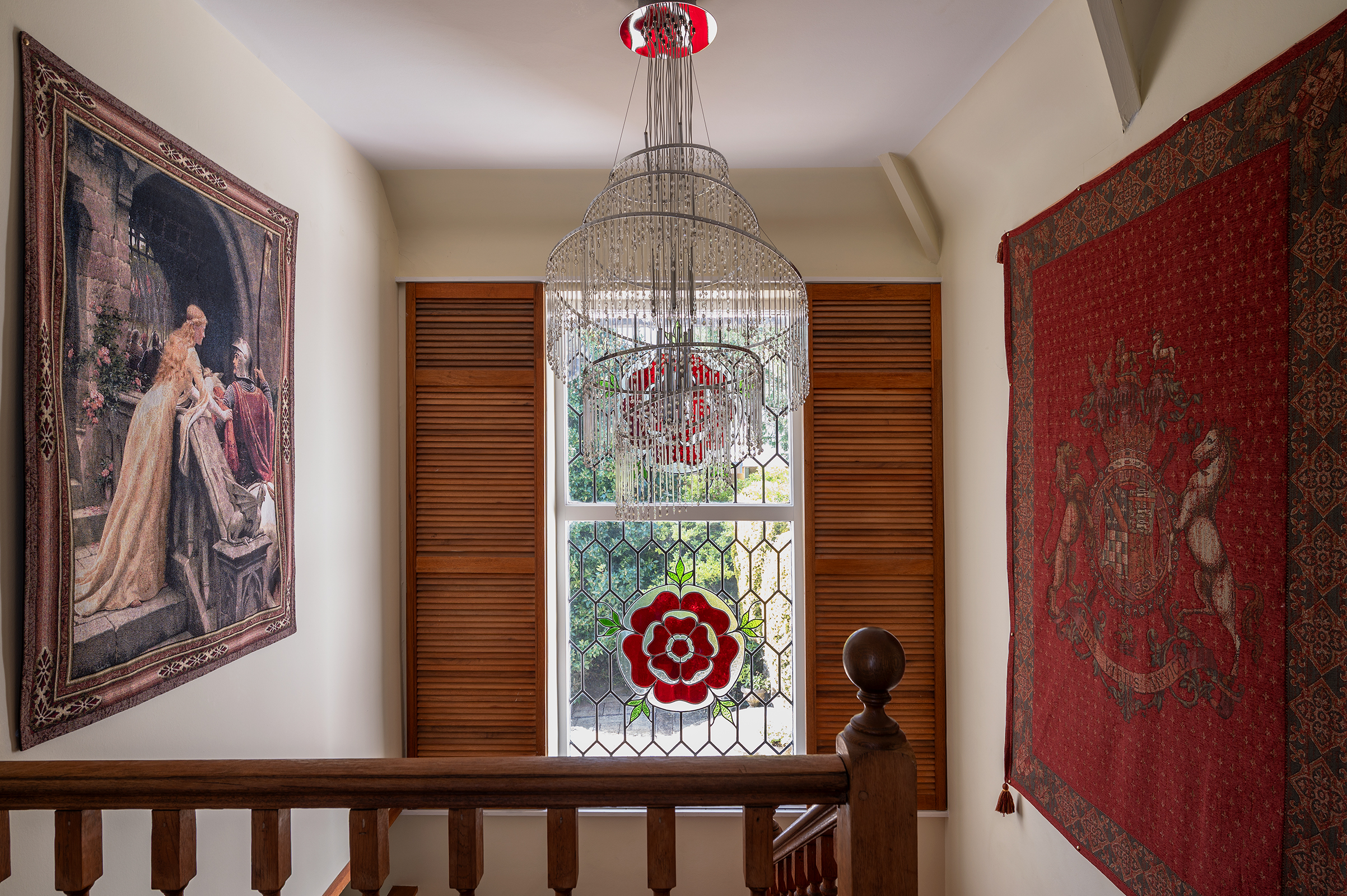 Upstairs, the sense of scale continues, reached via the attractive original staircase that rises gracefully from the Entrance Hall, its barley twist balustrade lending both texture and craftsmanship to the ascent. At the first floor Landing, a large stained glass window, adorned with English rose motifs, filters the light with a gentle warmth, casting subtle colour across the space and reinforcing the quiet artistry that runs throughout the house.