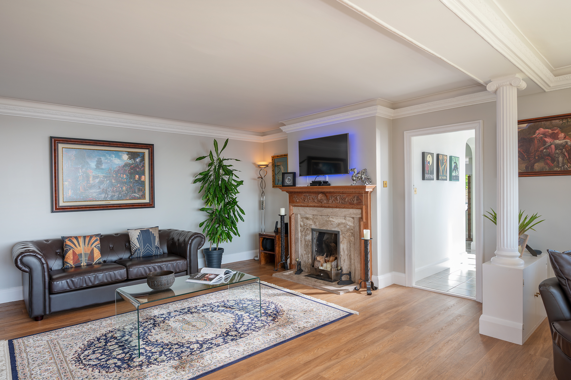 The Reception Hall introduces the home with quiet confidence, setting the tone for what follows. To one side, the Drawing Room forms the natural centrepiece, anchored by a striking fireplace and defined by two vast picture windows that draw the horizon into the room.