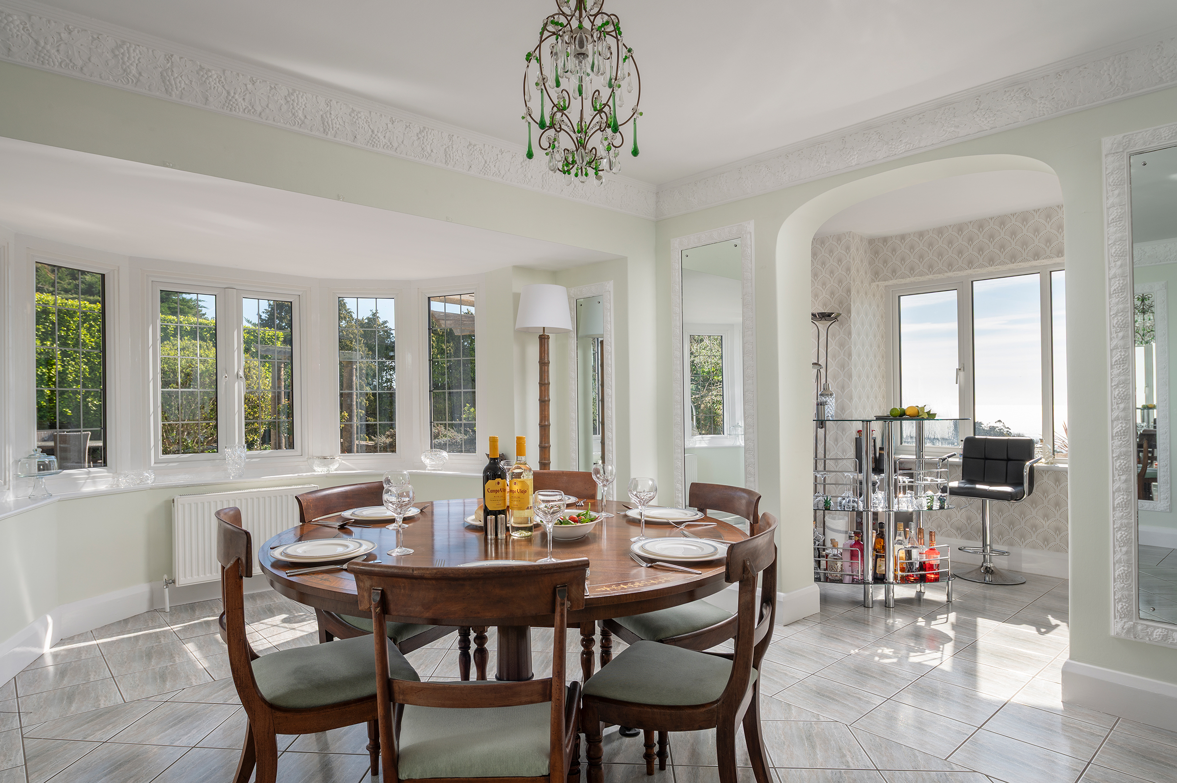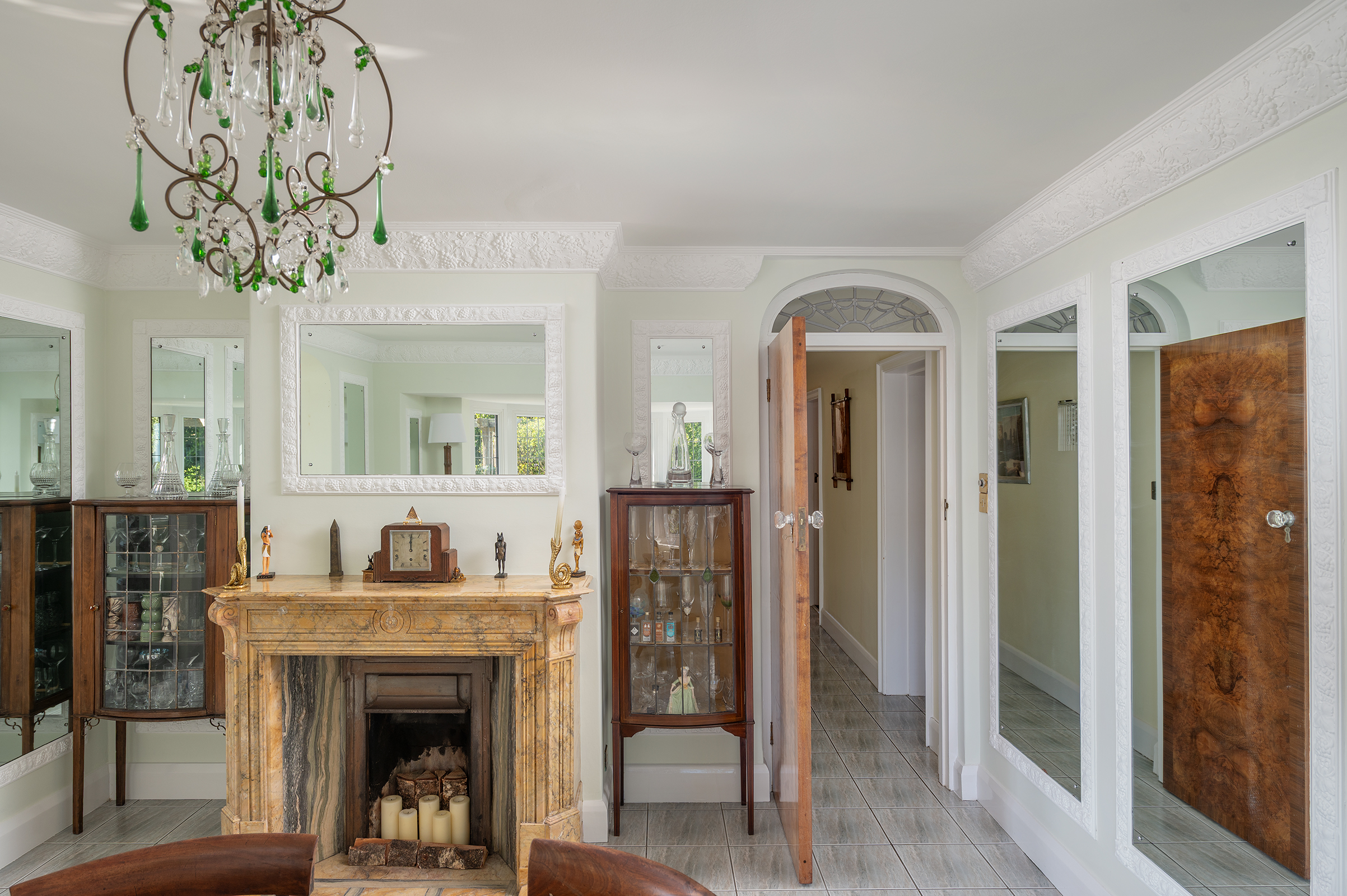 The Sun Room offers a gentler rhythm, a place for unhurried mornings where the changing seasons are felt rather than observed. Between the Drawing Room and Dining Room, a connecting walkway has been thoughtfully arranged as a Bar Area, perfectly placed for mixing a drink and pausing to admire the views before dinner. The Dining Room itself is both elegant and atmospheric, with mirrored walls, a marble fireplace and a bay window overlooking the sunken Rose Garden, lending itself to long, convivial evenings.
