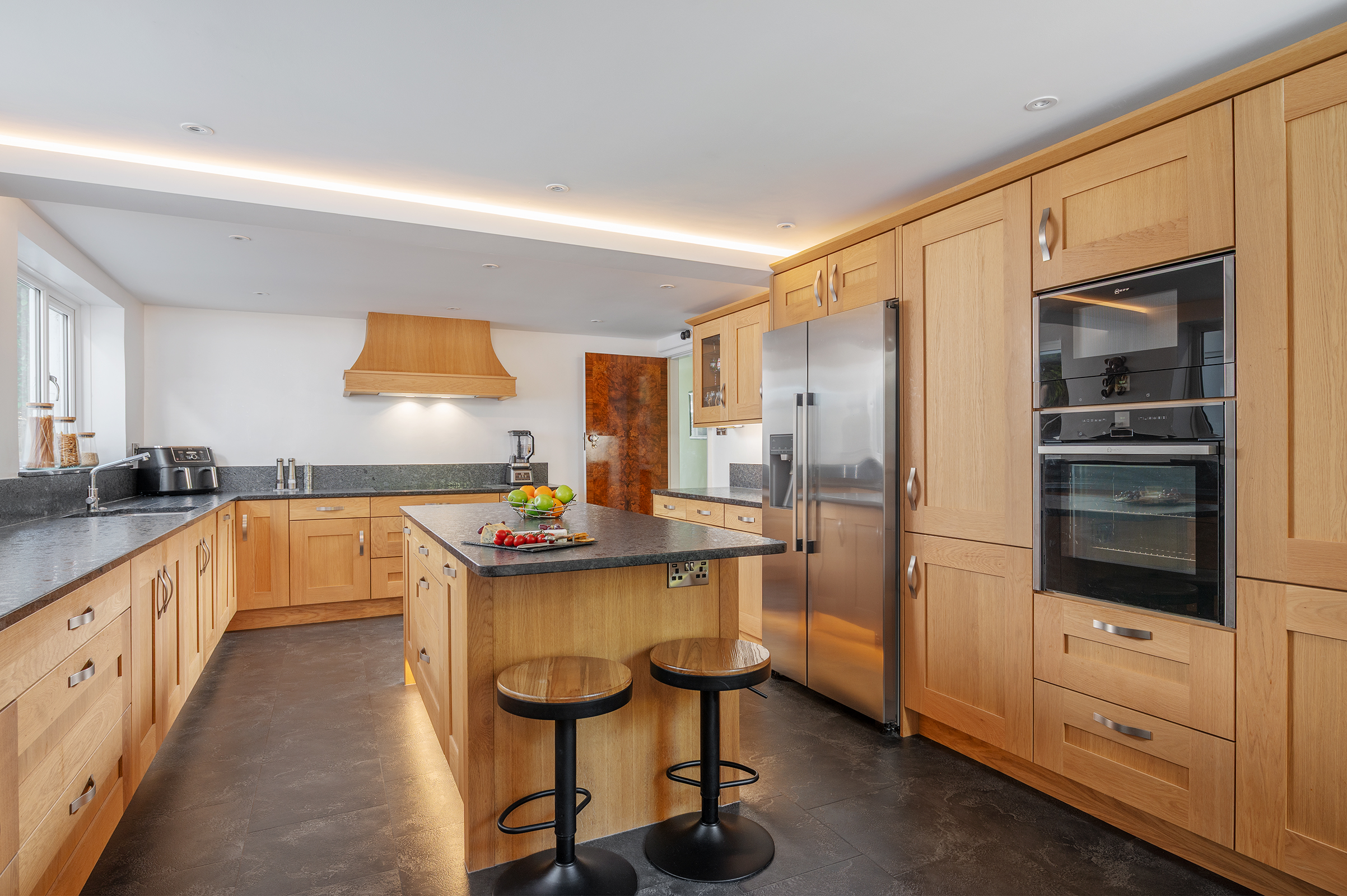 The Kitchen is both generous and purposeful, centred around a substantial island that invites both preparation and gathering. Crafted oak cabinetry provides warmth and depth, complemented by stylish leather-effect black granite work surfaces that lend a subtle sense of weight and refinement. Two large windows draw in an abundance of natural light, illuminating the space throughout the day. An adjacent Wine Cellar adds a quietly indulgent touch, while the equally well-proportioned Utility Room ensures that practicalities are handled with the same care as the principal spaces.