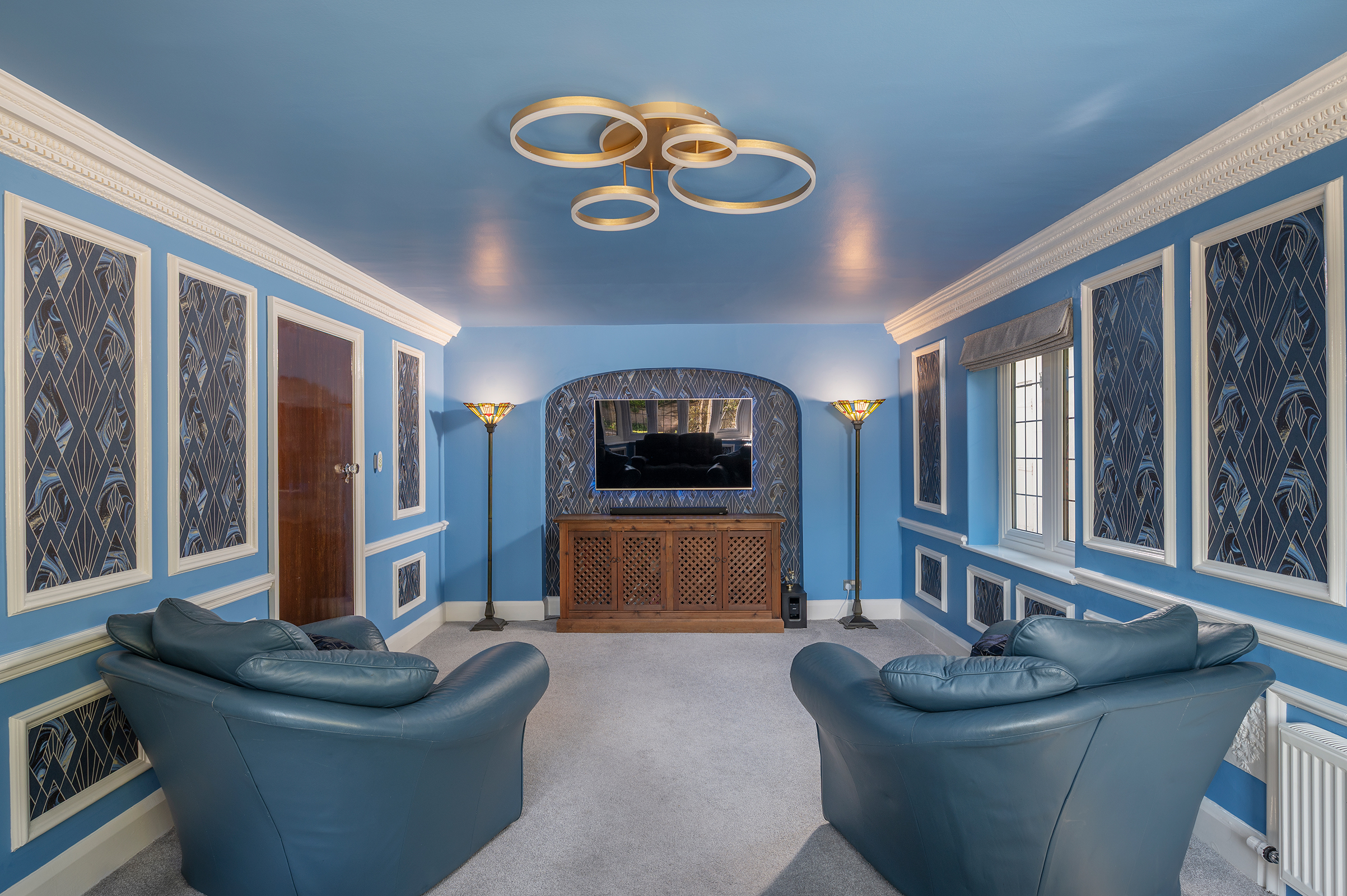 Beyond, the cinema room offers a richly intimate retreat, a cocooned space designed for immersive viewing, whether for quiet nights in or relaxed gatherings with family and friends.