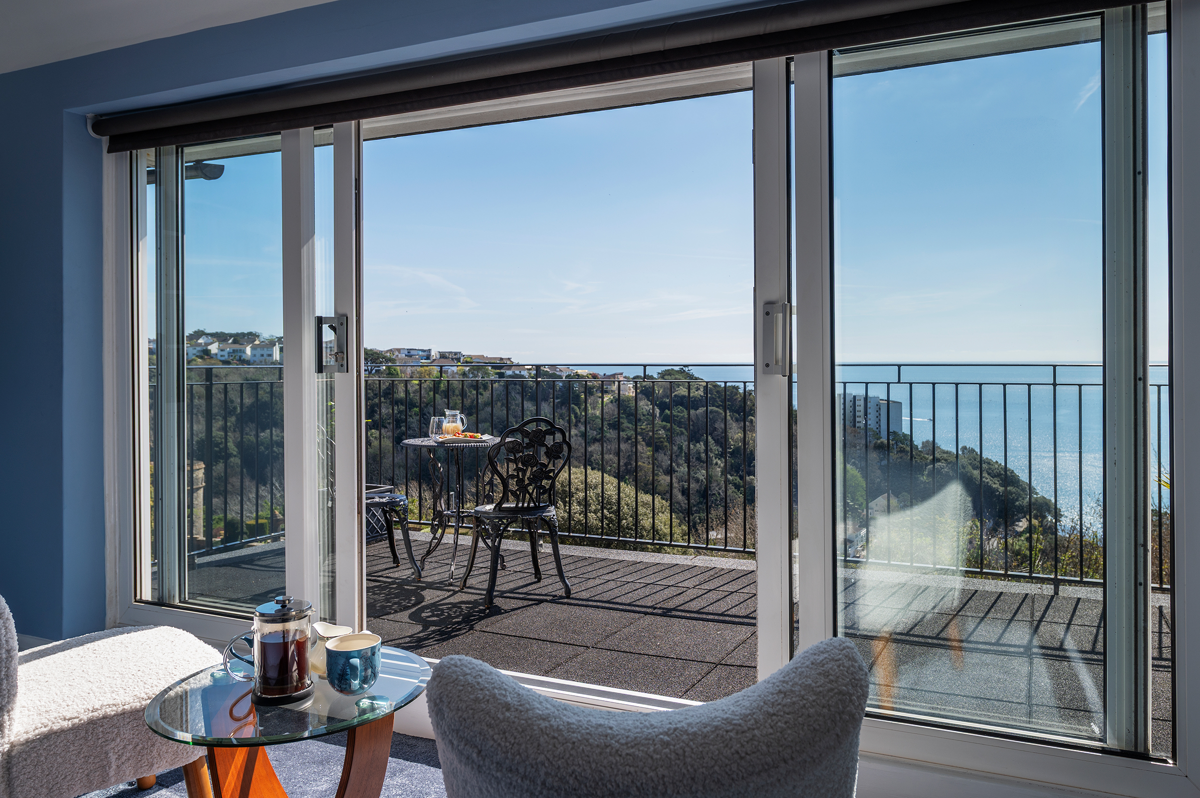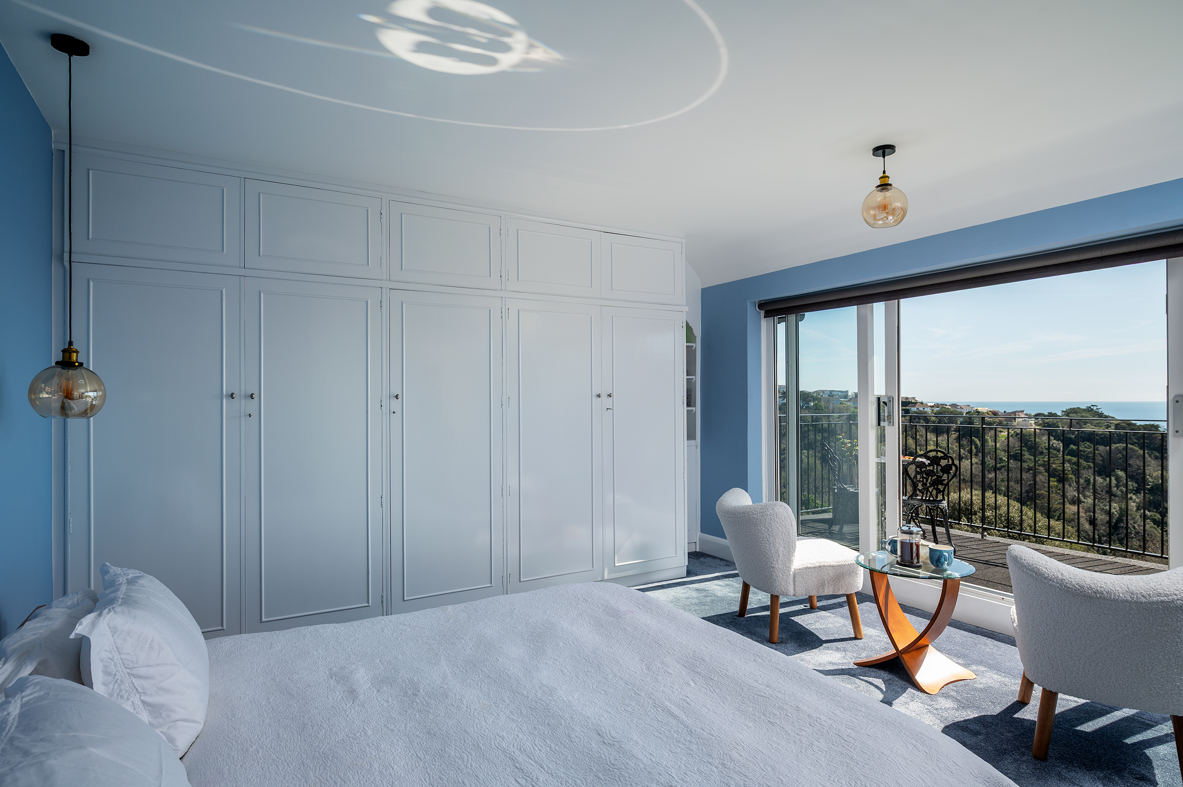 The Principal Bedroom opens wide to a private Balcony, its sliding doors framing uninterrupted sea views. The accompanying En Suite is notable for its finish and proportion, creating a space that feels both indulgent and composed.