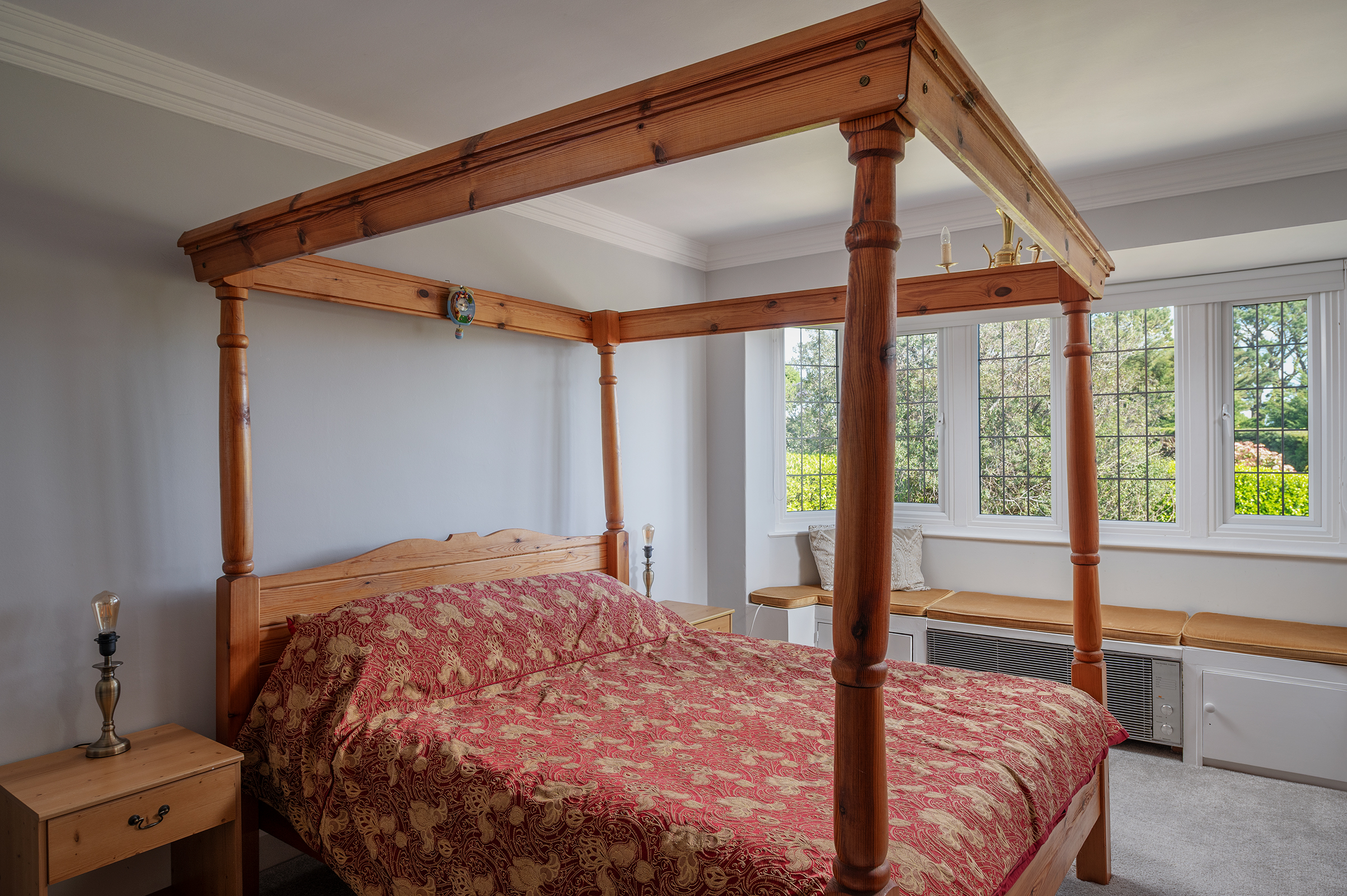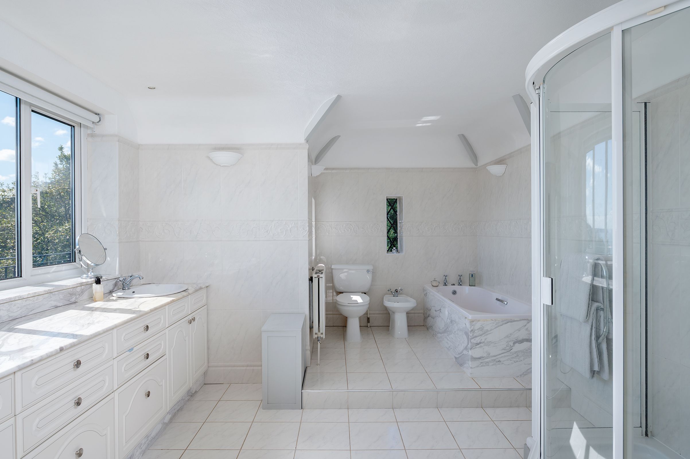A second Bedroom enjoys its own Balcony access and dual aspects, while a third Bedroom looks out across the Gardens through distinctive mullioned windows. A fourth room, currently arranged as a Study, offers flexibility. The Family Bathroom is a particular highlight, its elevated bath positioned to take in the view, complemented by original mosaic tiling that speaks quietly of the home’s heritage.