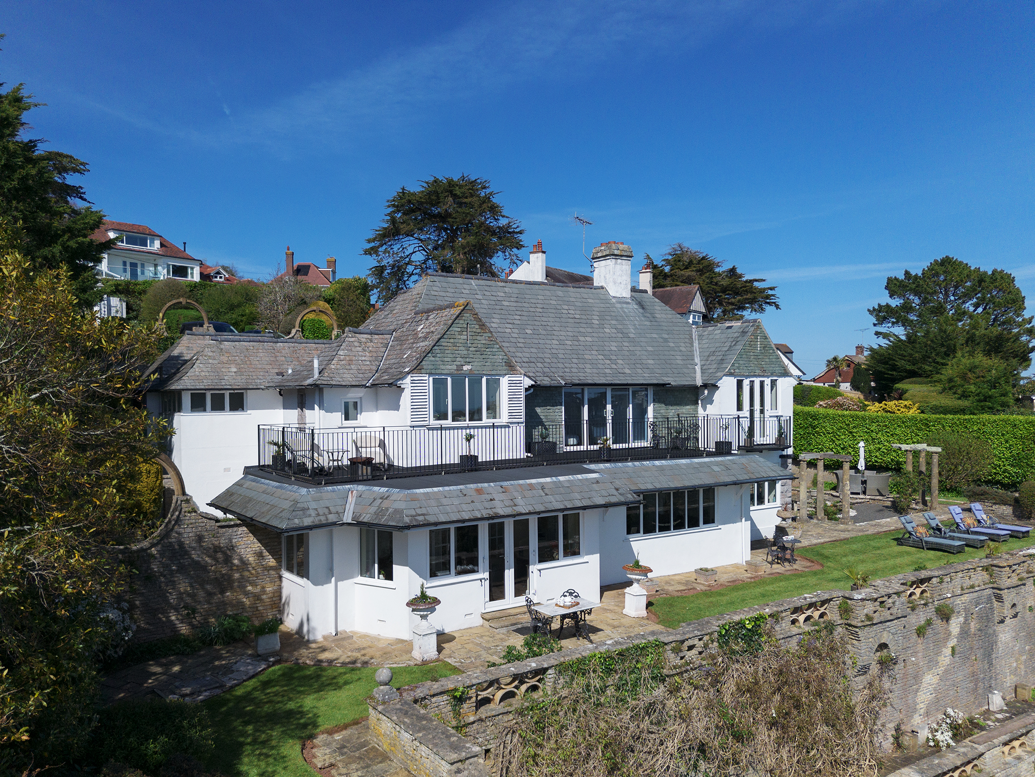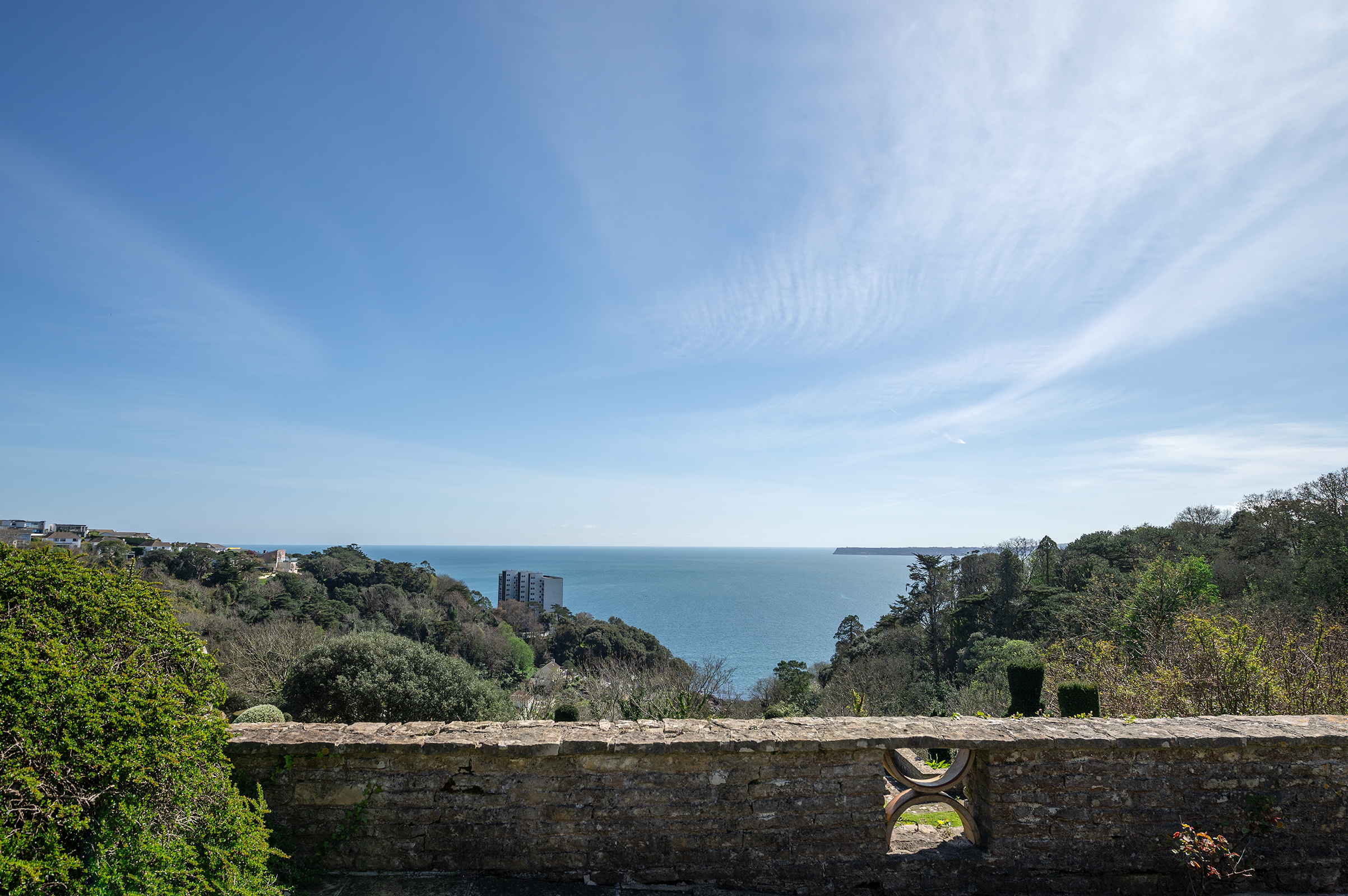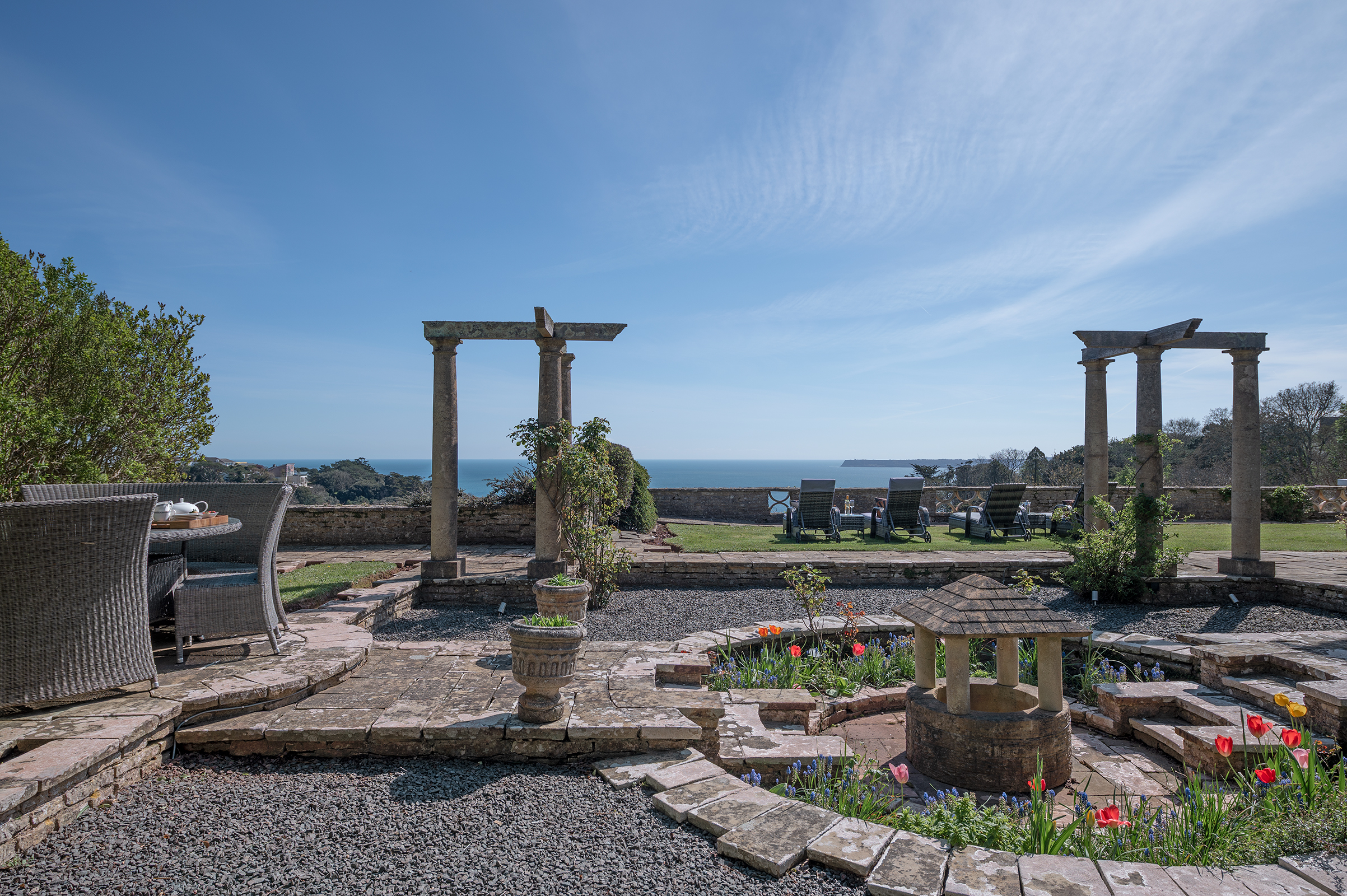 The Grounds are as thoughtfully conceived as the house itself. Influences reminiscent of Edwin Lutyens are evident in the structure and flow of the gardens, where Terraces and Seating Areas are carefully placed to capture different aspects of the coastline. A recurring circular motif, characteristic of the Arts and Crafts movement and rooted in Gothic revival tradition, weaves quietly through the landscape, lending a sense of rhythm, harmony and connection. This considered geometry continues to shape the experience of the gardens today, where careful stewardship has ensured that the planting and design remain in quiet accord with the house and its wider setting.
