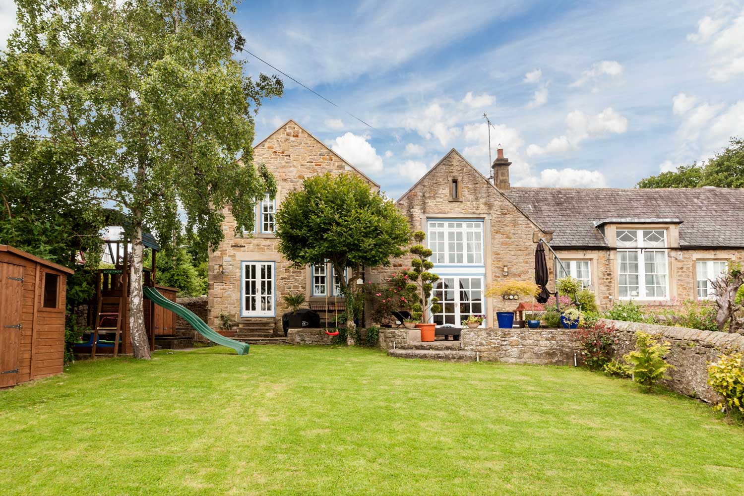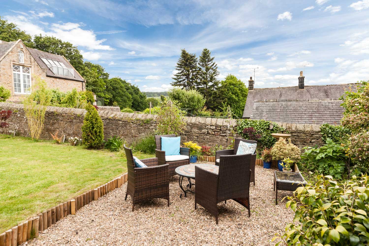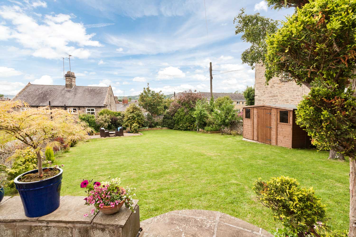 To the rear is a generous single garage with space for a car and additional storage, together with private parking. A gate leads into the paved courtyard, designed with raised stone borders and discreet bin storage. The principal gardens extend west of the house and are enclosed by traditional stone walling, with a pedestrian gate providing access into the village. A stone-flagged terrace rises to a raised patio area, while steps lead down to the main lawn, a sunny and sheltered space with well-stocked borders.