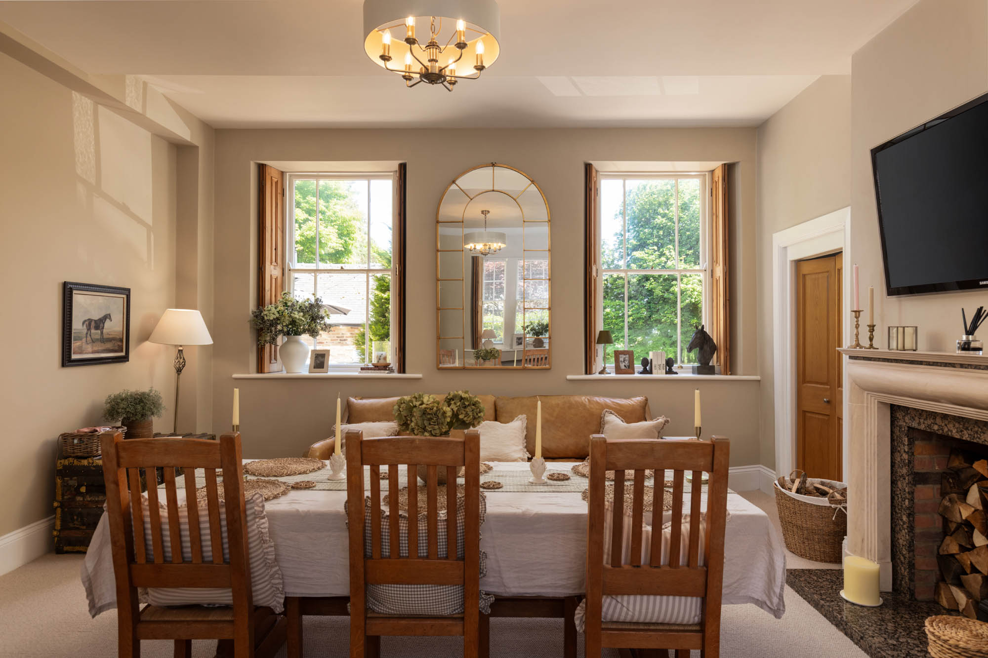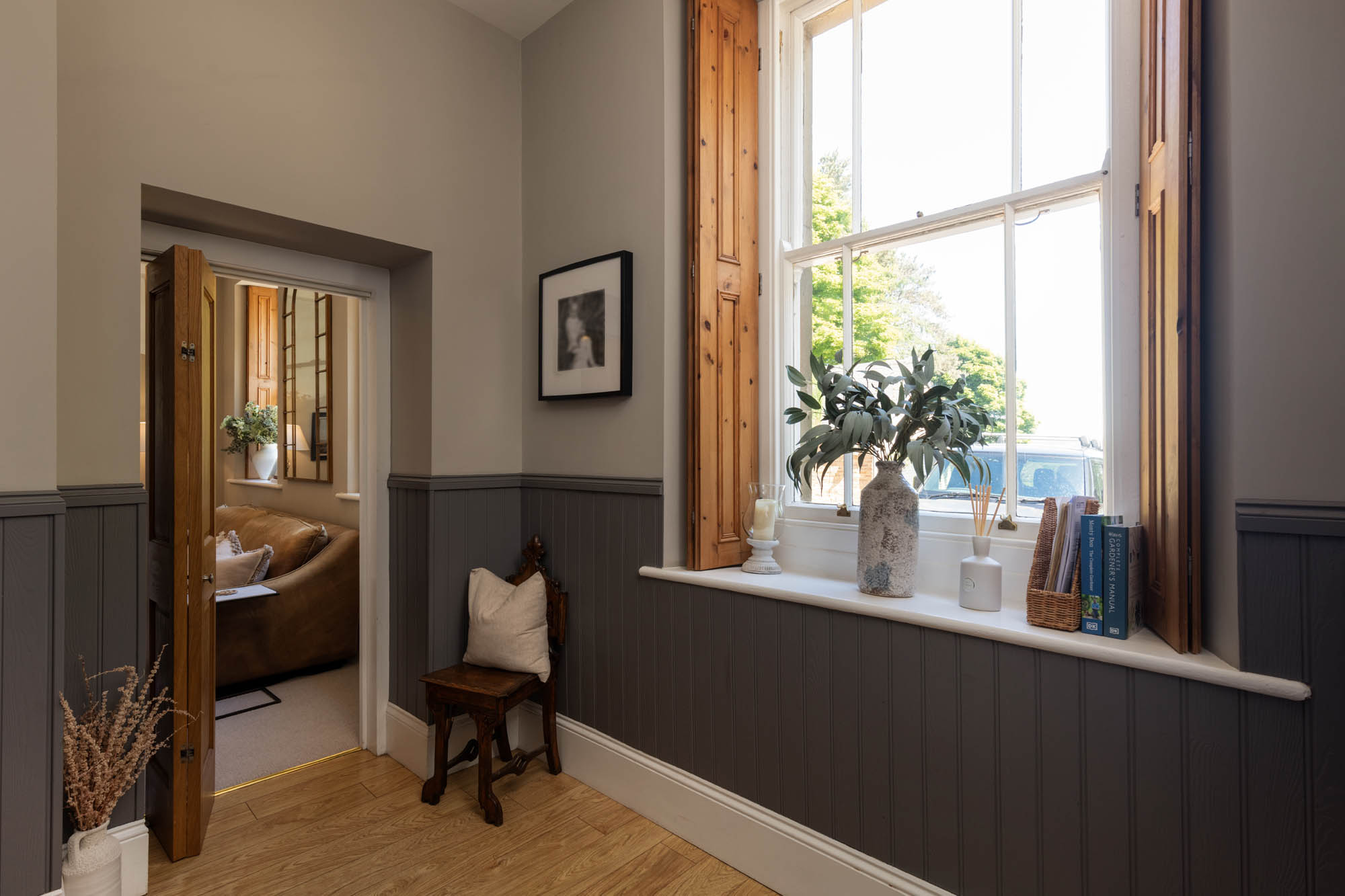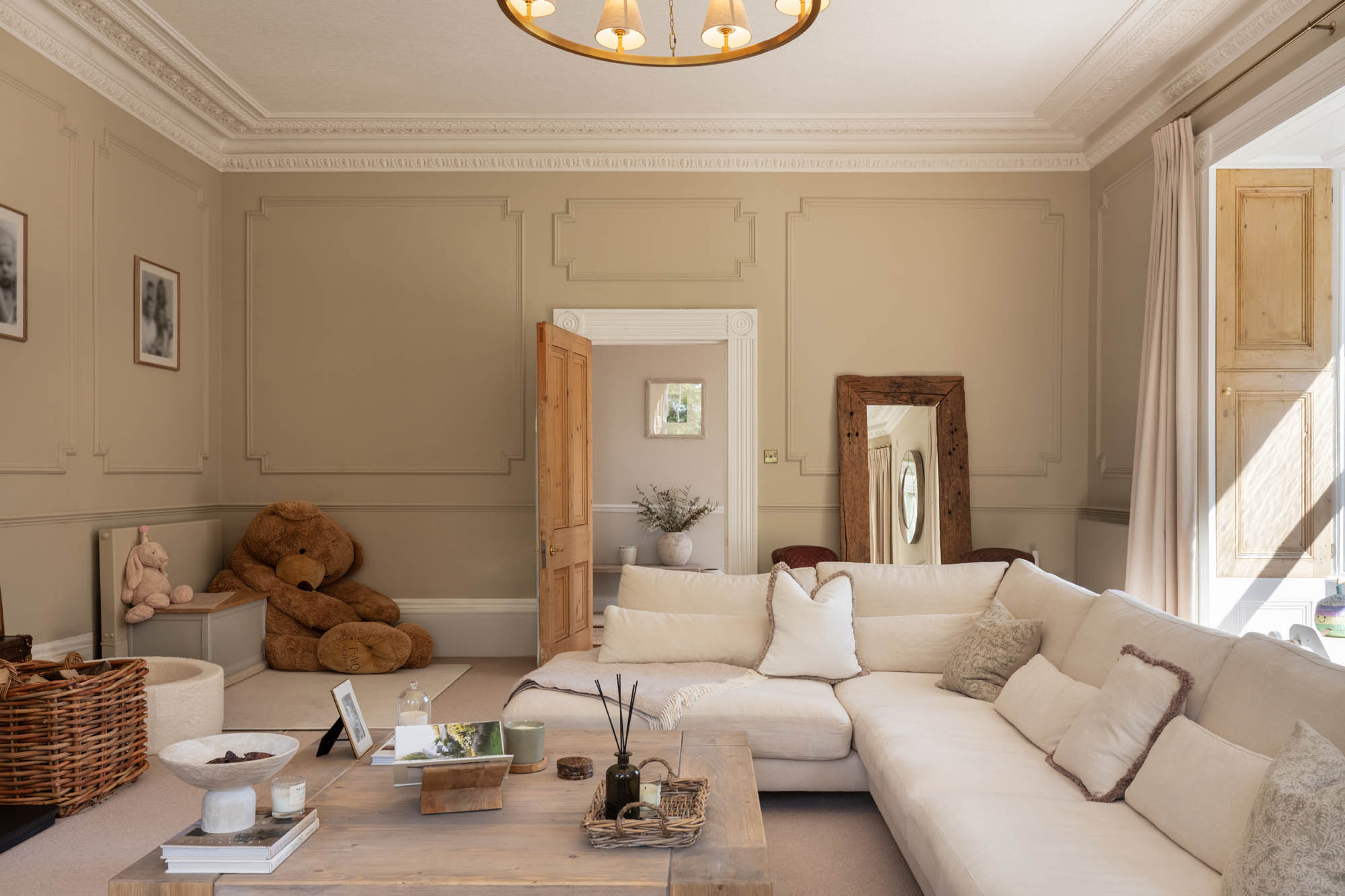 Believed to date from the early-to-mid 1800s, the house retains a wealth of original architectural detail—deep sash windows with working shutters, ornate ceiling cornices, and stone fireplaces with carved surrounds, while the interior has been extensively renovated in recent years to create a comfortable and highly individual family home. A restrained, natural palette ties the spaces together, allowing the scale and character of the rooms to take focus.