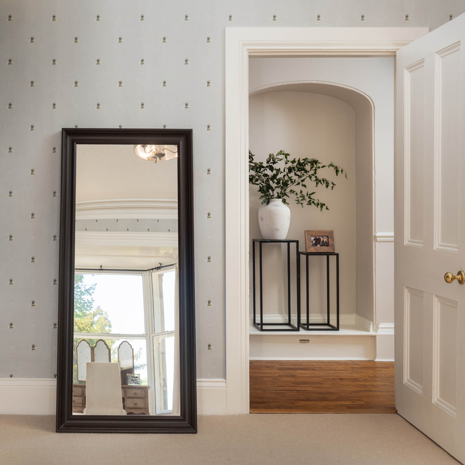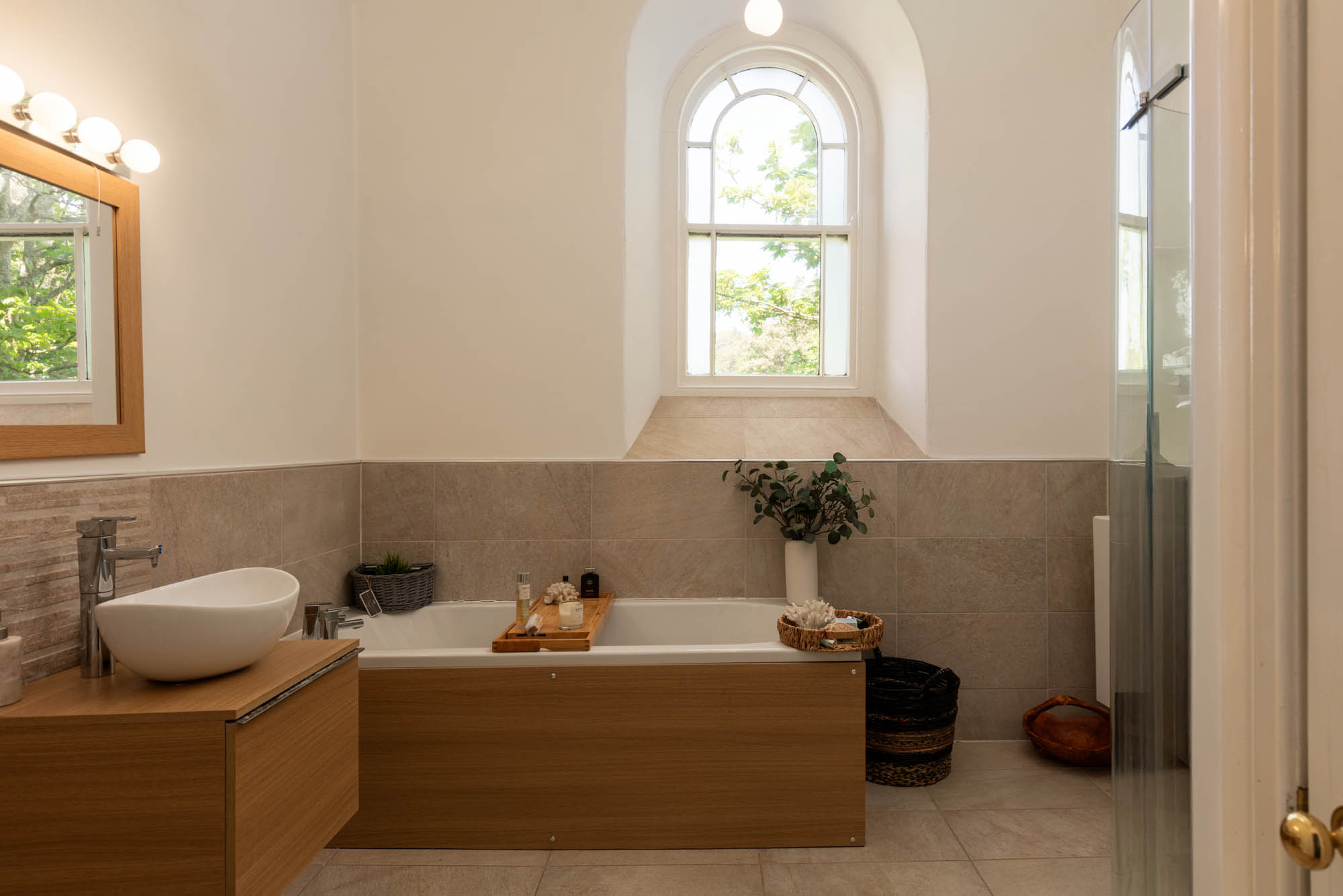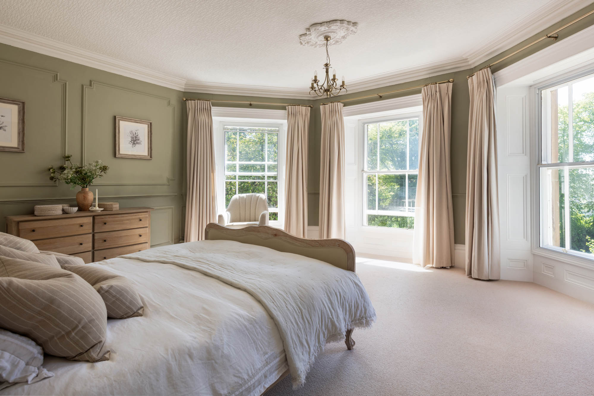 The first floor offers four bedrooms arranged off a central landing. Arch windows and tall ceilings give these rooms a distinctive stately aesthetic. Decorated in tasteful, muted tones, the principal bedroom is elegantly composed with panel moulding, and three large sash windows providing ample light. A potential fifth bedroom is currently configured as a walk-through dressing room, leading to a generous en-suite complete with bathtub, separate shower, and vanity unit. A further bathroom serves the remaining bedrooms.