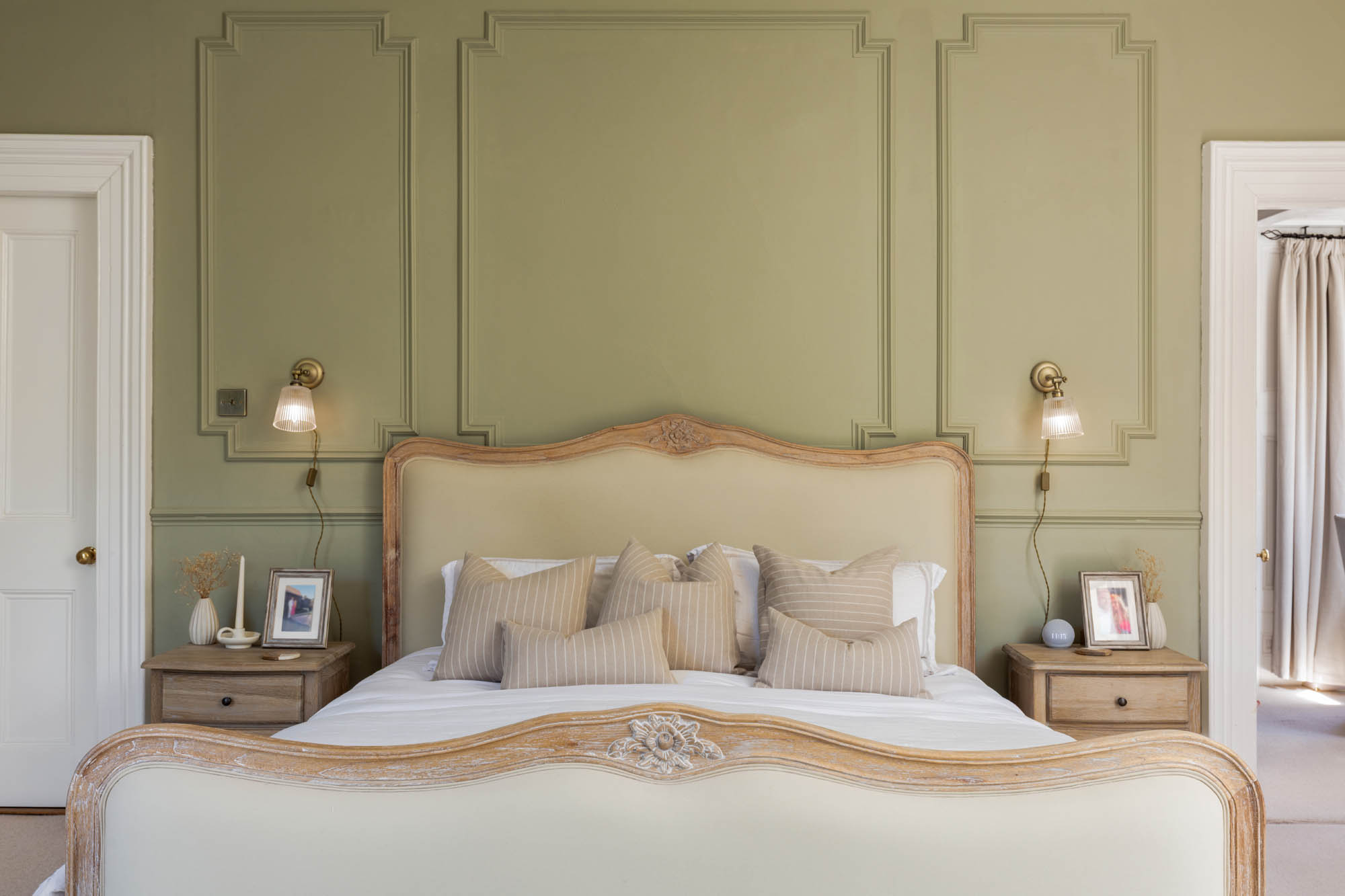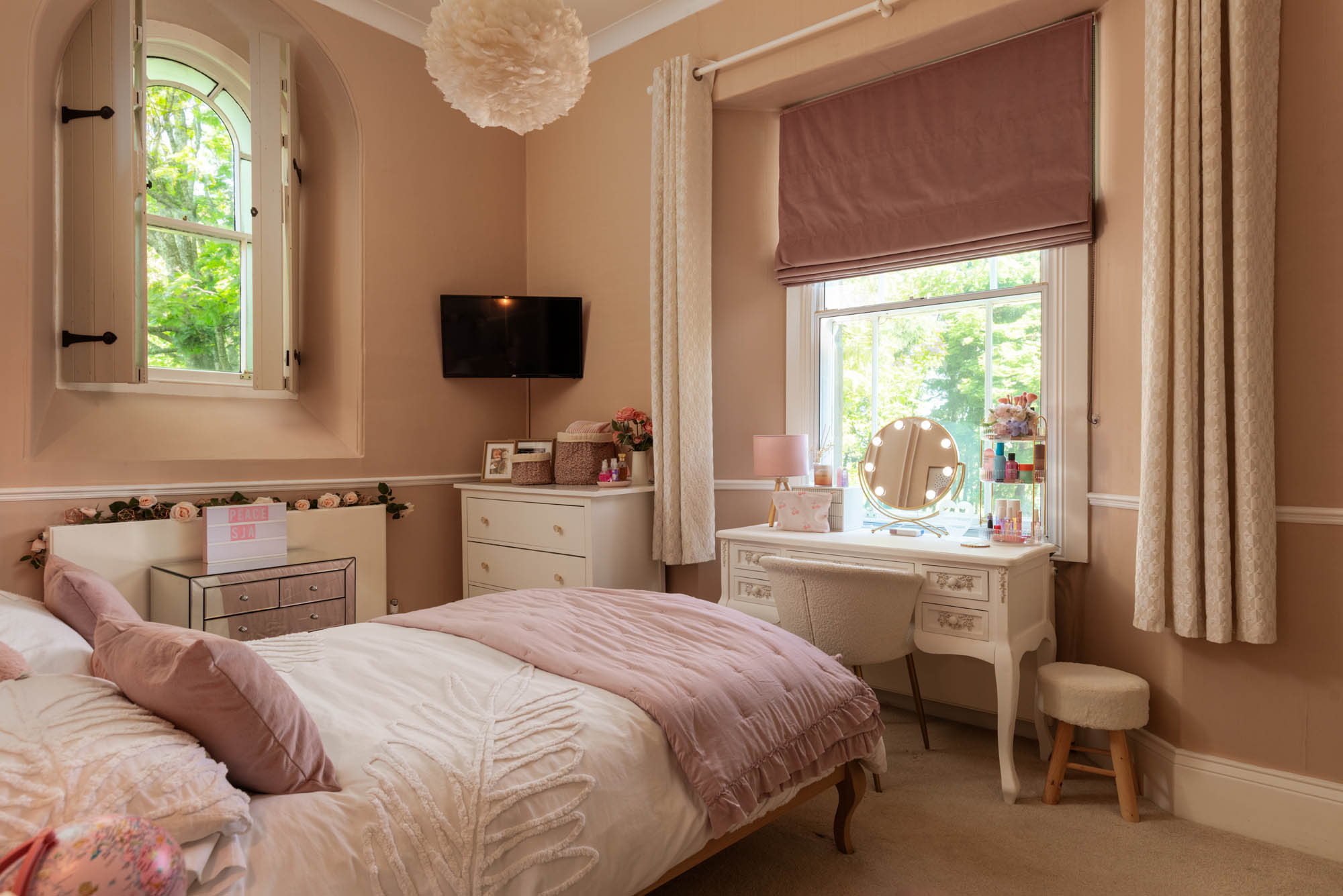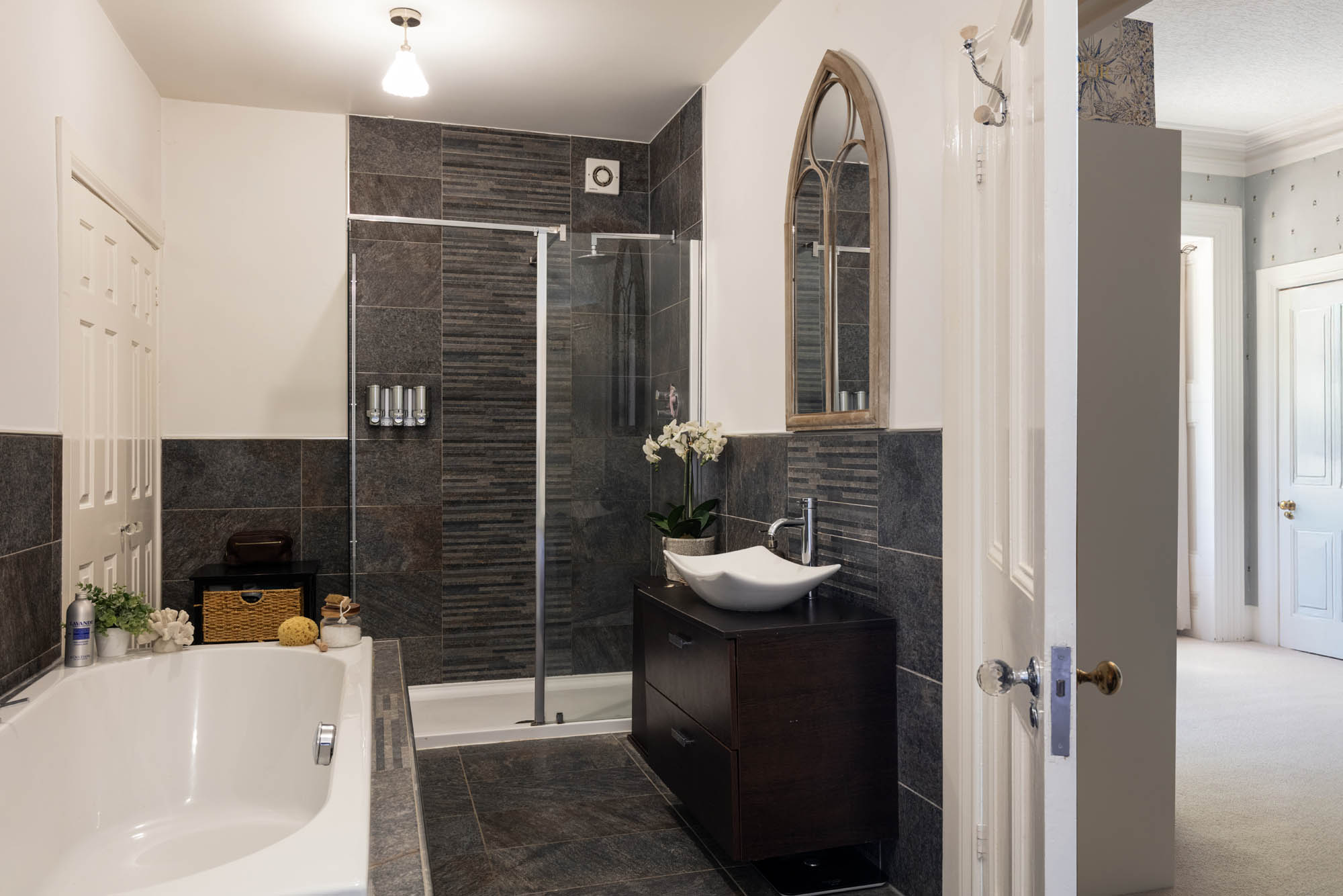 The first floor offers four bedrooms arranged off a central landing. Arch windows and tall ceilings give these rooms a distinctive stately aesthetic. Decorated in tasteful, muted tones, the principal bedroom is elegantly composed with panel moulding, and three large sash windows providing ample light. A potential fifth bedroom is currently configured as a walk-through dressing room, leading to a generous en-suite complete with bathtub, separate shower, and vanity unit. A further bathroom serves the remaining bedrooms.
