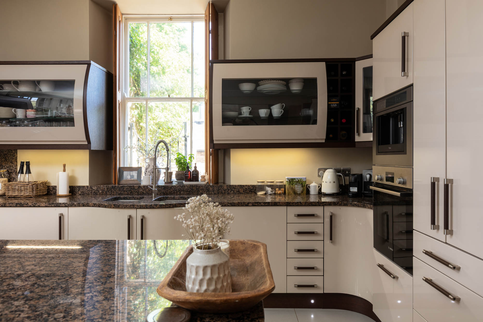 Fitted with sleek white cabinetry, curved granite worktops and a full suite of integrated appliances—including Bosch oven, Miele dishwasher, full-height fridge and freezer, and Whirlpool coffee machine—the kitchen is contemporary in feel and function. Beyond, a rear hallway leads to the utility and WC – completing the ground floor.