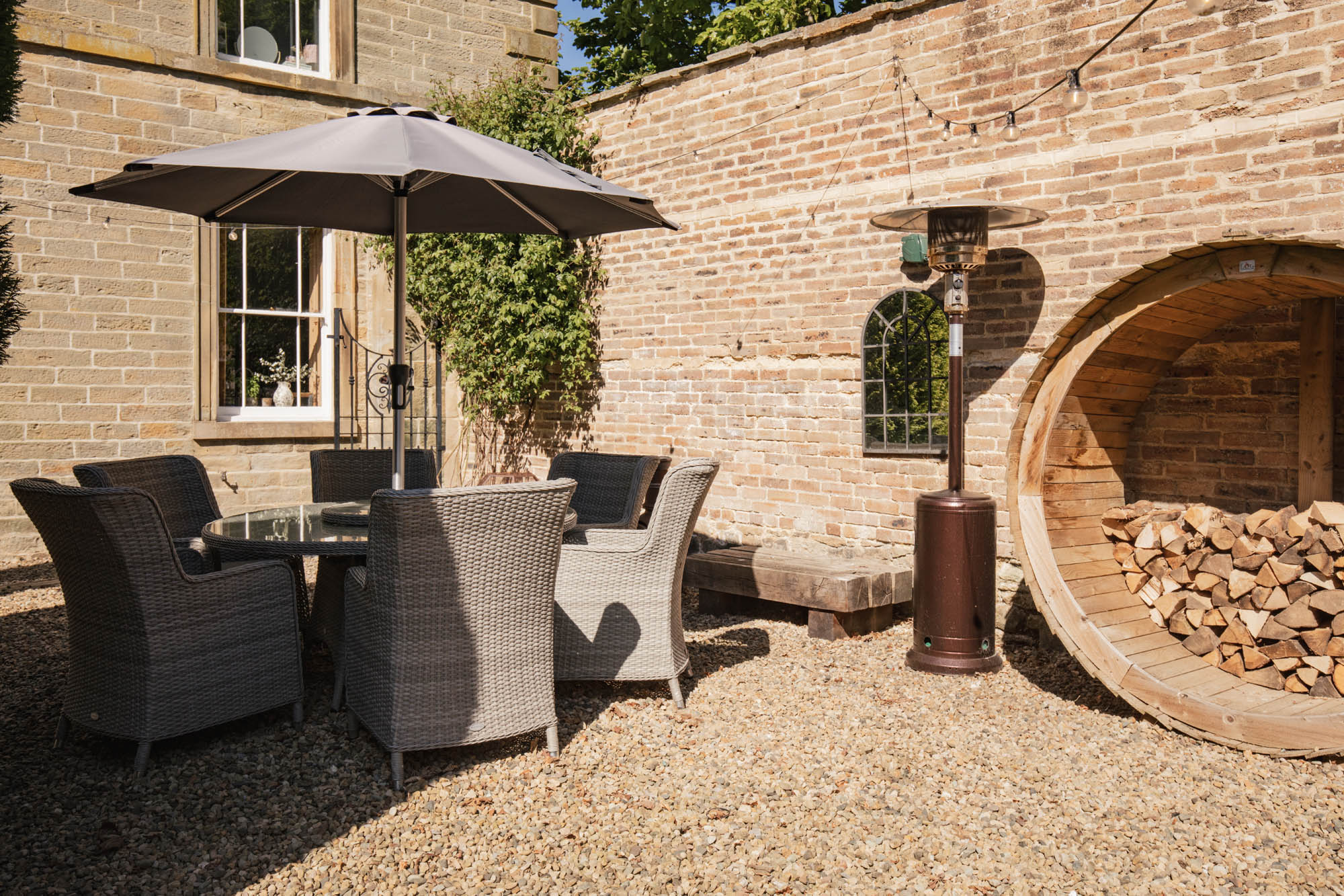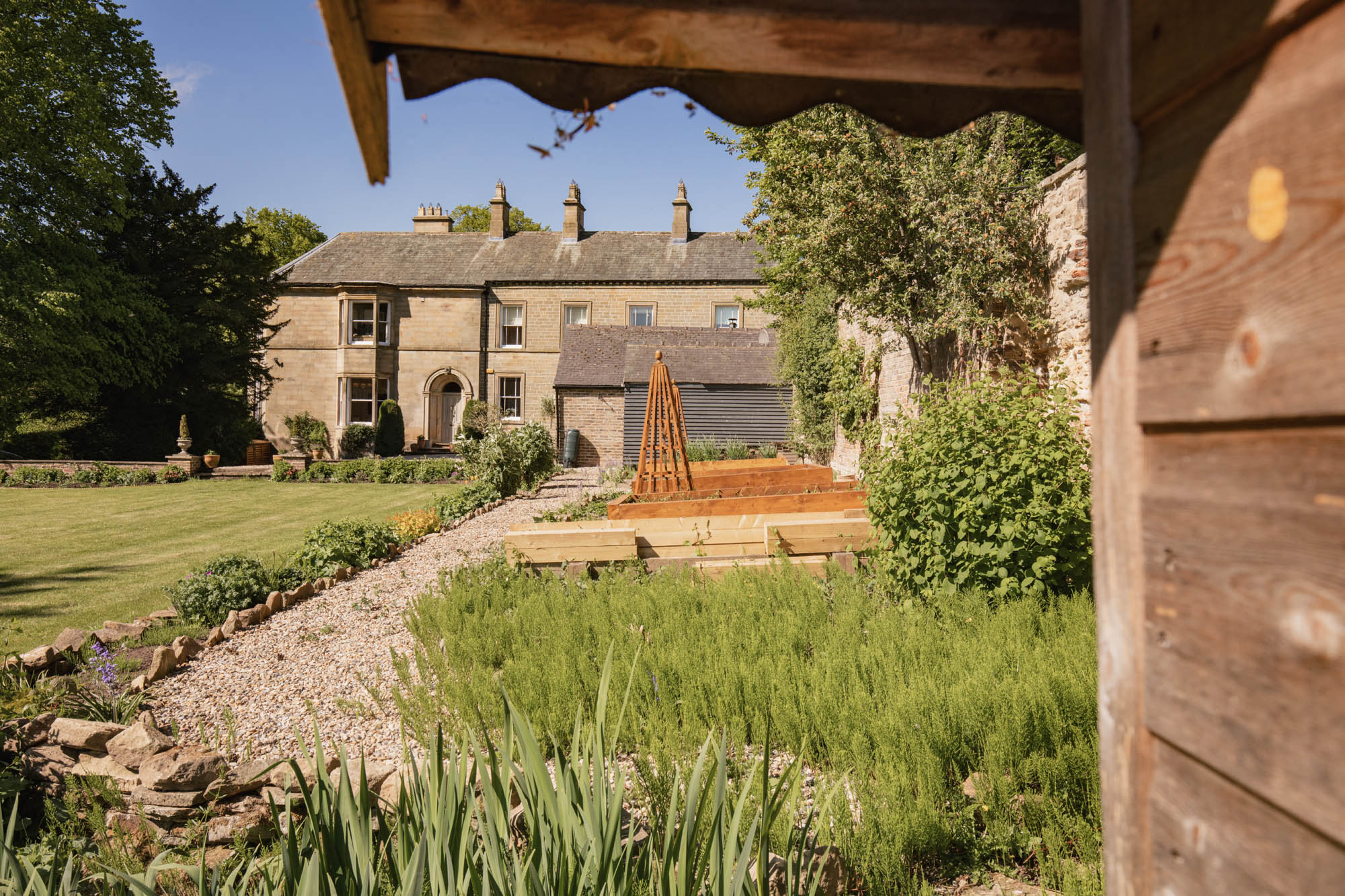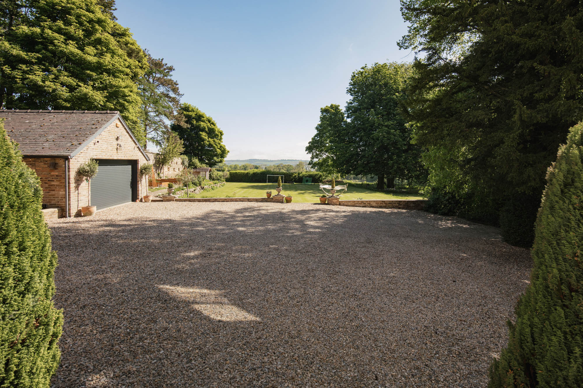The house stands in around an acre of grounds, with a broad gravel drive providing ample parking to the front. To one side, a gravelled dining terrace sits against a backdrop of mature borders, while a lawned area extends towards a small section of woodland. A detached outbuilding currently houses a gym and store, and beyond, the original kitchen garden walls border a productive area with a greenhouse, fruit trees and raised beds.