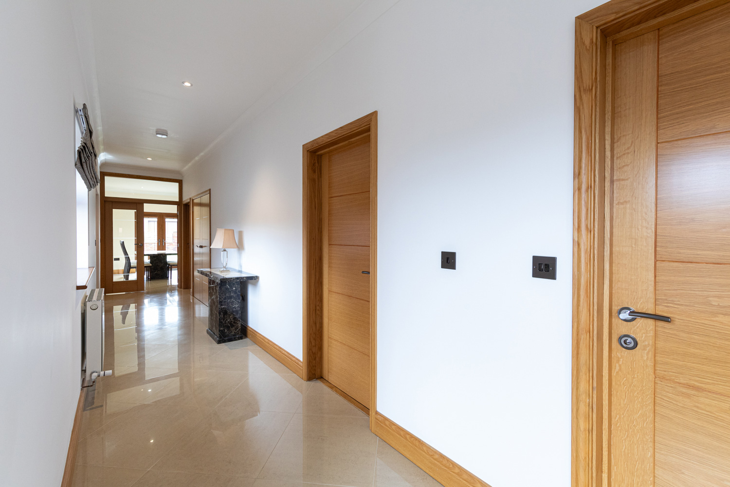 One long, continuous hallway connects the living areas and accommodations of Croftfield. Porcelain floor tiles feature throughout the hallway, extending into a well-appointed kitchen featuring premium granite countertops, an elevated extractor fan, and a variety of high-quality appliances. Adjacent to the kitchen, the dining area boasts French doors that lead directly to the garden.