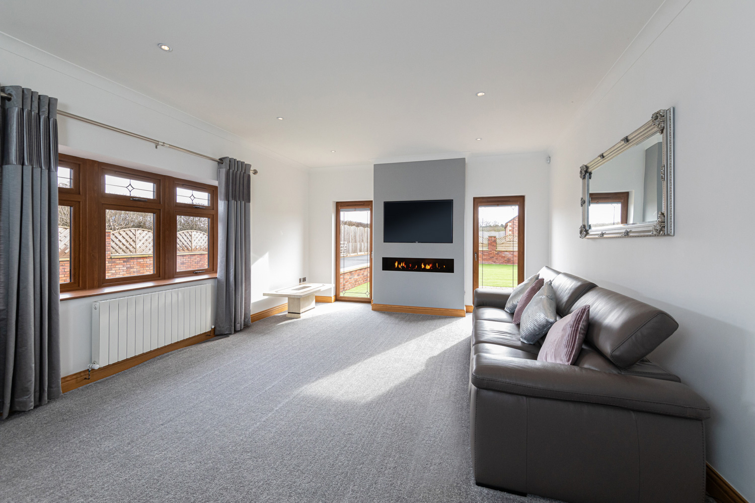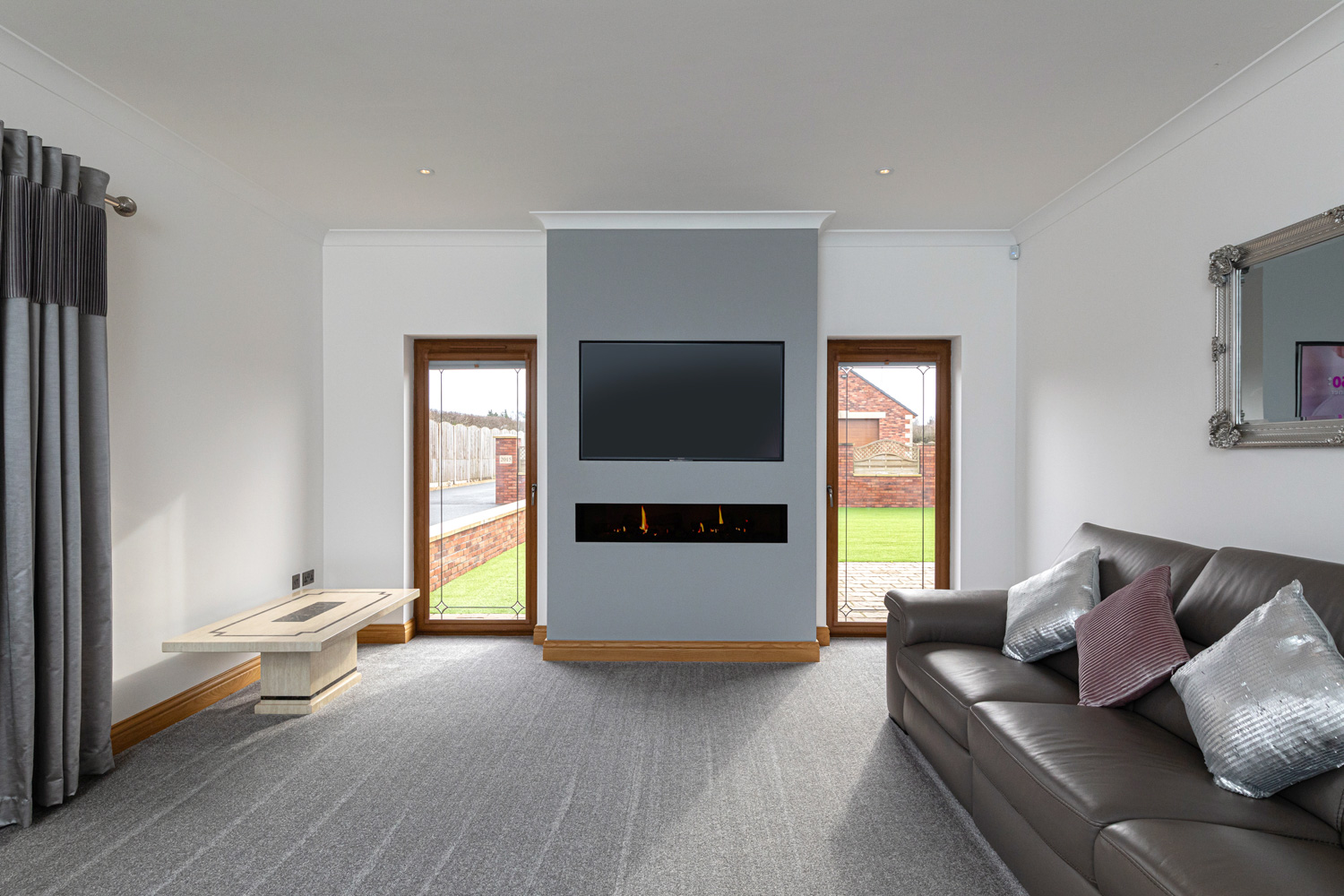 The living room is comfortably sized and features a media wall with an integrated television and an electric fire. Glass doors on either side lead to the garden. For added convenience, the home includes a generously sized utility room equipped with a modern washer/dryer.