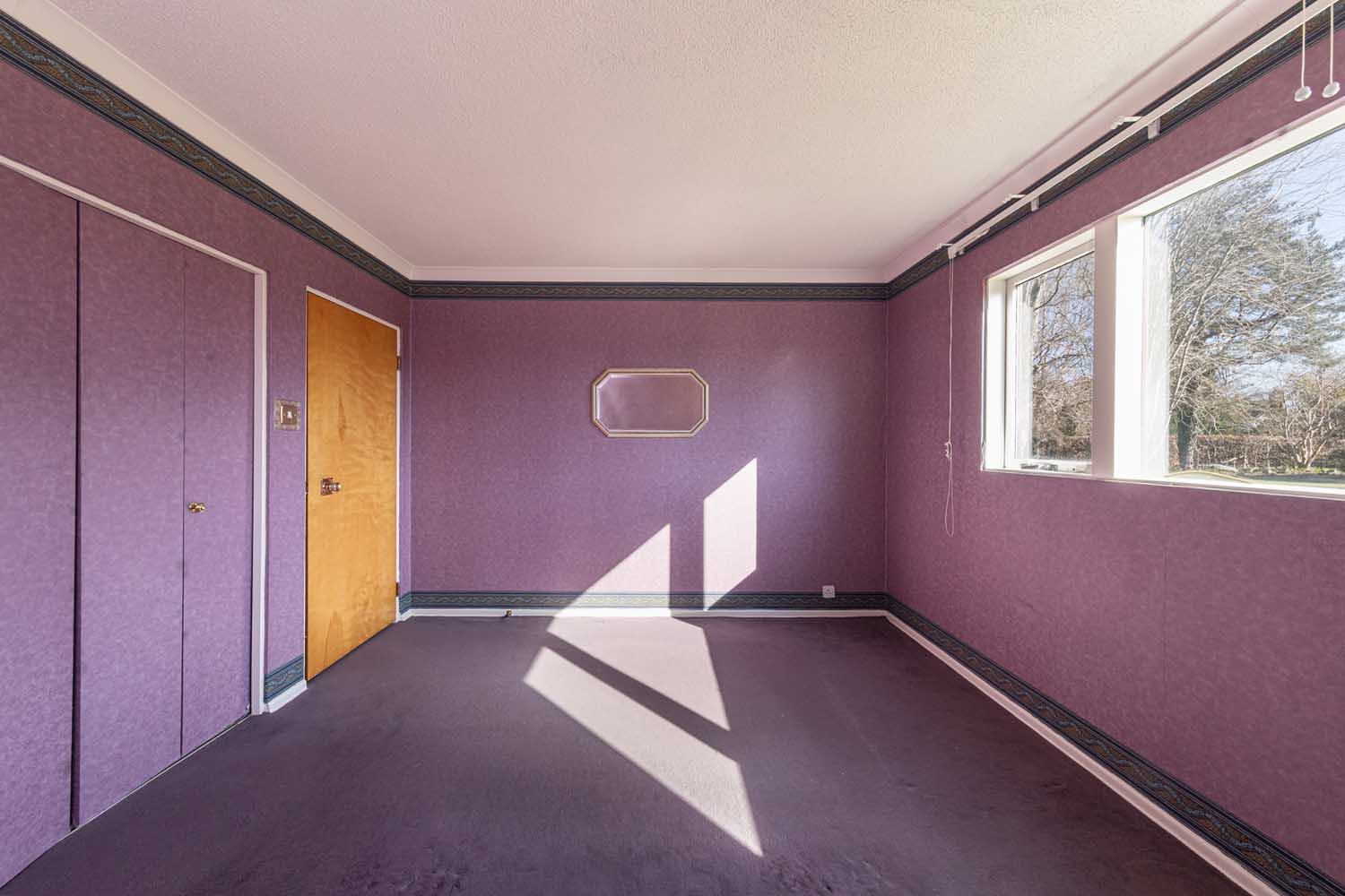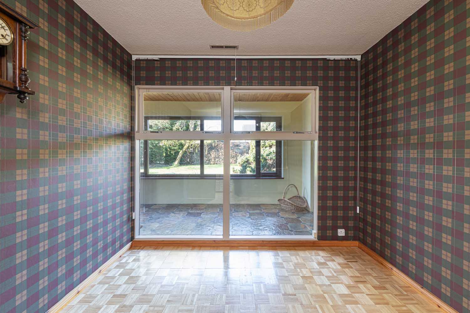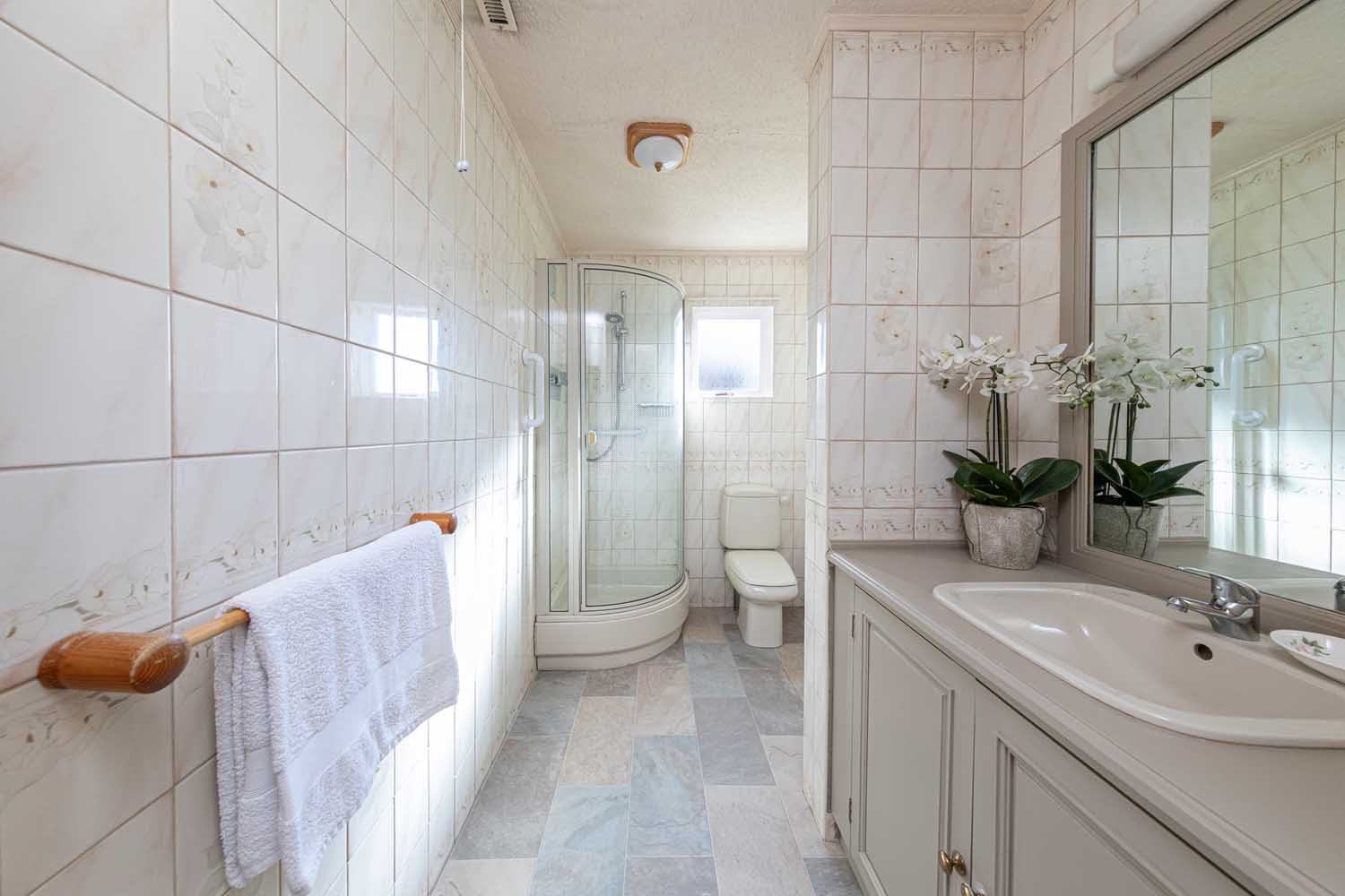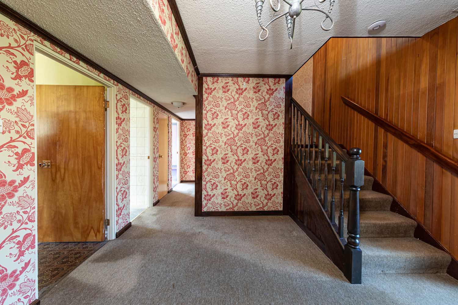 Downstairs, the entrance hall leads to four further bedrooms — including a substantial annexe bedroom of over 23 feet with en-suite — as well as a shower room, large utility room, and a bright garden room opening onto the lawn. While the interiors are dated throughout, the layout is highly versatile, and the house offers a compelling canvas for modernisation.