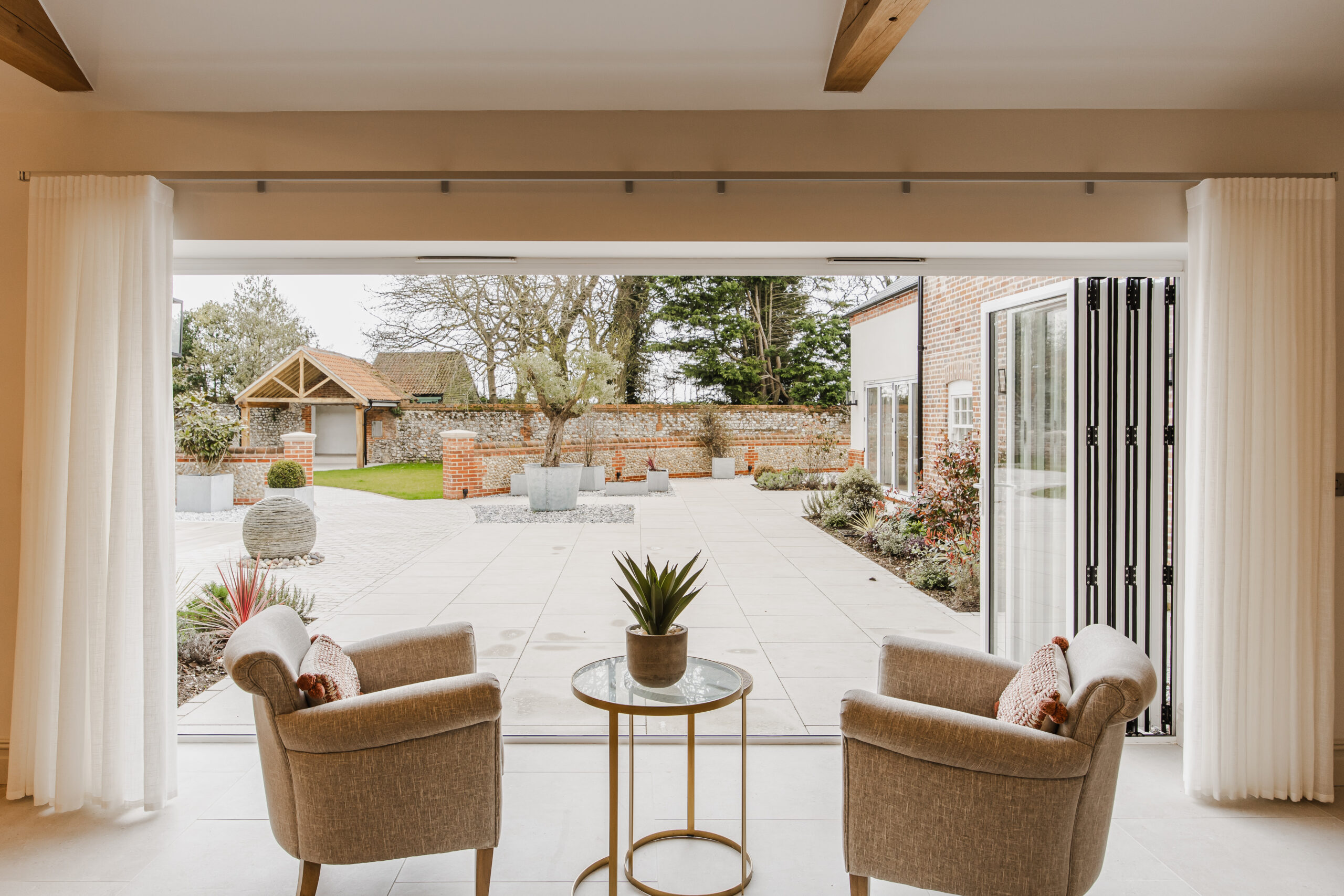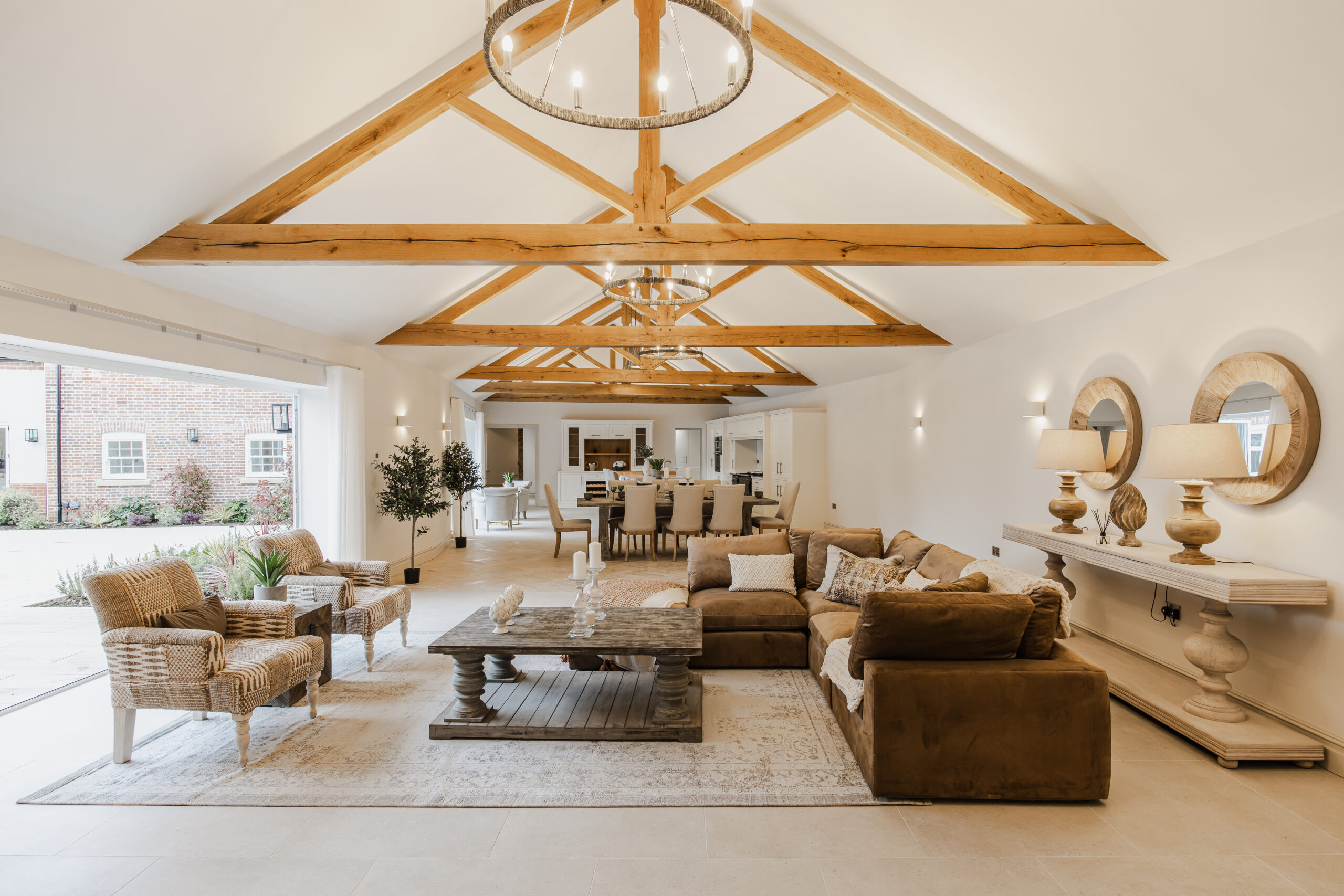 You are then through to what is most definitely the room that sets this house apart, the kitchen, dining and family room. With its vaulted ceiling and exposed beams, the sense of space is immediate, and it’s easy to picture everyone coming together here. It naturally divides into three areas: a beautifully fitted kitchen with extensive cupboards, generous worktops and a walk-in pantry, a central dining space for larger gatherings, and a seating area that comfortably accommodates multiple sofas. Two sets of bi-fold doors open onto the central courtyard, making this a space that works just as well in the summer months.