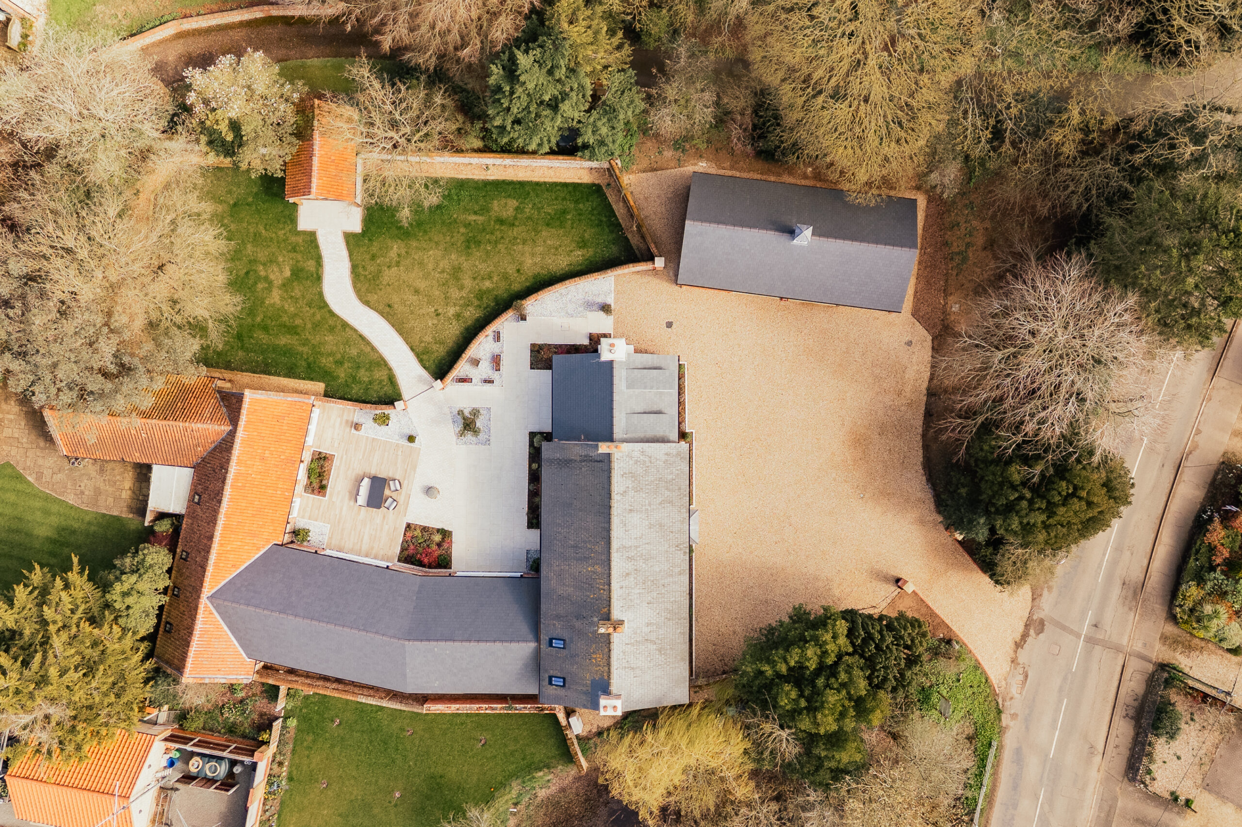 The house is now arranged in a U shape, with the original farmhouse at the front connected to the former stable block by a single-storey vaulted extension.
