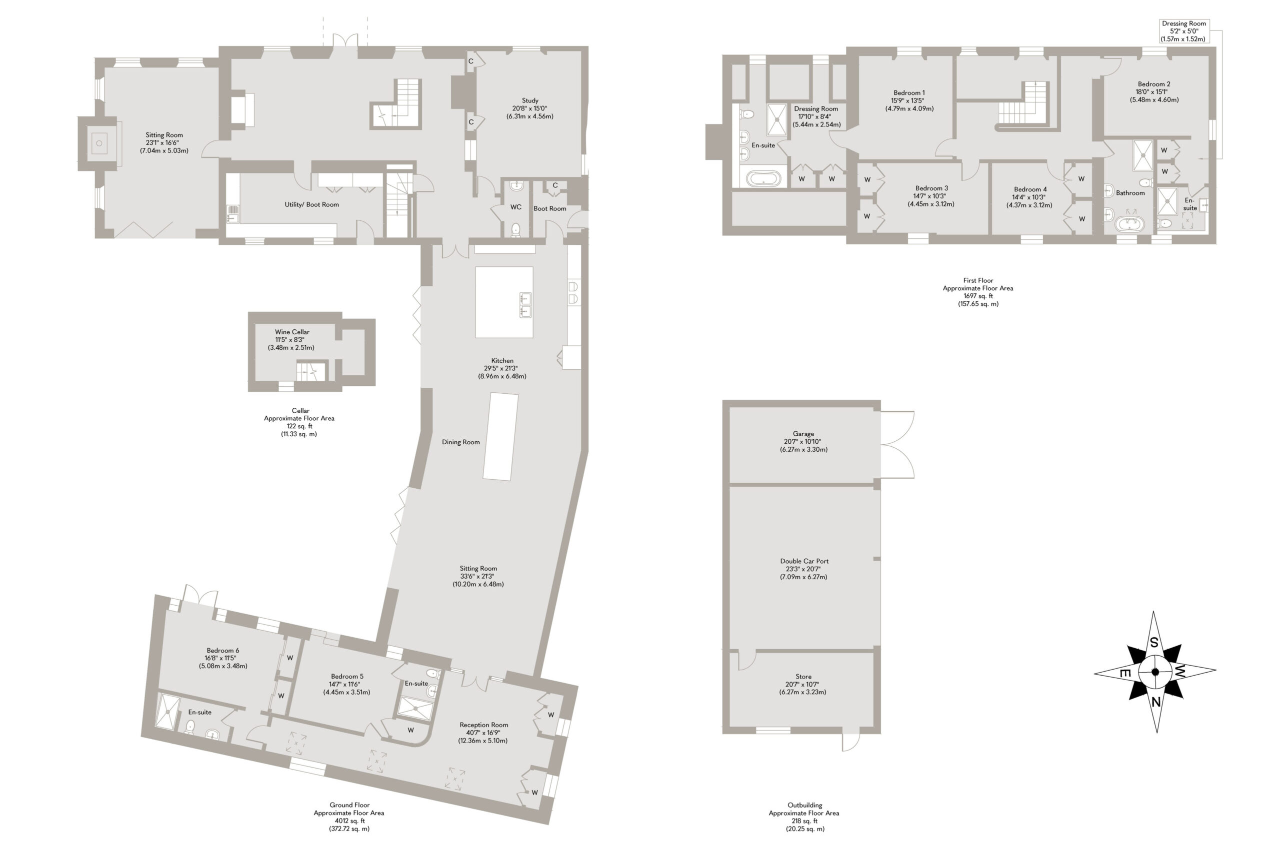 Back in the main house, a grand staircase leads to a galleried landing and four further double bedrooms. Two share a family bathroom, while the remaining two are generous suites with dressing rooms, the principal also benefiting from a bath and separate double shower.