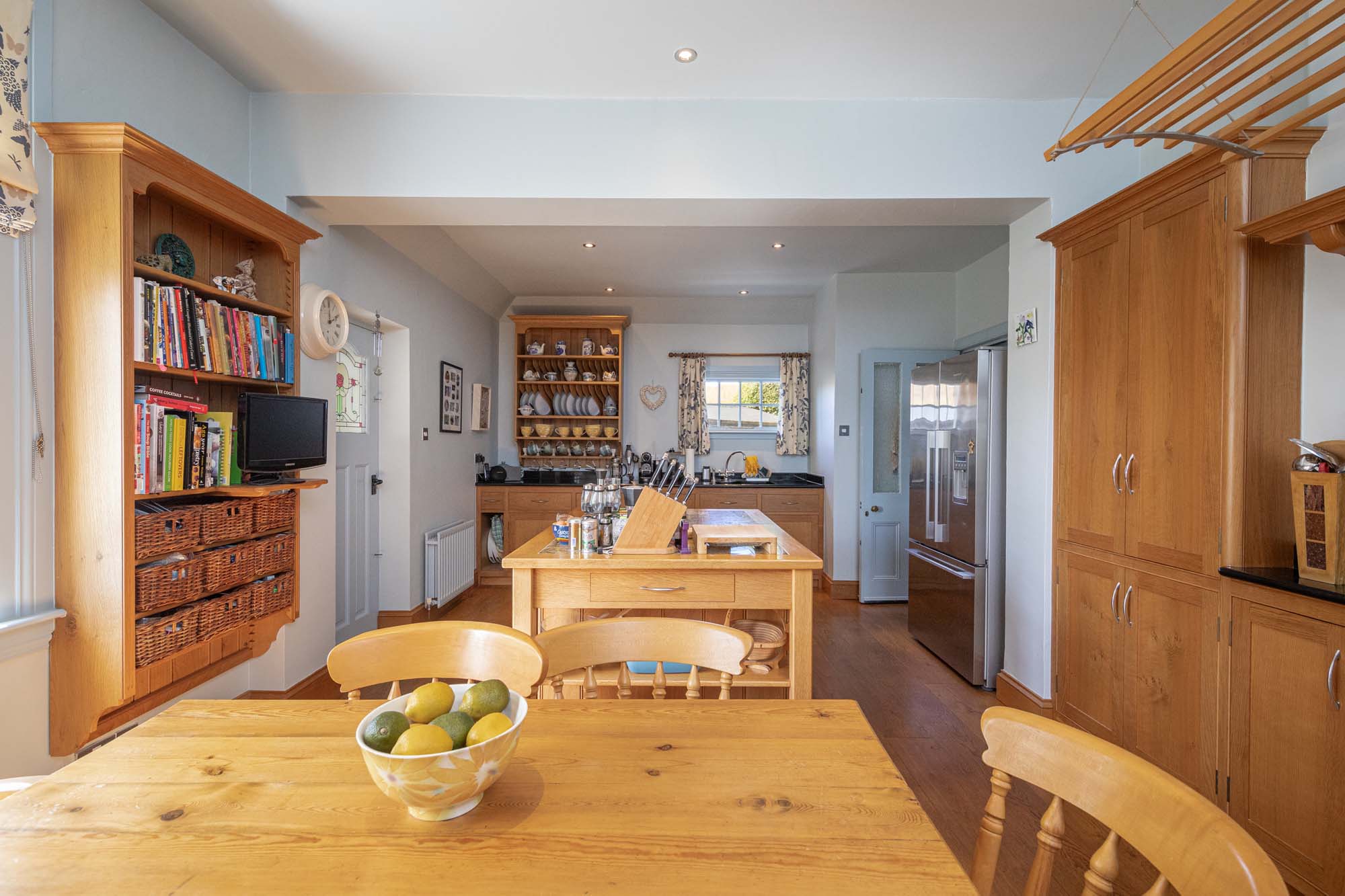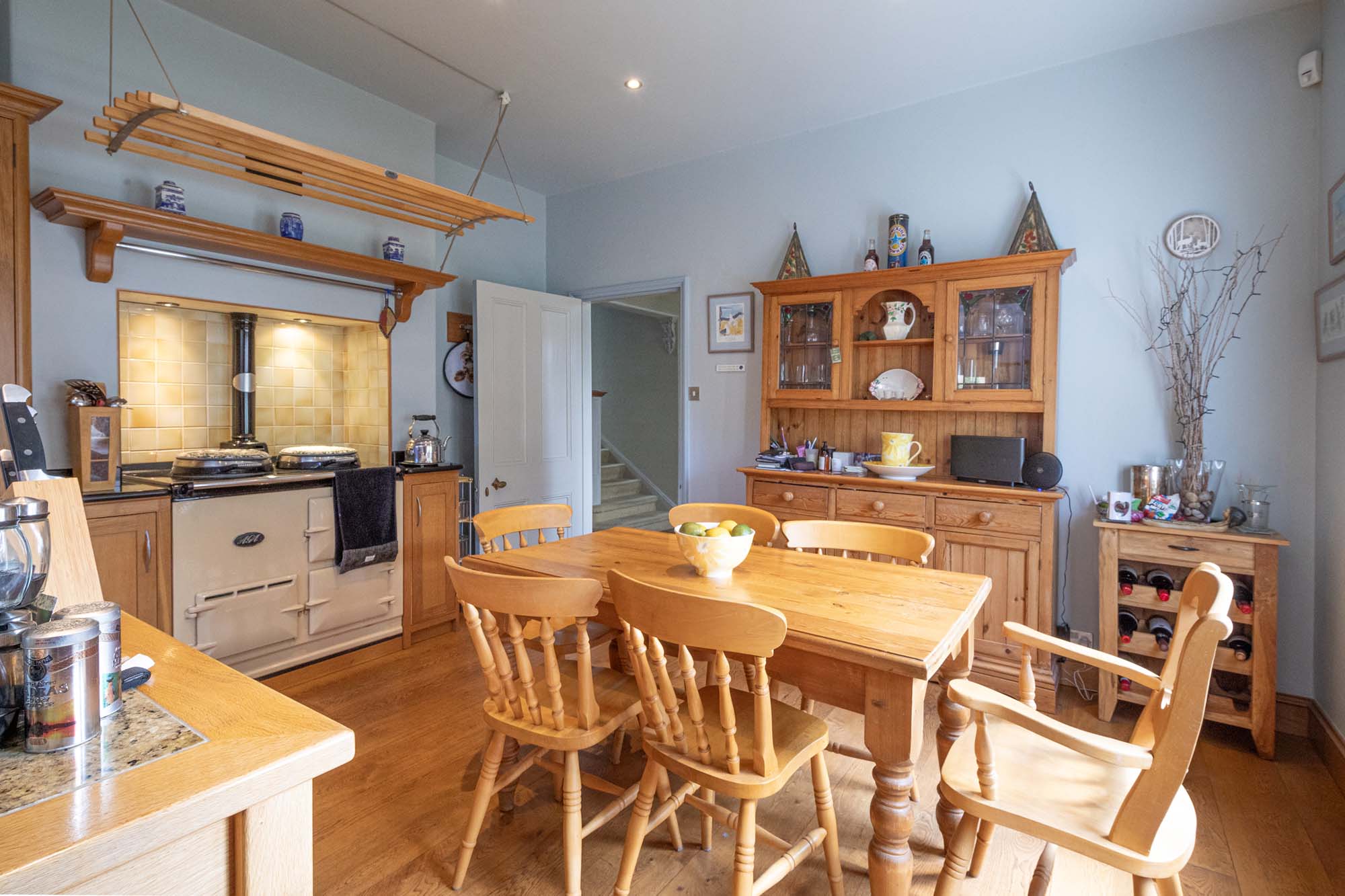 The kitchen to the left is well-appointed, boasting bespoke hand made solid English Oak cabinetry, elegant granite countertops, integrated dishwasher and a classic cream oil-fired AGA. A generous island enhances both storage and worktop space. There is ample room for a table and chairs, perfect for casual dining. The adjoining utility room and boot room offer added convenience with additional wall and floor units, shelving and is complete with plumbing for a washer and dryer.