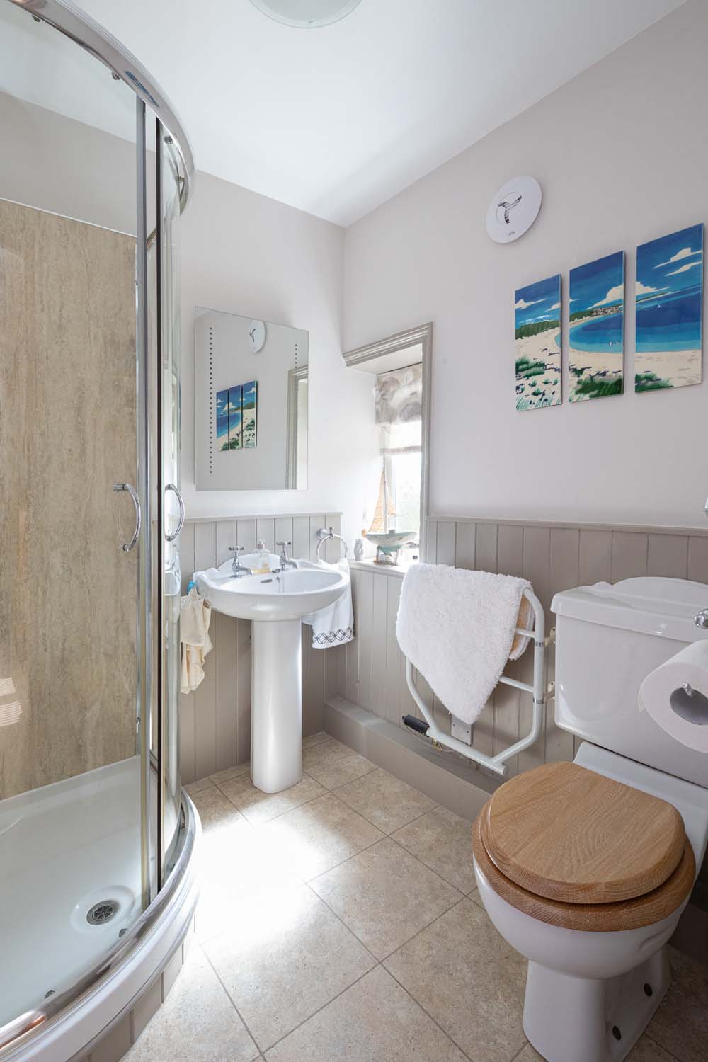 Ascending to the first floor via the original staircase, you arrive at a bright and spacious landing featuring a distinctive barrelled ceiling and a striking full-length stained-glass window. This landing provides access to four generously sized double bedrooms, each with its own en-suite facilities. The principal bedroom’s en-suite boasts a roll-top bath and a double shower cubicle. The adjoining bedroom includes a bath with an overhead electric shower, and the two remaining bedrooms are equipped with modern shower rooms.