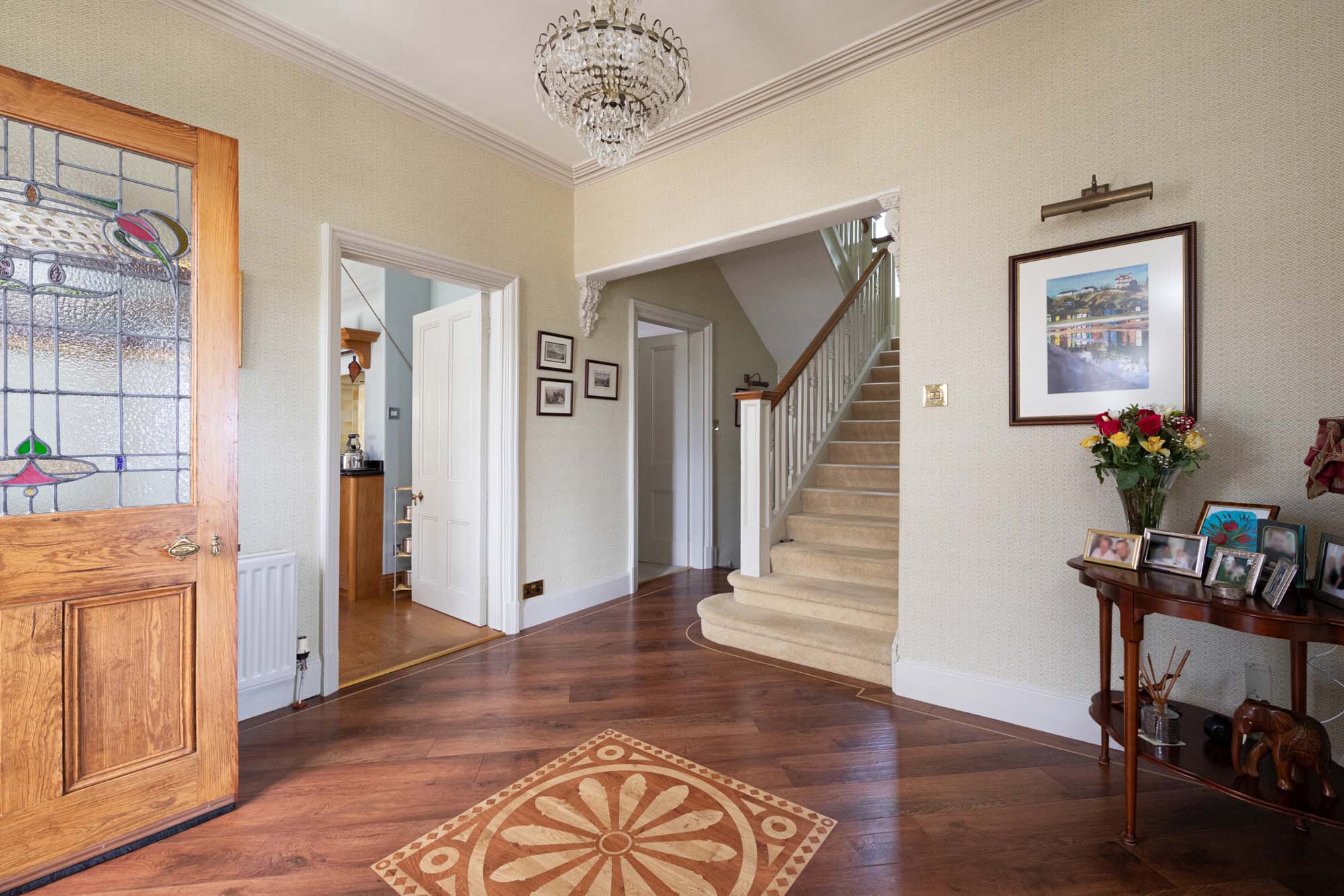 Inside, the main living areas are elegantly presented, with a sophisticated blend of stylish and traditional decor. The entrance porch, highlighted by beautiful original stained-glass inserts creates an inviting welcome. A spacious entrance hall, with Karndean flooring, provides access to the principal living areas, a separate WC, and the staircase leading to the first floor.