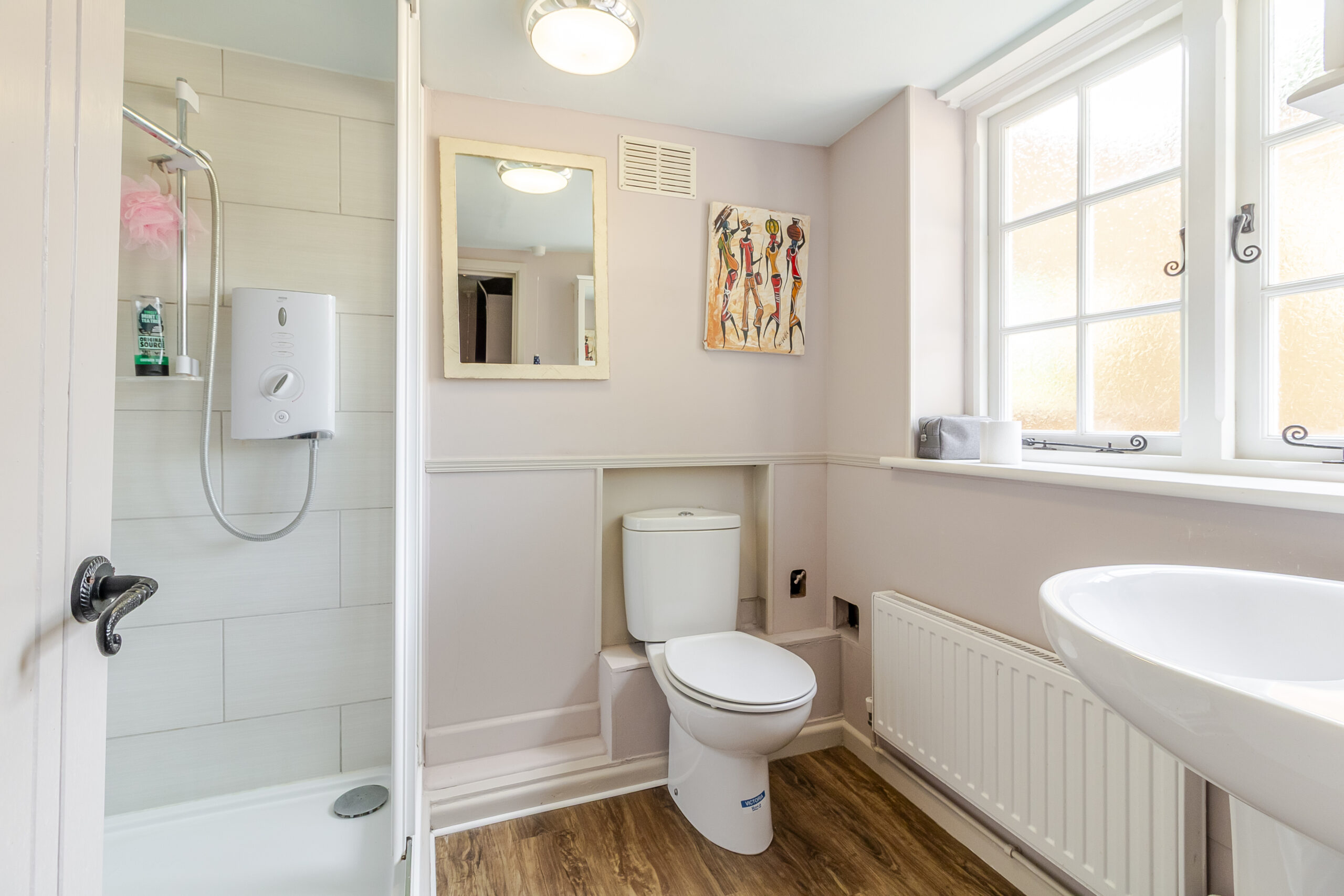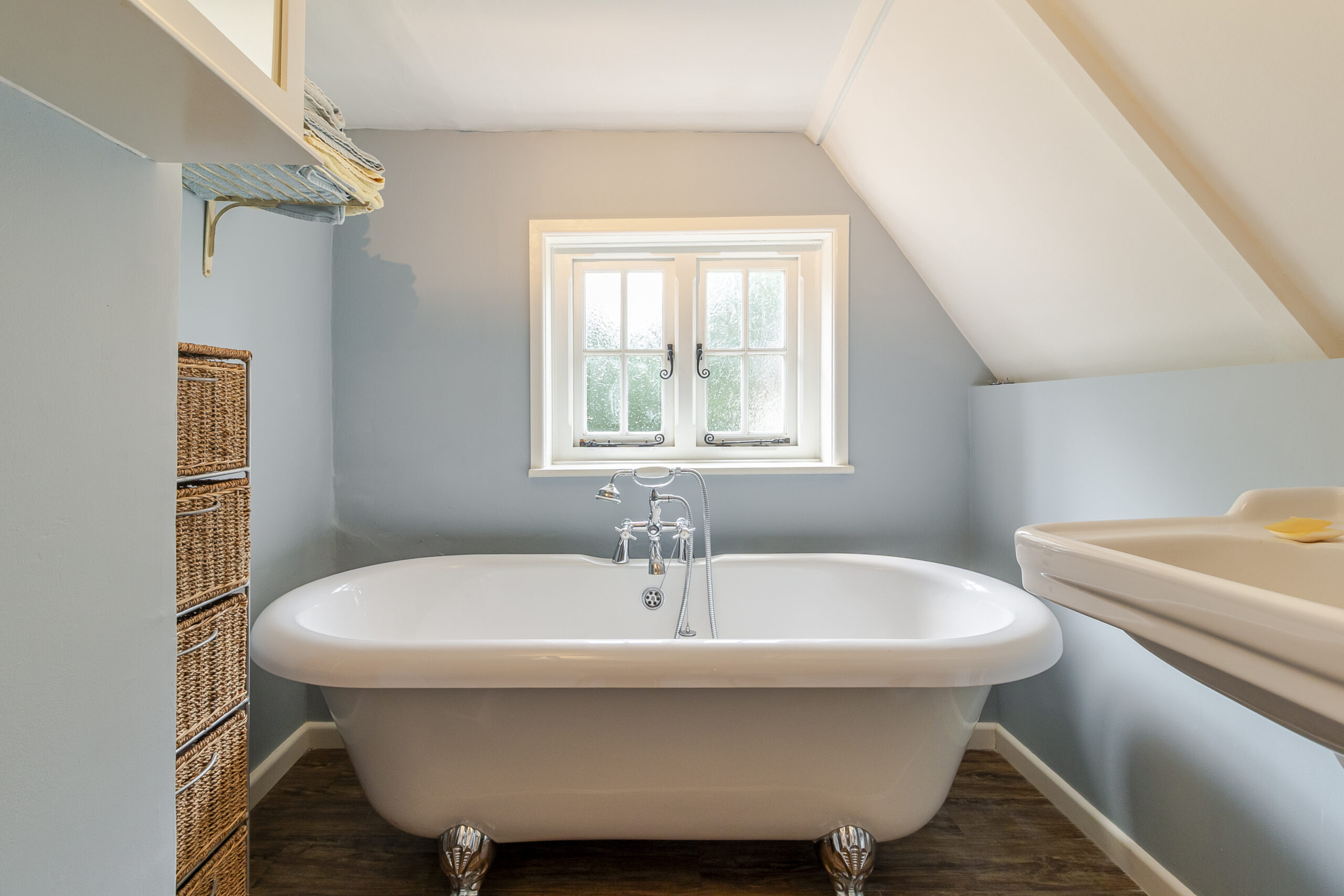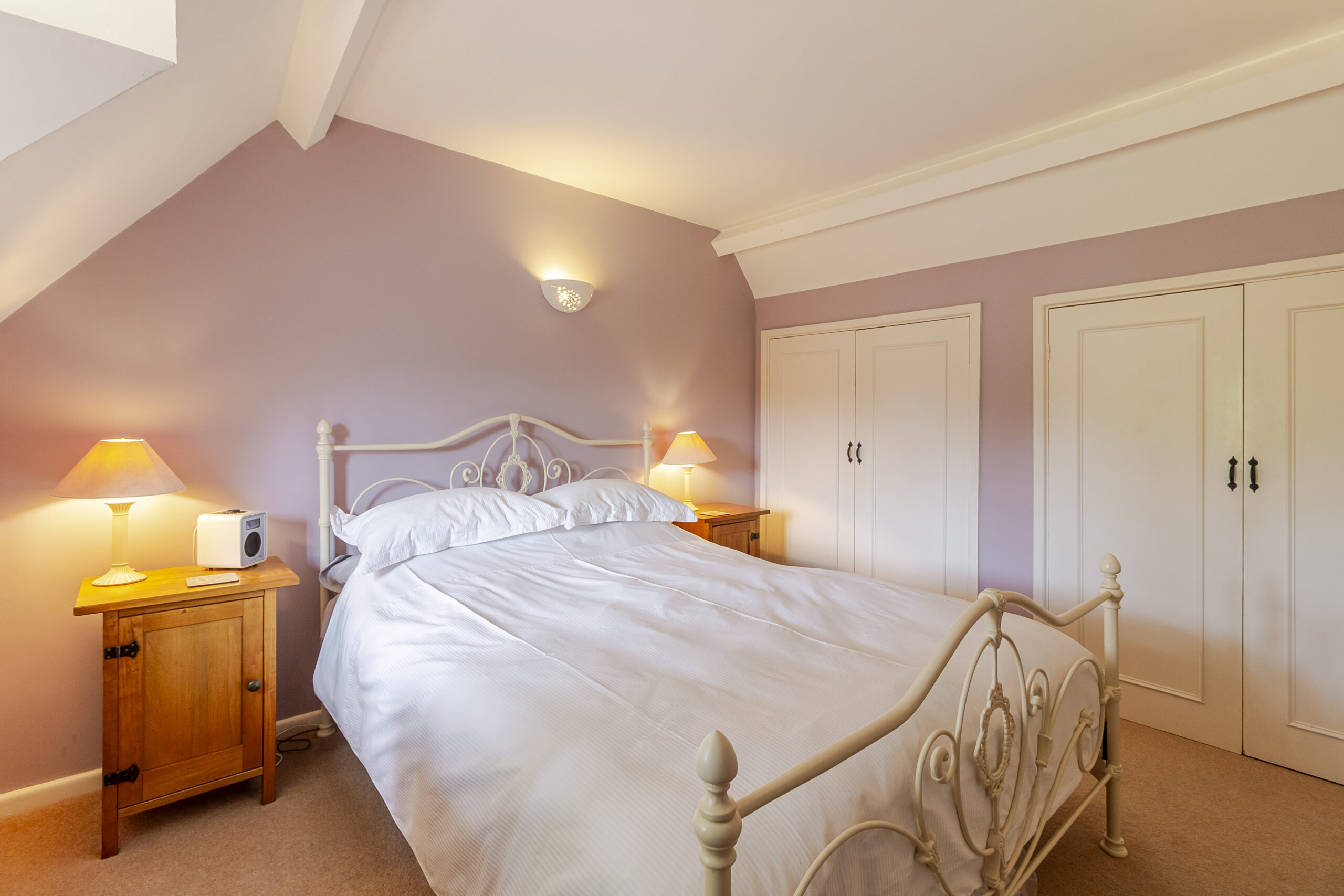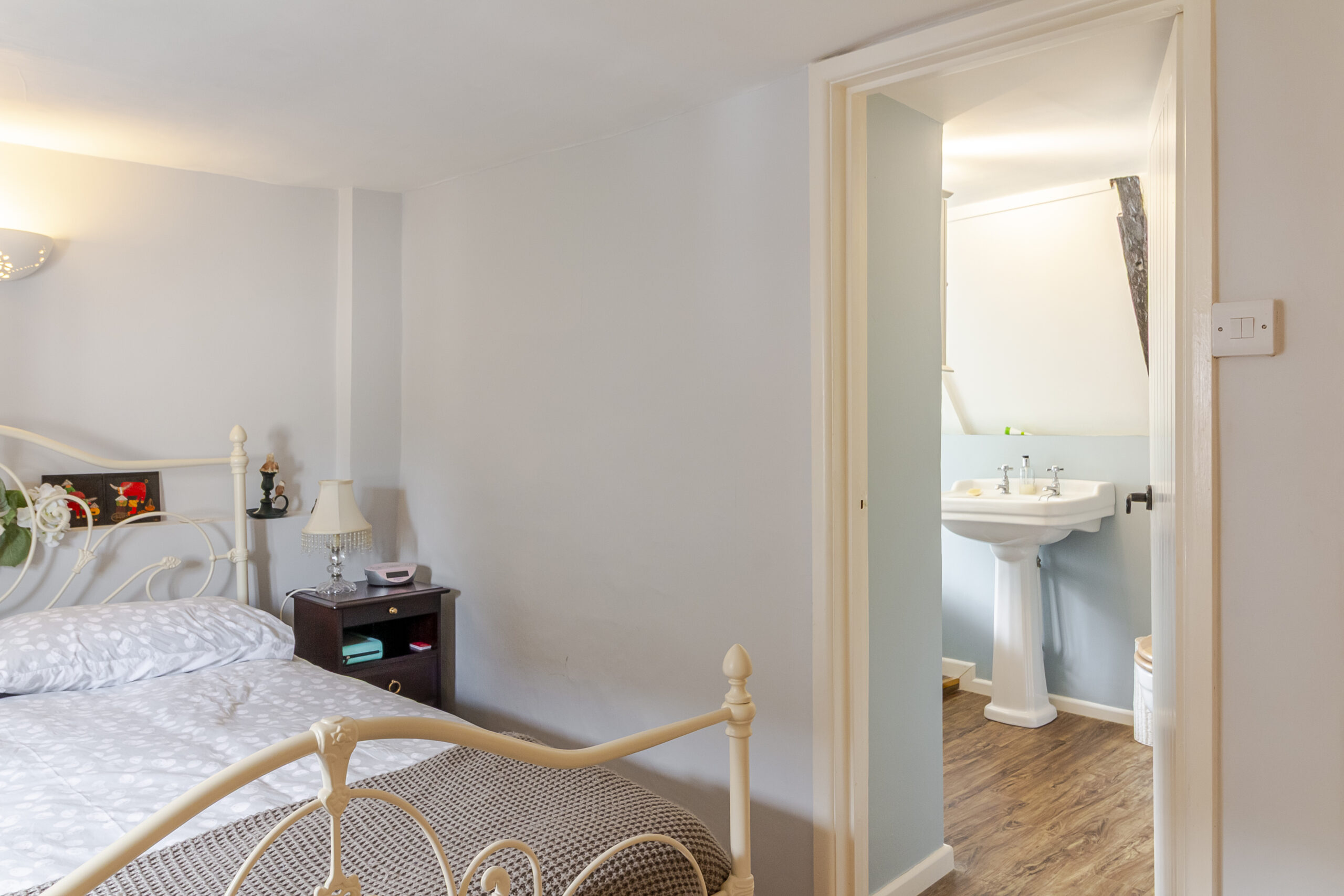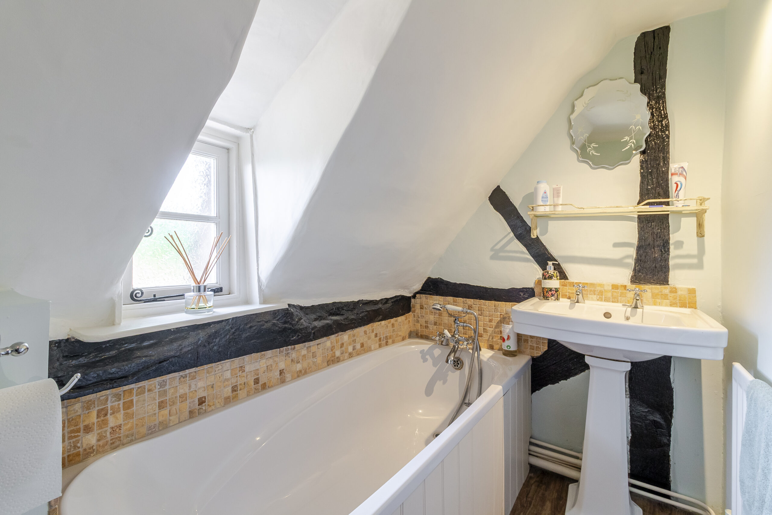 Upstairs, the principal bedroom features fitted wardrobes and an en-suite with a clawfoot bath. Two further double bedrooms and a family bathroom with wood-paneled bath offer space for family and guests. Throughout the home, recent decoration and careful maintenance give a fresh, welcoming feel.
