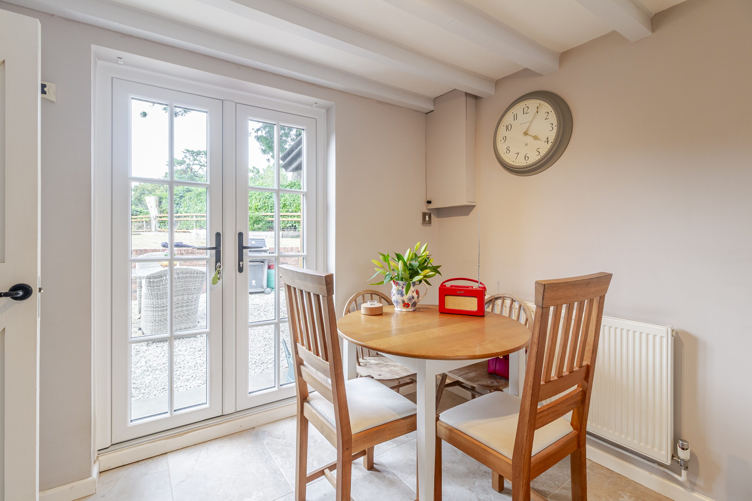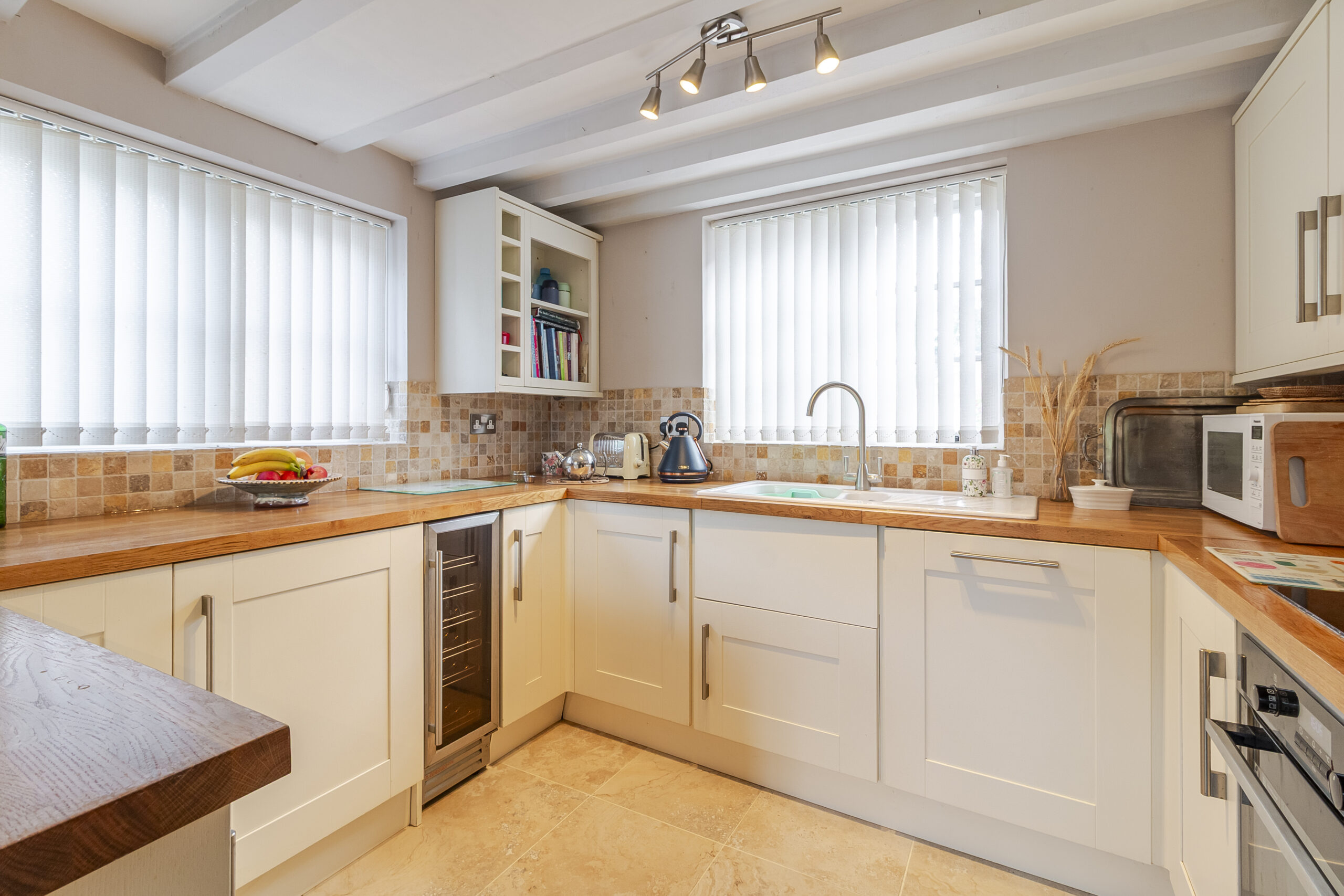 The kitchen breakfast room is the heart of the home, recently refreshed with a new sink, hob and patio doors in 2024. Solid wood worktops and a classic Villeroy & Boch sink set a timeless tone, while integrated appliances make everyday life easy. There’s space for a table, and French doors open onto a sheltered gravel courtyard for summer breakfasts or evening drinks.
