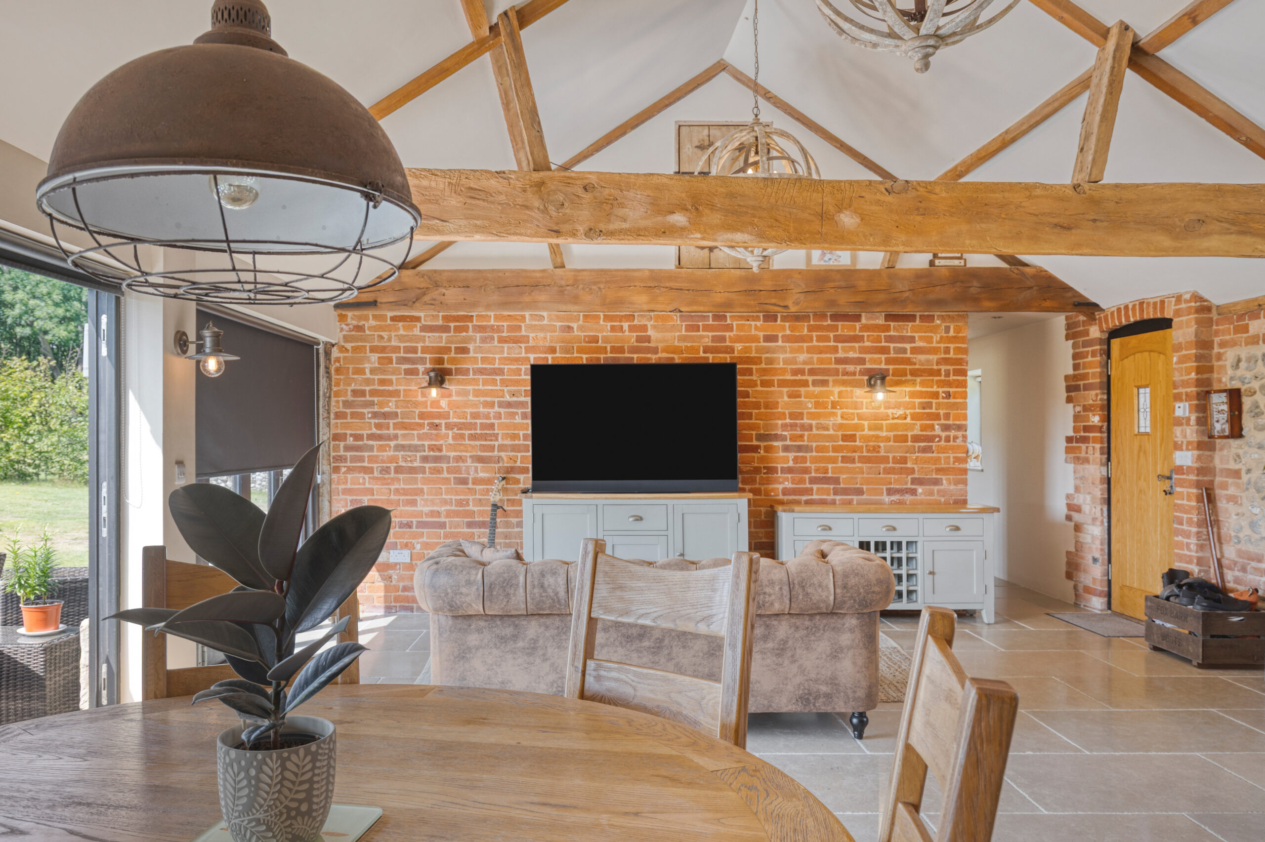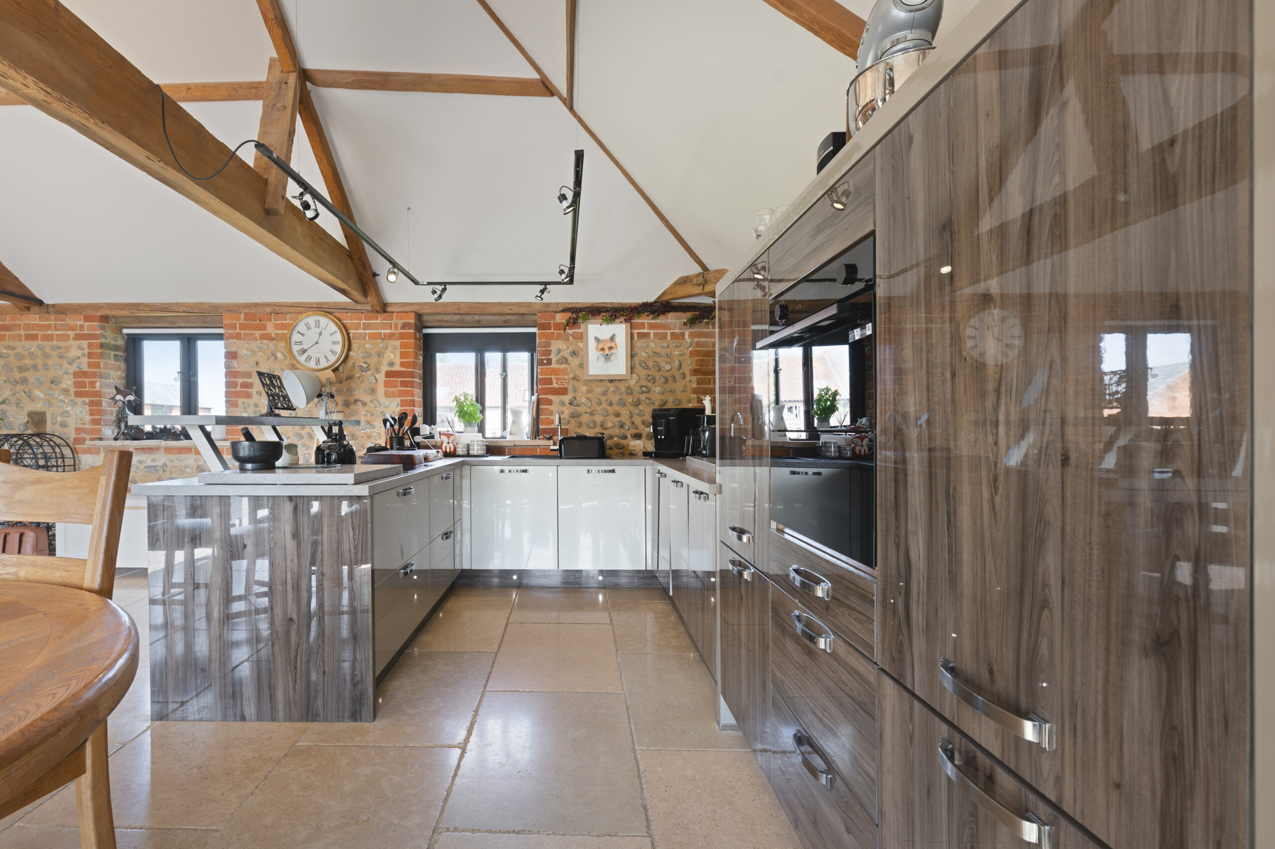 Approached a long driveway, giving a wonderful set back position, the unassuming flint elevations reveal a stunning environment of high end finished and dramatic vaulted receptions. A striking welcome home is assured with the high impact lifestyle room greeting you with exposed timbers, limestone flooring and multiple runs of bifold doors ushering in the splendid garden and countryside views. A quality modern kitchen provides an anchor point for the room whilst ample space for a large dining table and generous seating area makes for a truly memorable room in which to gather as a family and host those near and dear.