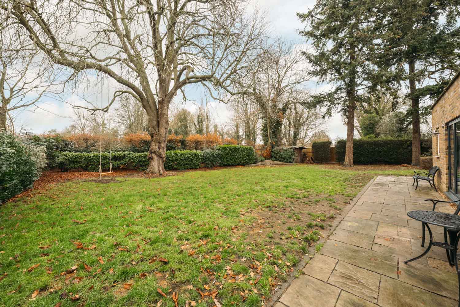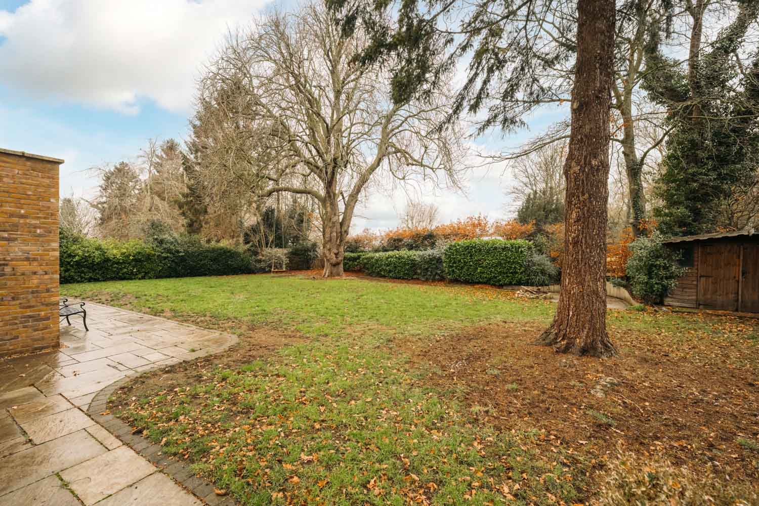 Outside, the property is approached via an in-and-out gravel driveway providing extensive parking and access to a detached double garage with electric doors. The rear garden is private and well established, with paved seating areas, lawn and mature planting. Backing onto open green space and the nearby cricket pitch, the garden enjoys an attractive outlook and a strong sense of privacy.