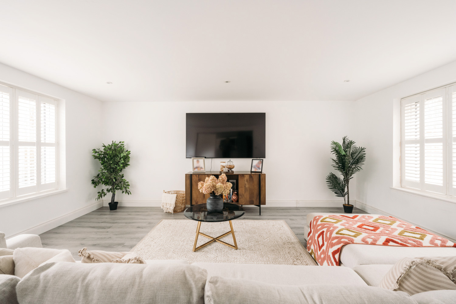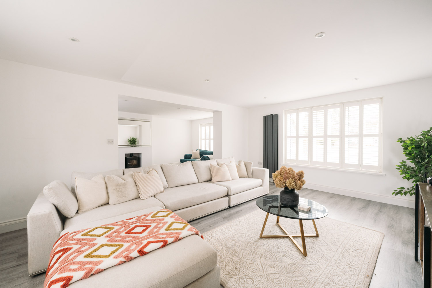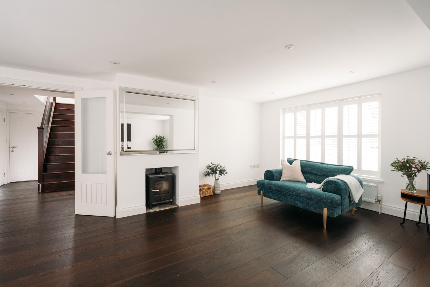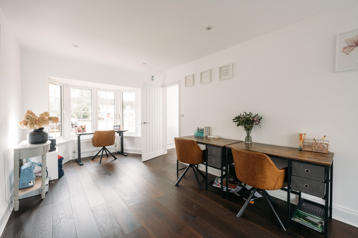 The ground floor offers excellent flexibility, with a range of reception spaces to suit family life and home working. In addition to the main kitchen space, there is a separate sitting room and a generous family room, the latter centred around a feature fireplace with a log burner, creating a welcoming and comfortable setting. A dual-aspect snug, with double doors opening onto the garden, provides further versatile space and could also be used as an occasional fifth bedroom. There is also a dedicated study, along with a utility room and a modern shower room, completing the ground floor accommodation.