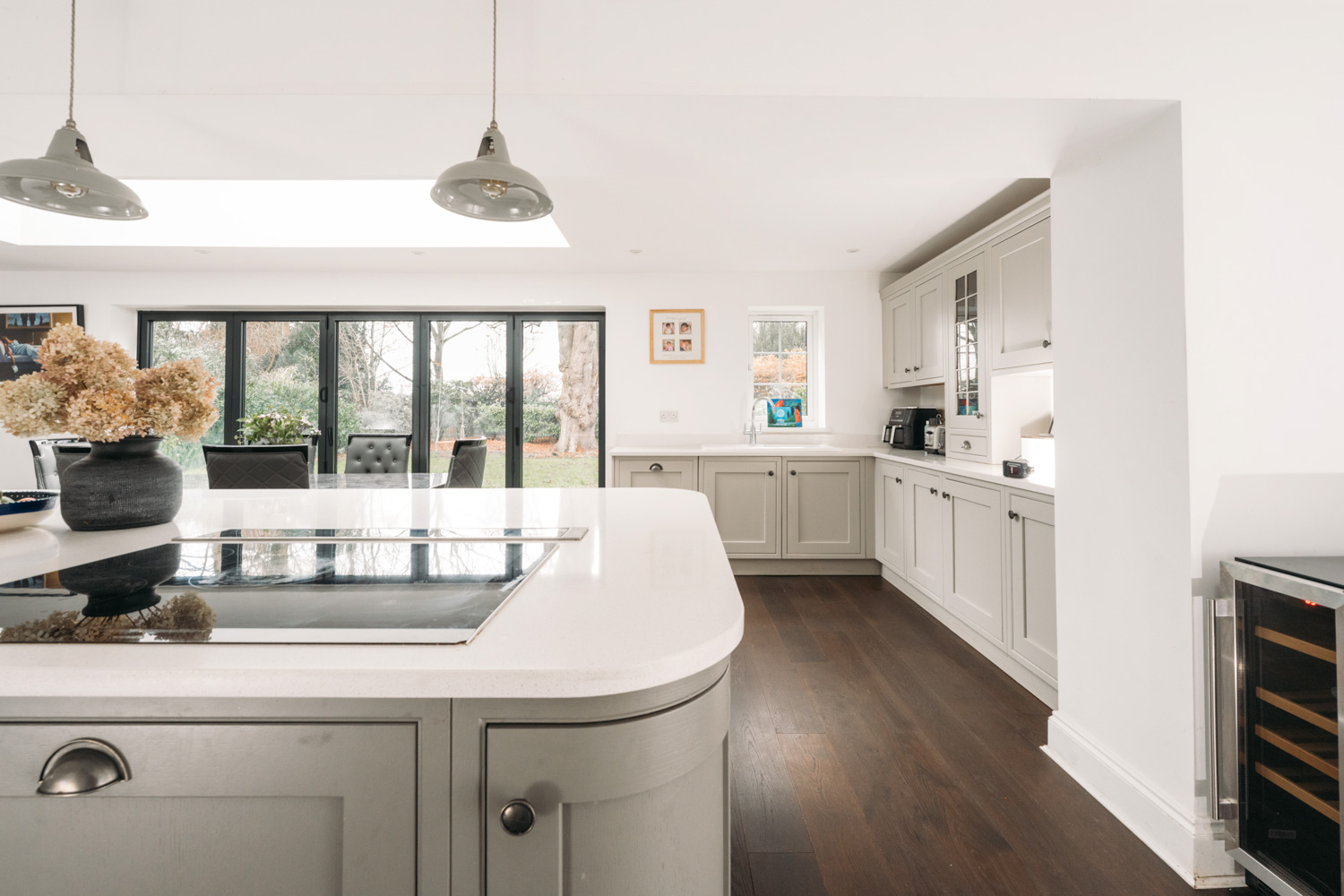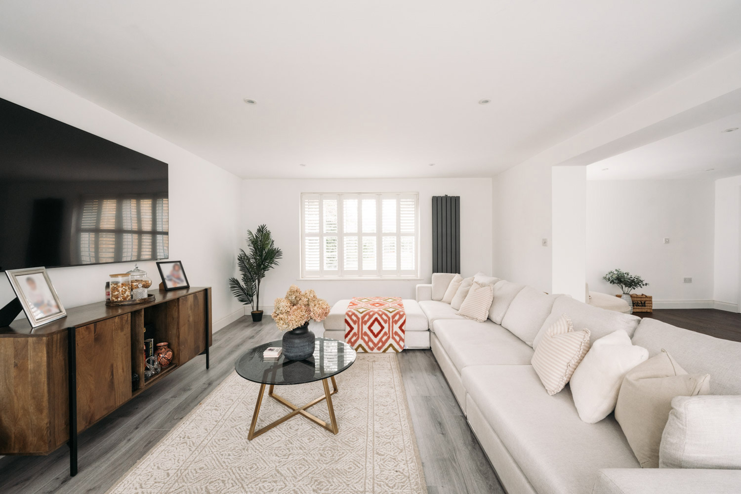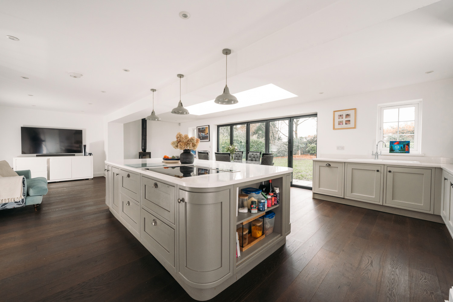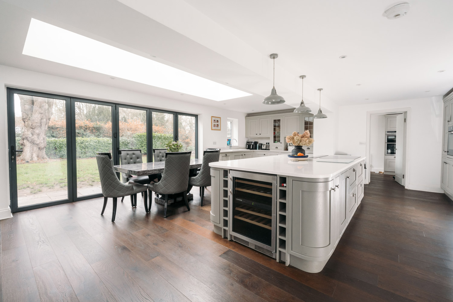 At the heart of the home is the impressive kitchen, dining and family room, designed for both everyday living and entertaining. Flooded with natural light from roof glazing and wide bi-fold doors, this space opens directly onto the rear garden. The kitchen features modern units, a central island with a breakfast bar, integrated appliances and a wine cooler, while a wood burner adds warmth and character to the dining and family area.