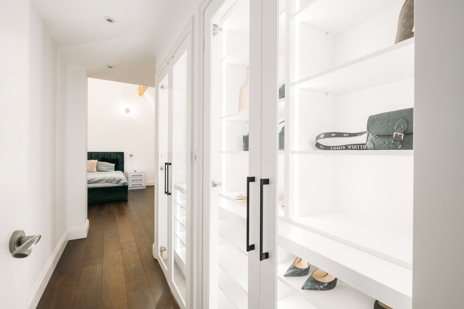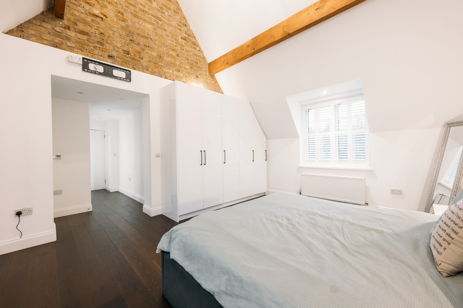 Upstairs, the first floor provides four well-proportioned bedrooms. The principal suite is dual aspect with a vaulted ceiling, exposed brick detailing and fitted wardrobes, along with a private en-suite shower room.