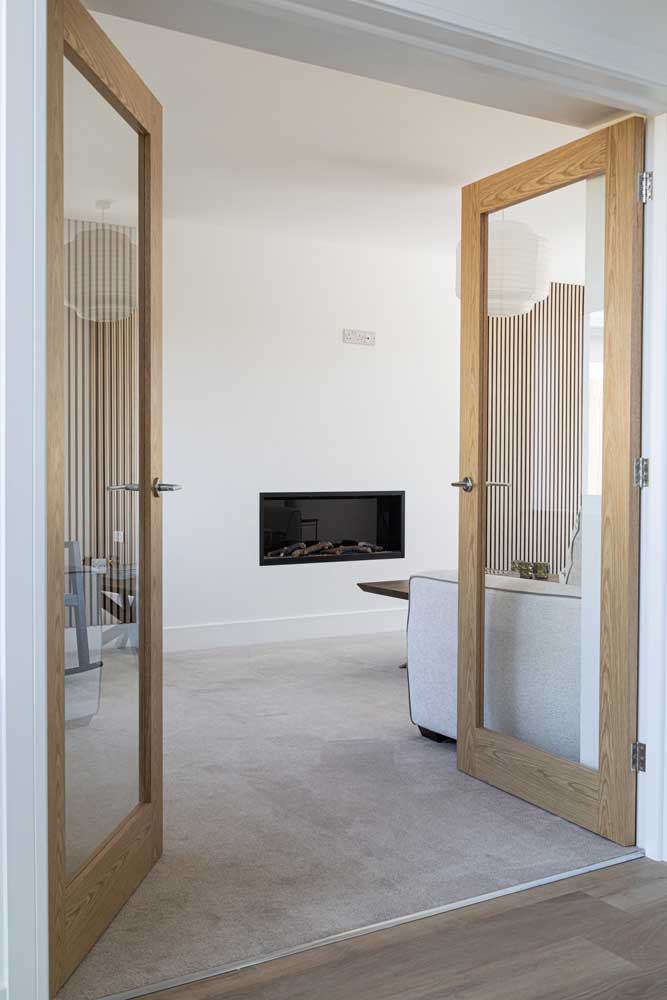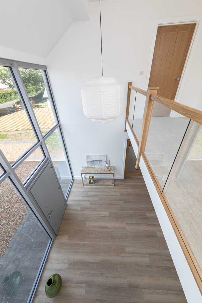 A contemporary oak and glass staircase rises to the first-floor gallery landing, where the double-height feature window frames uninterrupted views and floods the space with natural light. The principal bedroom enjoys a double aspect with stunning fell views and features a private dressing room and luxurious en-suite with a large walk-in rainfall shower and twin basins.