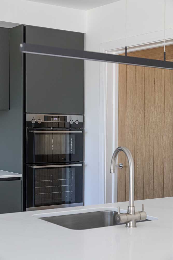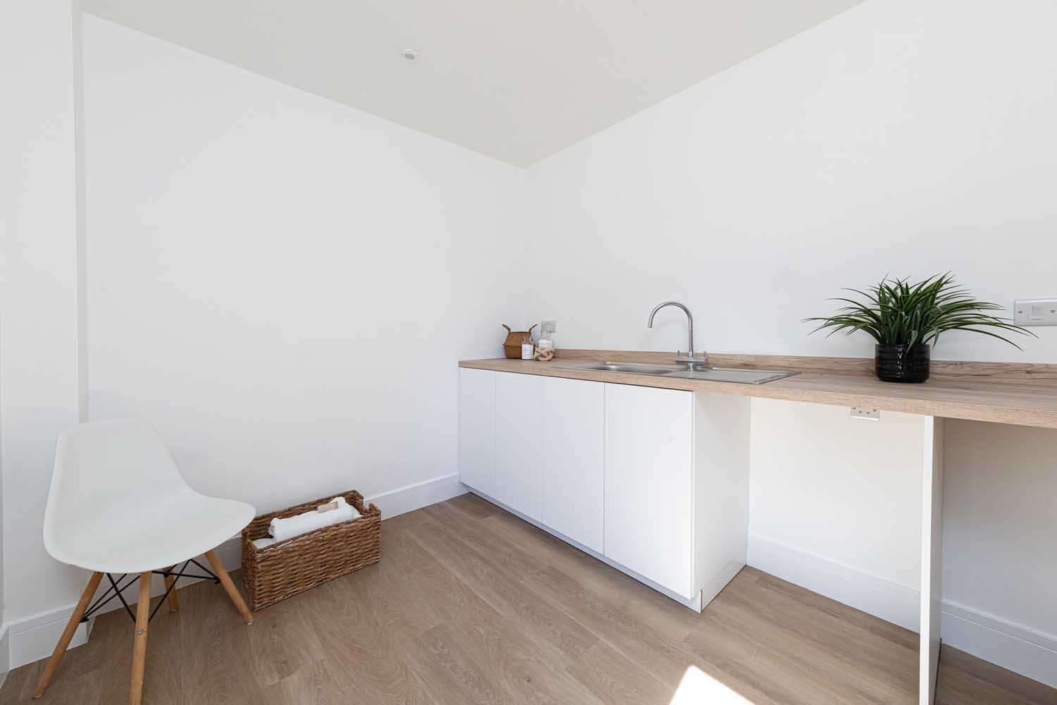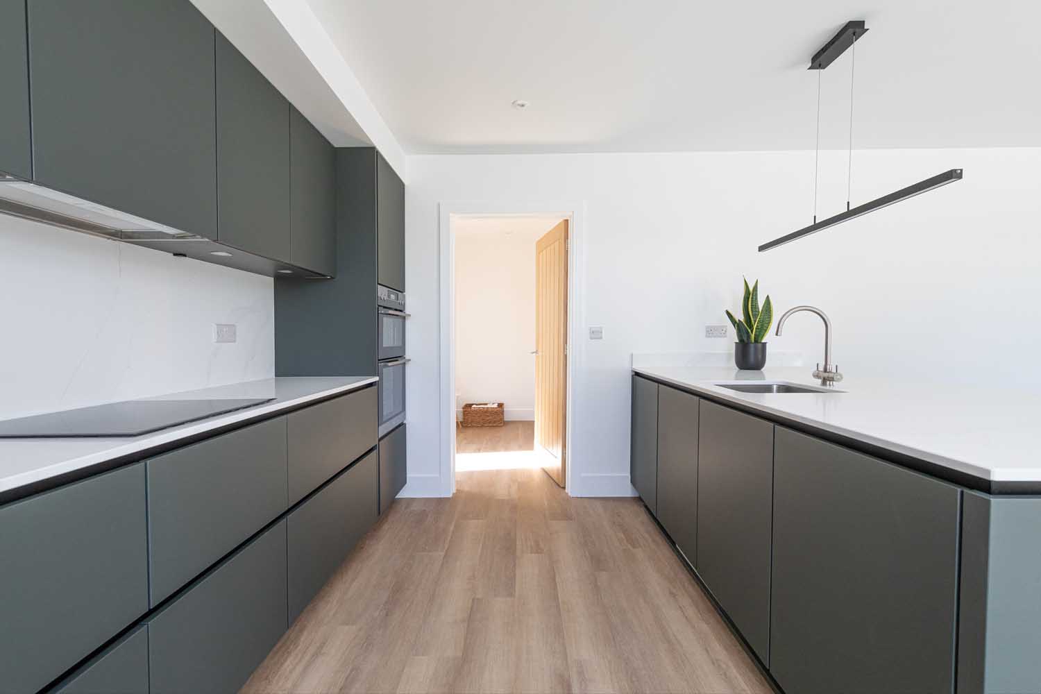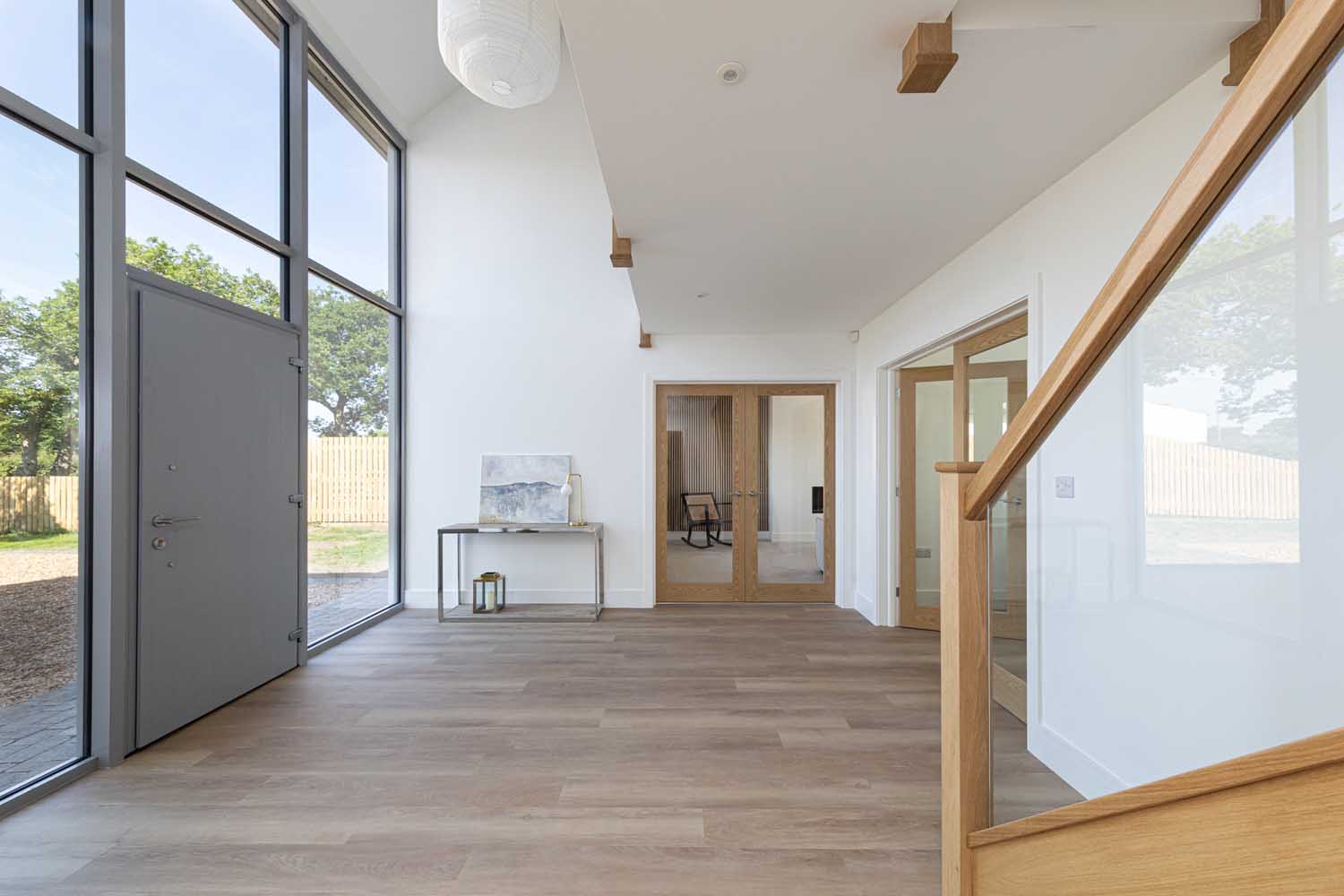 The dramatic double-height entrance hall with full-height glazing, creates an immediate sense of light and volume. From here, the layout flows into an expansive open-plan kitchen, dining and living space—designed with both everyday comfort and entertaining in mind. The sleek German kitchen is fitted with high-specification appliances and finishes, while oversized aluminium sliding doors open directly onto the rear terrace, seamlessly linking the interior with the garden and open views beyond.