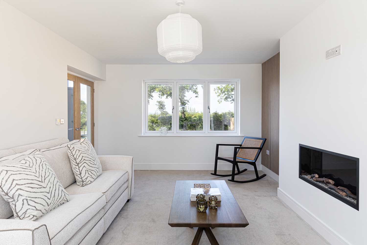 To the side, a generously proportioned lounge provides an additional reception space, warmed by a contemporary electric fire. Further sliding doors offer direct access to the garden. The ground floor also includes a stylish cloakroom WC, a well-appointed utility room off the kitchen, and underfloor heating throughout, along with access to the integral garage.