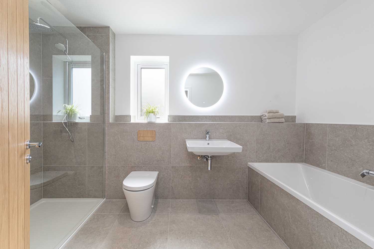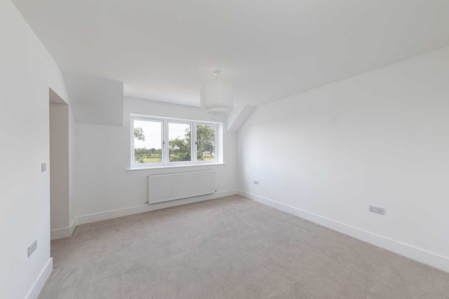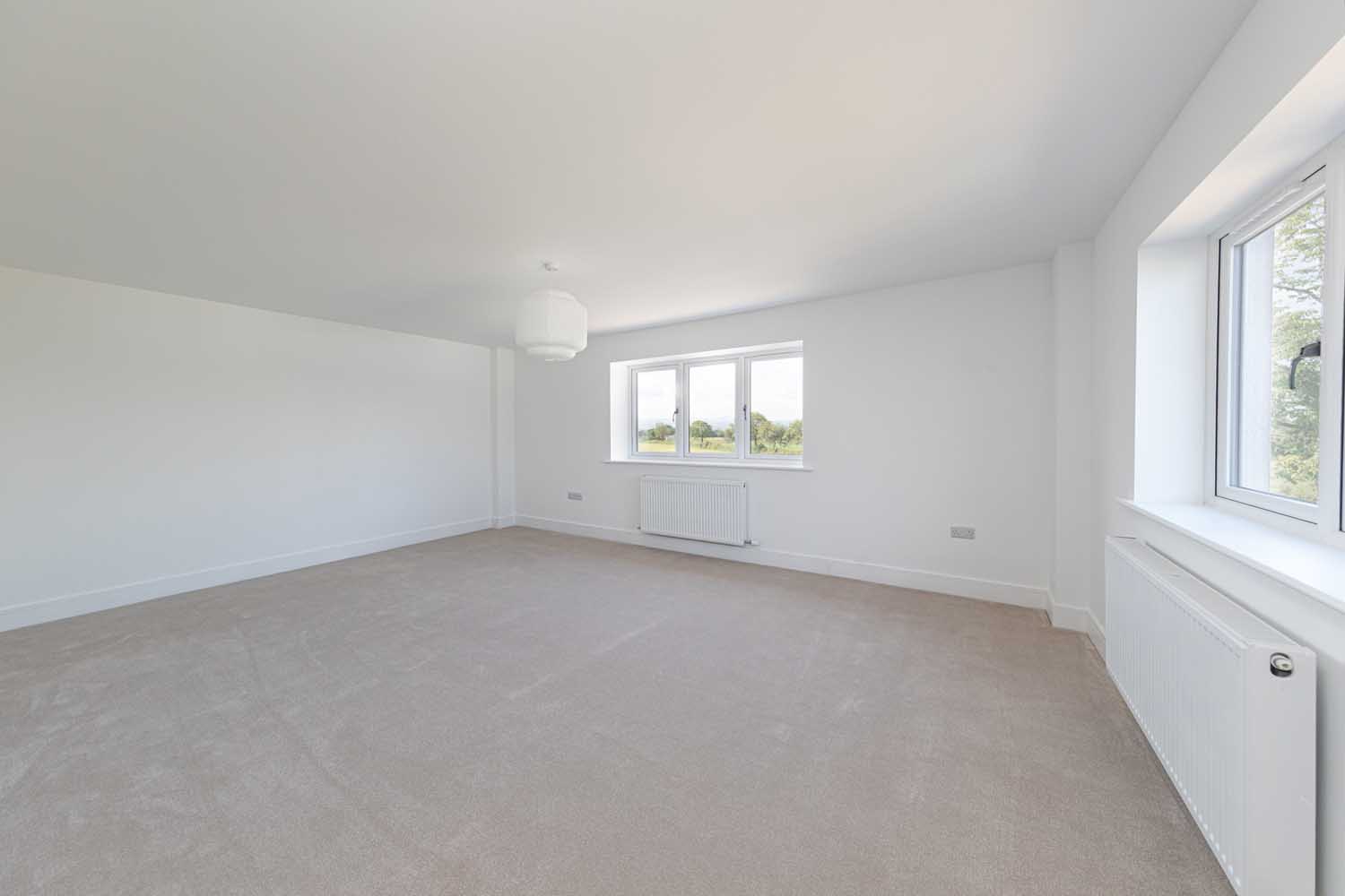 Three further double bedrooms—each with their own outlook onto the surrounding landscape—share a beautifully appointed family bathroom complete with large luxurious bathtub and walk-in shower. All bathrooms are individually designed and fitted with Villeroy & Boch sanitaryware and high-end fixtures, offering a refined finish throughout.