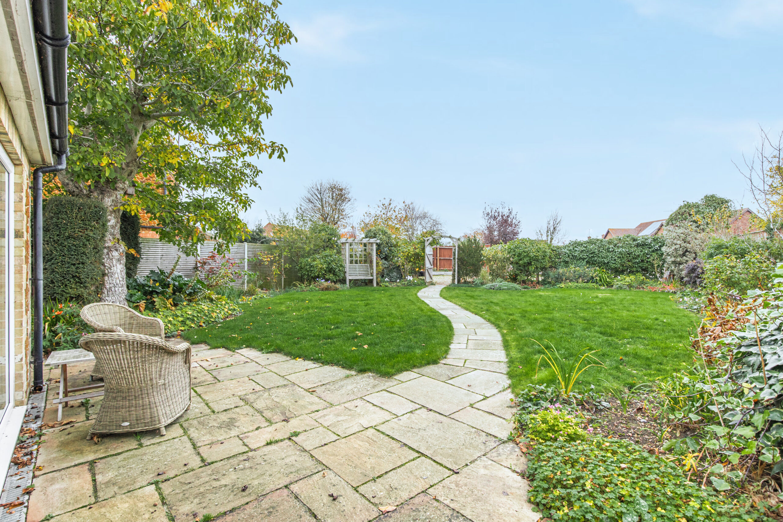 Outside, the property continues to delight. The private rear garden has been thoughtfully landscaped to provide areas of terrace seating, lawn, and mature planting, offering a peaceful and secluded setting perfect for relaxing or entertaining. To the rear, a garage and ample parking ensure the property is as practical as it is beautiful.