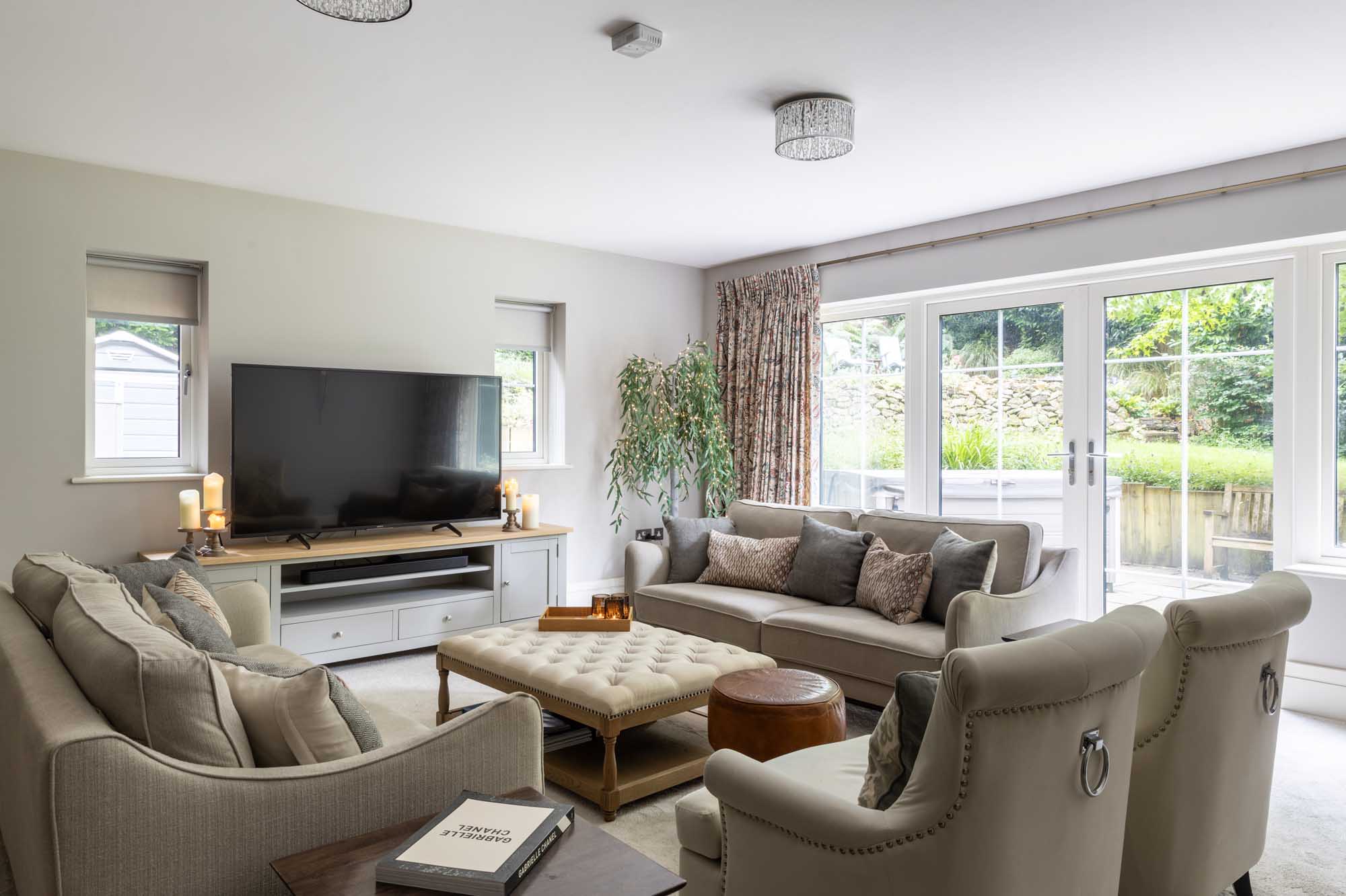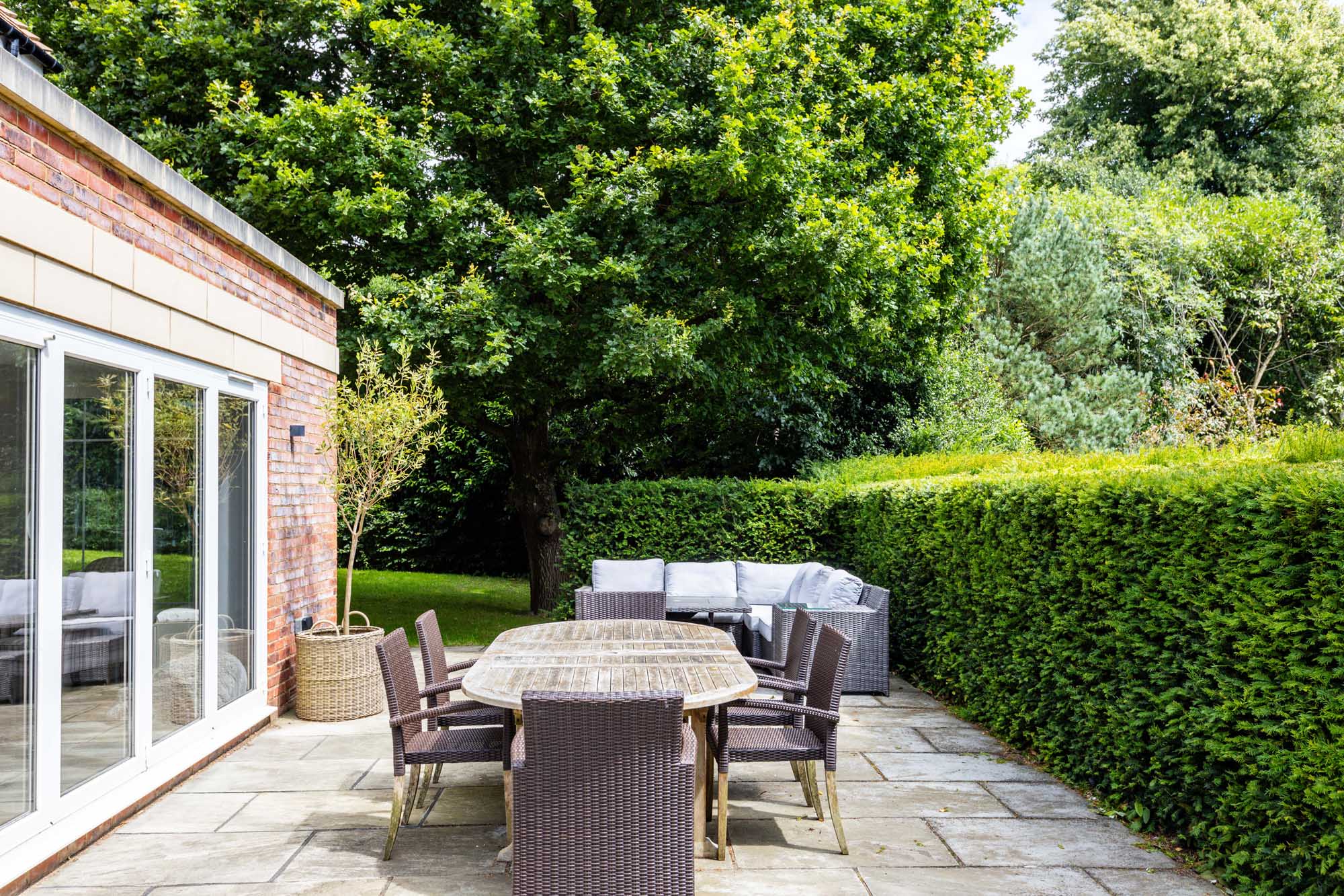 Outside, the landscaped gardens are a peaceful haven with dog-friendly lawns, three paved terraces, and various seating areas to enjoy the outdoors in privacy. The garden is designed for low-maintenance enjoyment, making it ideal for both relaxation and entertaining. With modern double glazing and an energy-efficient air source heat pump, this property combines luxury with sustainability, keeping energy costs manageable.