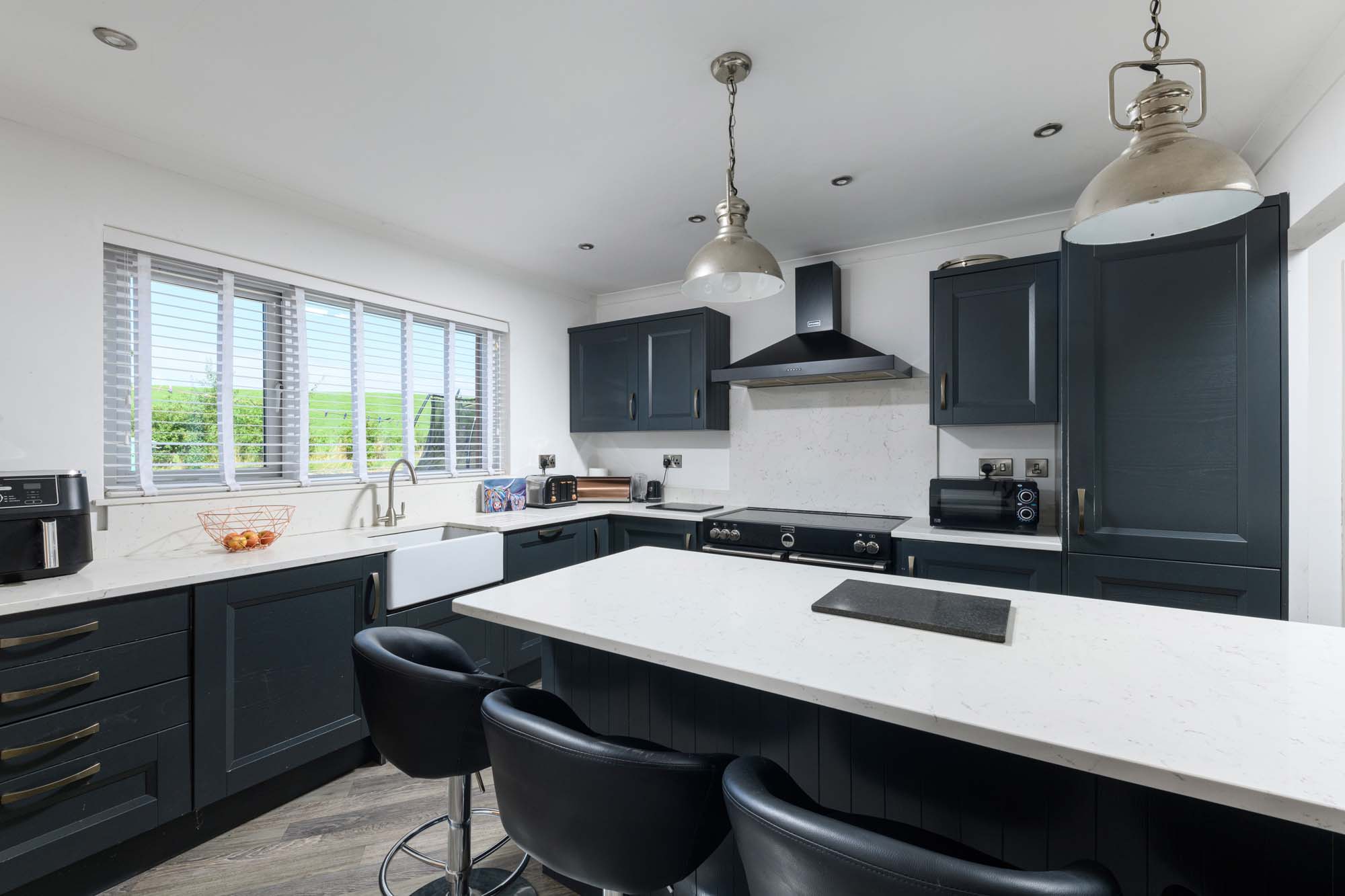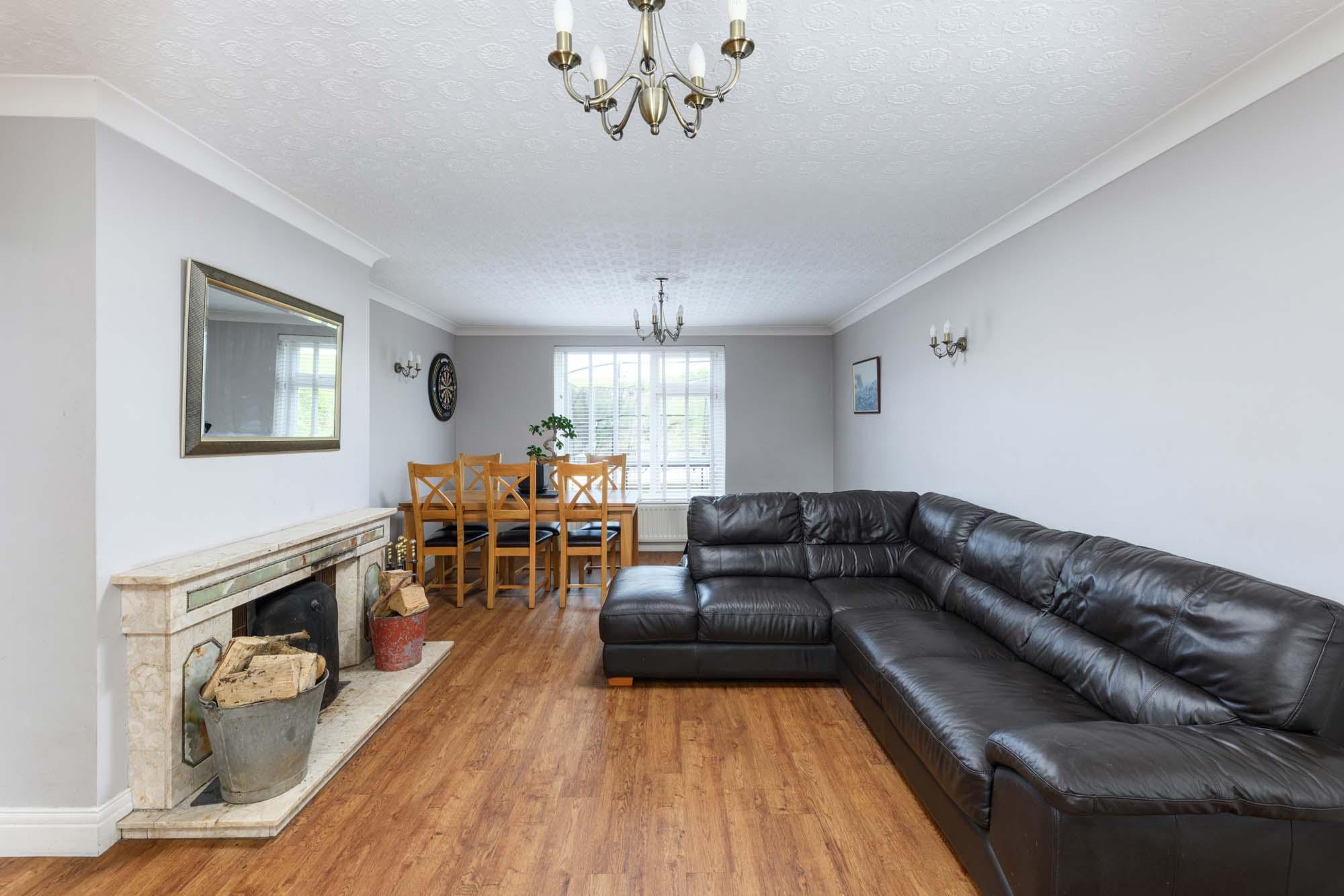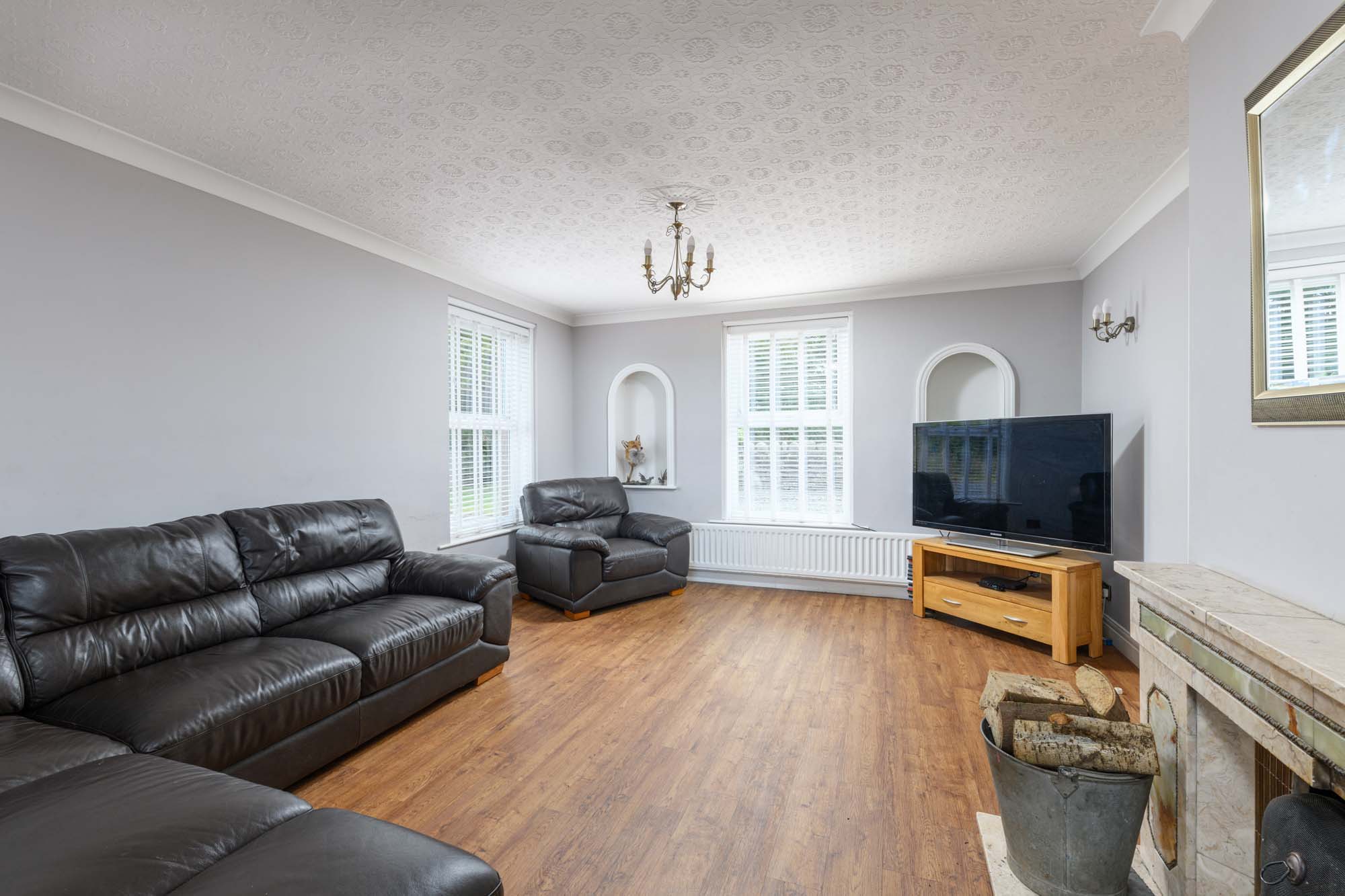 The generous lounge, decorated in neutral tones and featuring rich dark wood-effect flooring, offers breathtaking countryside views from all three aspects. A striking marble fireplace serves as the room’s centerpiece, with furniture thoughtfully arranged around it to create a cozy, inviting space. The layout also allows for the addition of a table and chairs, perfect for relaxed dining within the comfort of the lounge.