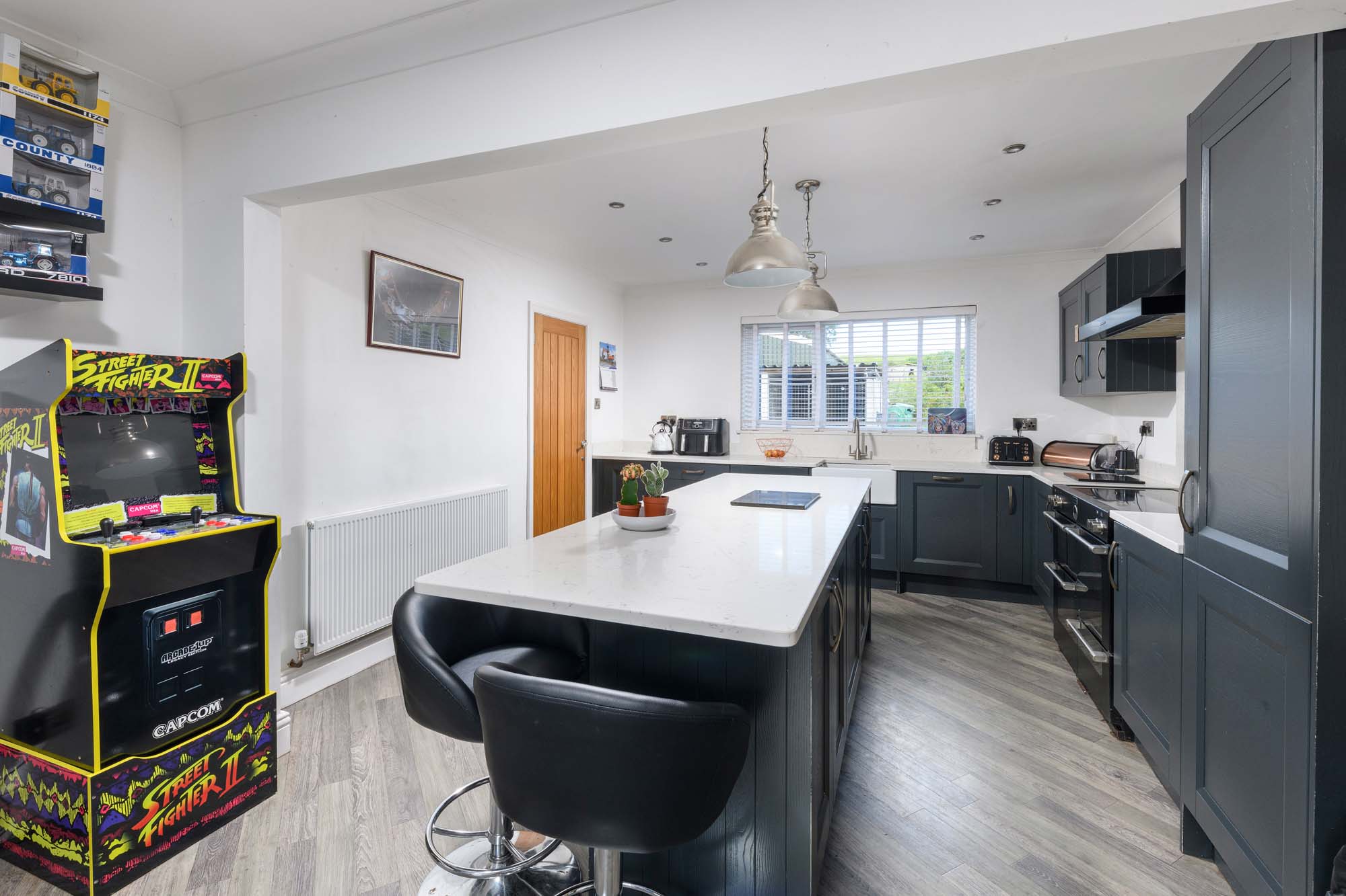The large entrance hall, featuring a distinctive archway, offers understairs storage and seamlessly connects to the generous living room on the right, the kitchen/diner on the left, and the staircase leading to the first floor. The well-appointed kitchen features modern shaker-style floor and wall cabinets elegantly complemented by white countertops and splash backs. Integrated appliances include a fridge, dishwasher, washing machine and a classic Belfast sink. At the heart of the kitchen, a substantial island offers additional storage, generous workspace, and ample room for breakfast bar seating, perfect for casual dining and entertaining. This versatile area can also accommodate a cozy seating arrangement or a more formal dining table and chairs. A convenient door from the kitchen leads to the spacious garage, which offers ample storage and is equipped with lighting, power, and plumbing for a washer.