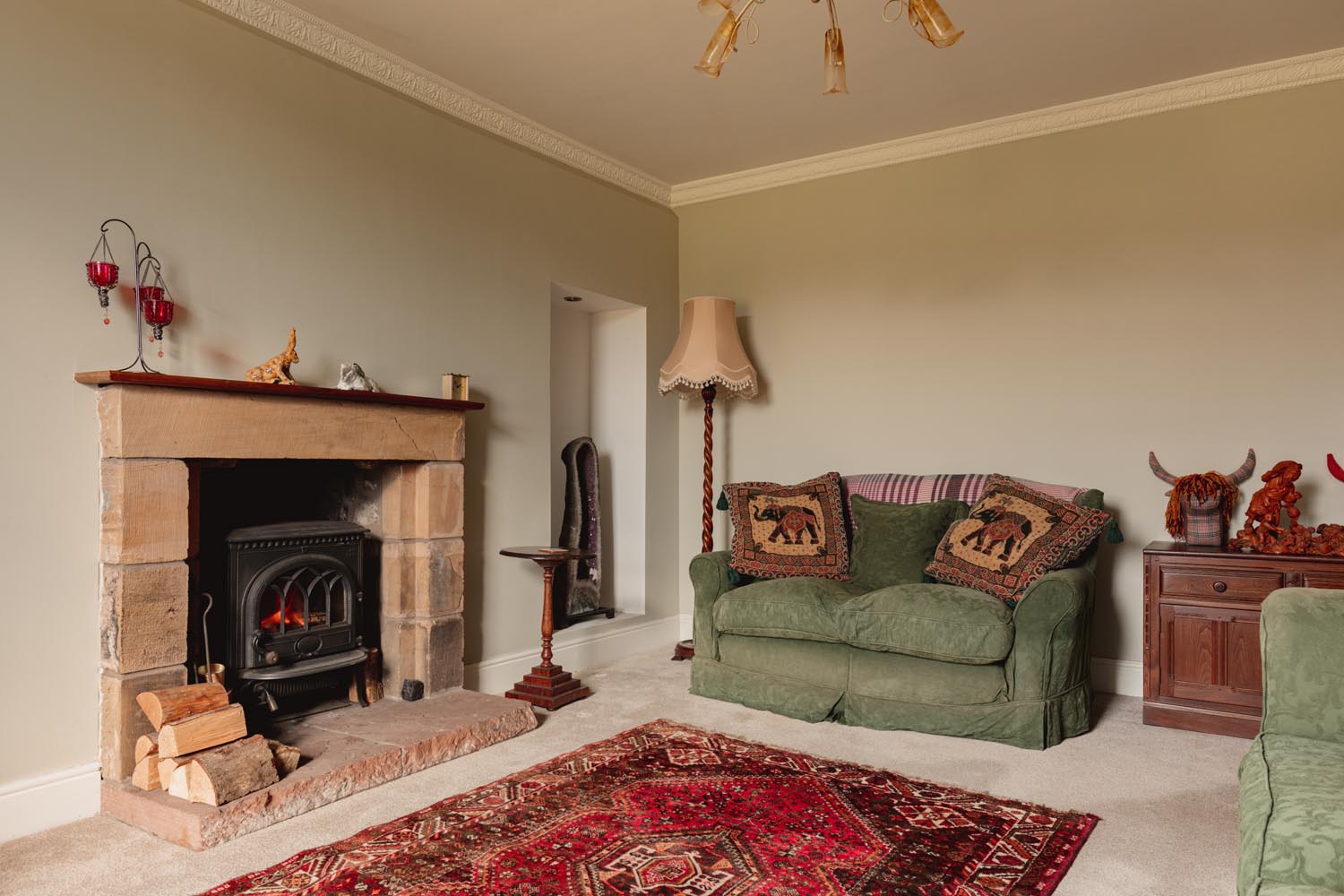 To the front, two substantial reception rooms provide excellent flexibility for everyday family life and entertaining. One is centred around a striking stone fireplace fitted with a wood burning stove, creating a warm and welcoming sitting room, while the second offers an equally comfortable space as a drawing room or formal lounge, each enjoying open views across the surrounding land.