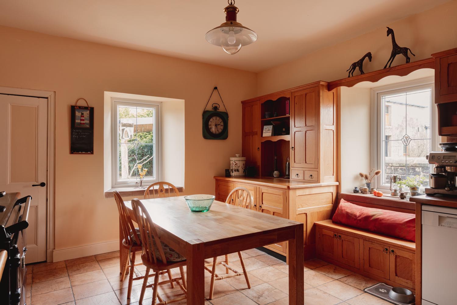 The dining kitchen is particularly characterful, fitted with bespoke oak cabinetry and extensive storage, complemented by stone tiled flooring and a traditional AGA set within the original fireplace recess. There is ample space for a large dining table, making it a natural gathering point for family and guests alike. A day room to the rear offers a quieter retreat, ideal as a snug, study or home office, with a utility room and ground floor shower room providing additional day to day practicality.
