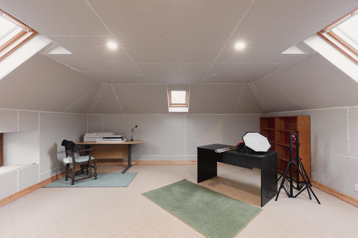 Upstairs, the first floor is arranged around a broad landing leading to four well proportioned bedrooms. The principal bedroom is particularly spacious and filled with natural light from large sash windows overlooking the surrounding fields, creating a calm and restful retreat. It benefits from direct access to a generous en suite bathroom beneath the eaves, complete with a freestanding bath and rooflights, while the remaining bedrooms are served by a spacious family bathroom.