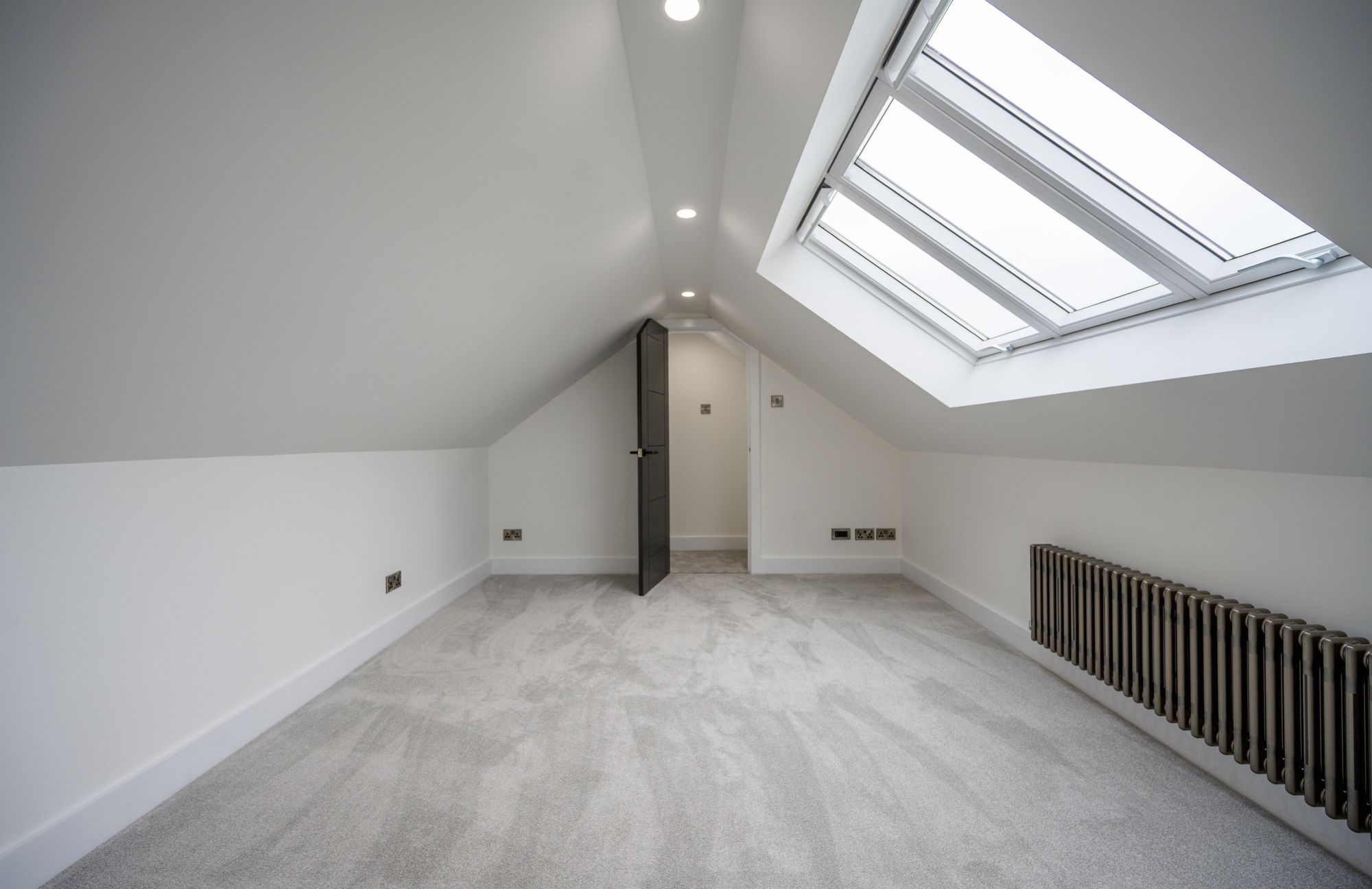 Ascending to the top floor, you discover an inviting bedroom tucked beneath the eaves, finished in a tranquil palette of soft greys and crisp whites. Expansive skylights flood the room with daylight and provide delightful views of the sky, enhancing the sense of openness and privacy. Plush carpets underfoot and subtle, energy-efficient lighting contribute to the cosy and airy feel, making this space ideal as a restful guest bedroom, a creative home office, or a peaceful sanctuary away from the main living areas. Thoughtful details, including ample electrical outlets and contemporary radiators, reflect the commitment to comfort and practicality throughout this beautiful home.