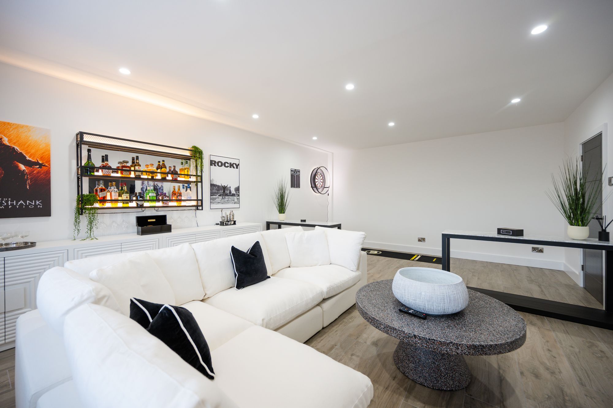This versatile second reception room offers superb flexibility for family life and entertaining. Designed with contemporary clean lines, crisp white walls and sleek flooring, it provides the perfect backdrop to suit a variety of lifestyles. Whether you envision a sophisticated entertaining space, a relaxed second lounge, or a fully immersive home cinema, the room can be tailored to your needs with ease. Large windows invite plenty of natural light, keeping the atmosphere uplifting and welcoming. Carefully considered lighting, including subtle recessed ceiling spots, ensures the space is suitable for both lively gatherings and cosy evenings. A set of striking display shelves, currently styled with a selection of glassware and drinks, creates a stylish focal point and offers an attractive area for showcasing your collection or decorative pieces. With ample space for custom media setups or games, and easy access to the main living areas, this is a truly multifunctional room where you can relax, entertain, or enjoy the latest films in comfort and style.