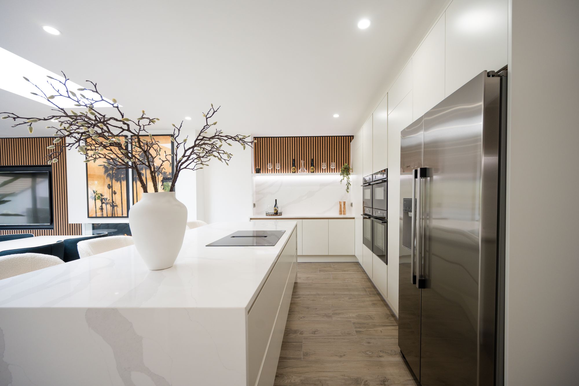 The kitchen is an exceptional centrepiece of the home, designed to maximise both style and practicality in an open plan layout that exudes sophistication. Expansive and filled with natural light from the generous skylight overhead and large sliding glass doors, the space seamlessly connects to the dining and living areas, making it ideal for family living or entertaining guests. Striking clean lines are set off by the use of high-gloss cabinetry and elegant marble-effect worktops, while subtle wood accents and vertical panelling bring warmth and a touch of contemporary character. The impressive central island offers extensive preparation space and doubles as a casual breakfast bar, complete with chic upholstered stools for relaxed dining. A full suite of integrated appliances enhances both functionality and style, including a discreet dishwasher, dedicated space for an American-style fridge freezer, premium ‘Neff’ double ovens, two sets installed for effortless cooking and entertaining, and a sleek built-in induction hob that provides precise, modern cooking. These appliances are expertly concealed within streamlined units, preserving the kitchen’s minimalist appeal. Finishing touches such as ambient recessed lighting, modern display shelving and carefully curated décor ensure the kitchen remains both functional and visually stunning. With direct access to the garden and ample room for gatherings, this is a space that truly elevates everyday living.