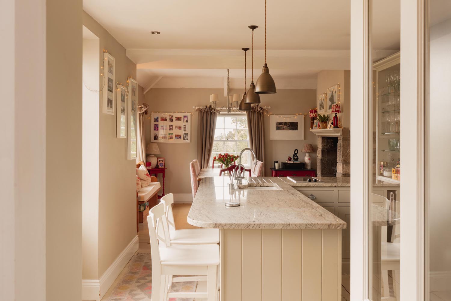 The generous kitchen and breakfast room, finished in a calm, neutral palette, forms an inviting heart to the home, arranged for everyday ease and entertaining. A four-oven electric Aga stands at the centre, surrounded by integrated appliances, painted bespoke timber cabinetry and stone worktops that flow into a peninsular island with an inset sink. At the dining end, a stone fireplace with a cast-iron stove creates a focal point beside the table, while sash windows draw in soft light and double doors open to a balcony, well sized for alfresco dining, with long views over the Tyne Valley.