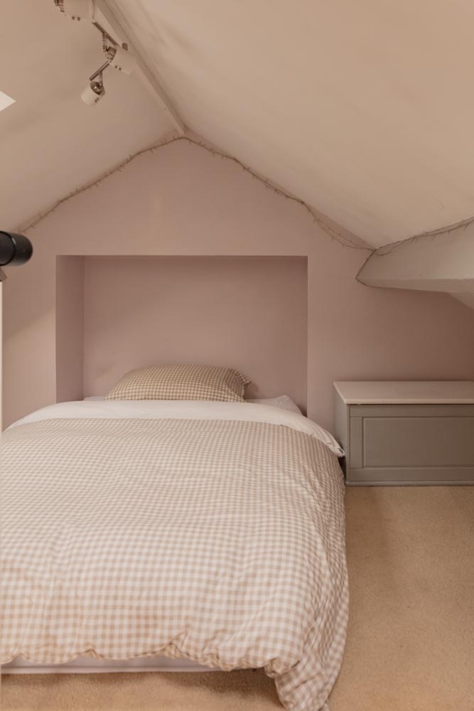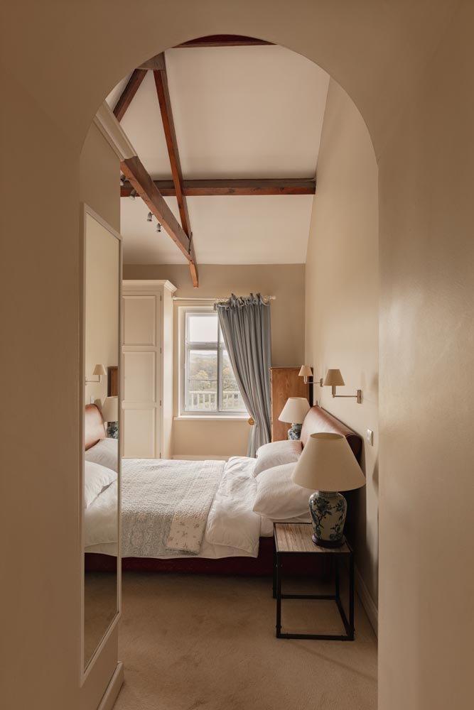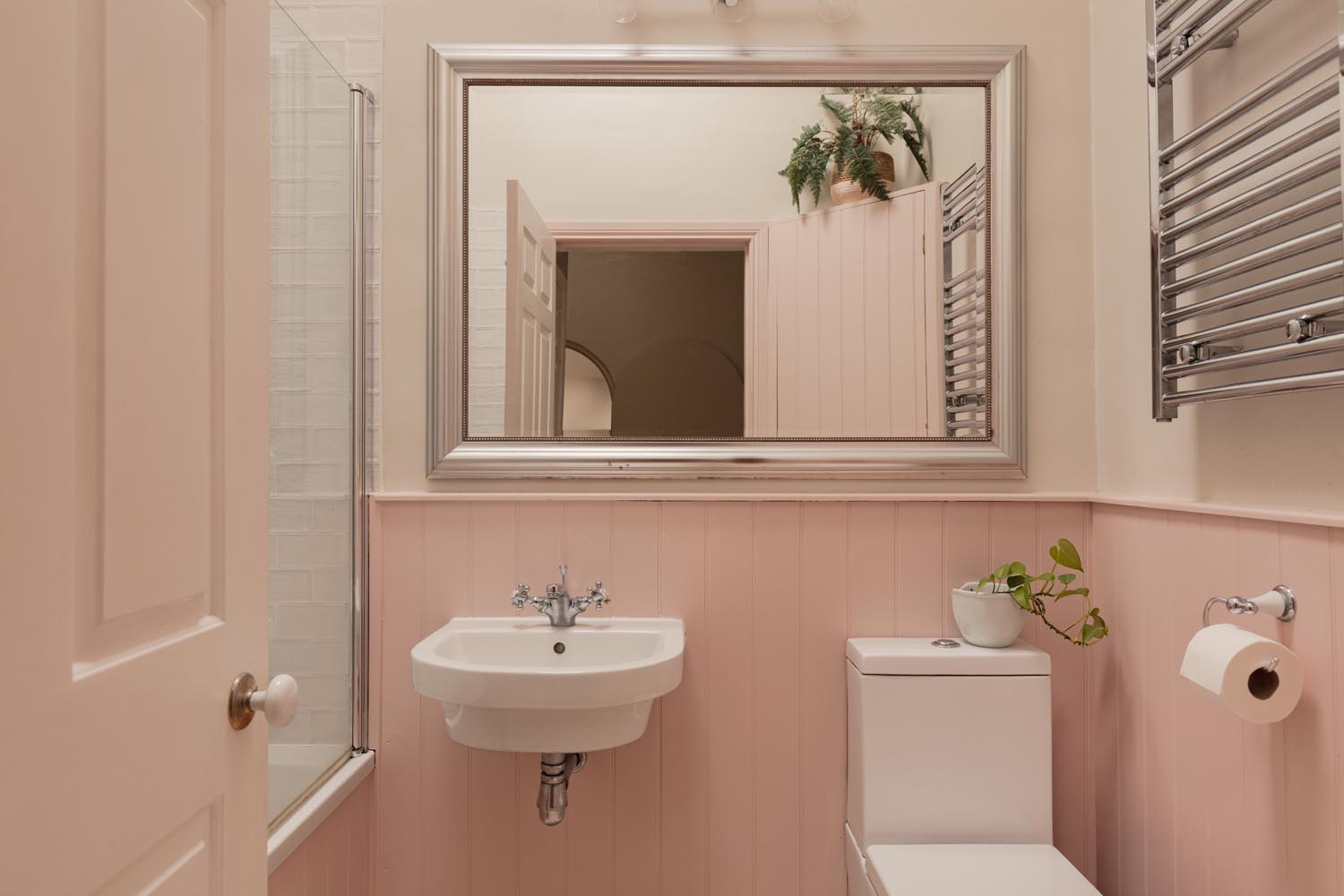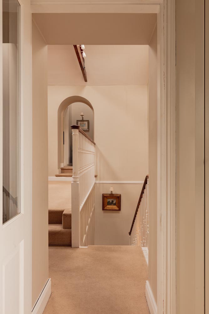 Three well-proportioned double bedrooms are arranged across this floor, each with its own character and outlook. The principal bedroom sits to the front, enjoying the finest of the views and an en-suite shower room, while another bedroom features a charming spiral staircase leading to a converted attic room, ideal as a private study, studio or occasional sleeping area. The family bathroom is presented in a soft, neutral palette with classic fittings and a quietly modern feel.