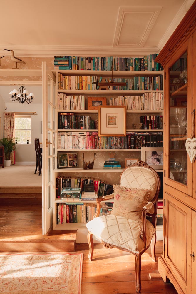 The main living accommodation occupies the first floor, arranged to make the most of the outlook and natural light. A broad landing leads to an elegant dining room and adjoining sitting room. The sitting room features a bay window framing views across the surrounding fields, together with a stone fireplace and fitted bookcases that create a refined, comfortable atmosphere. The dining room, which also has a fireplace and multi-fuel stove, benefits from a secondary entrance through a porch on the roadside elevation, offering convenient access at ground level directly into the main living areas.