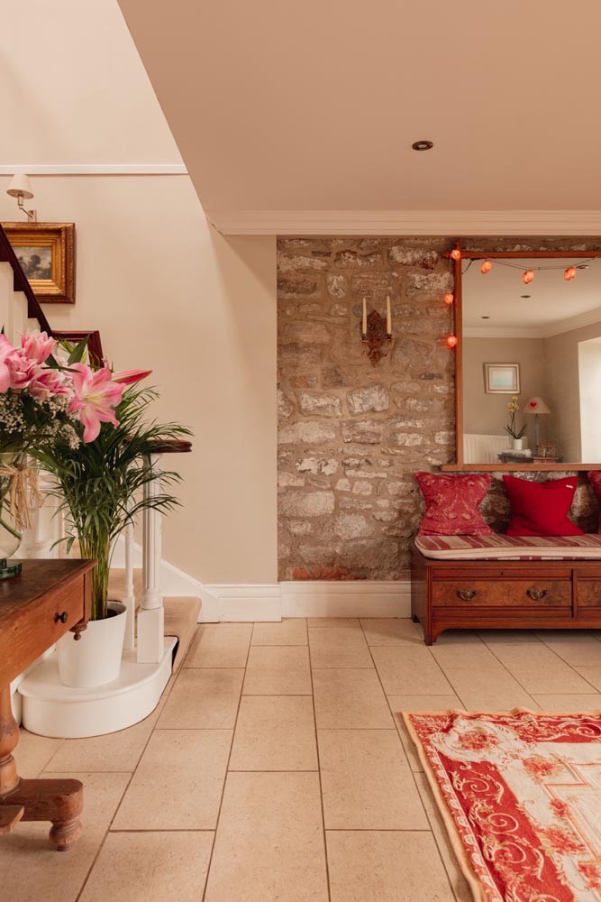 The entrance hall on the ground floor provides a bright and characterful welcome, featuring an exposed stone wall, painted panelling and an open staircase rising to the main living level. This lower floor also includes a practical WC, a generous utility room, store room and a versatile double bedroom with exposed ceiling beams, ideal for guests, multi-generational living or which could easily serve as an office for home working.