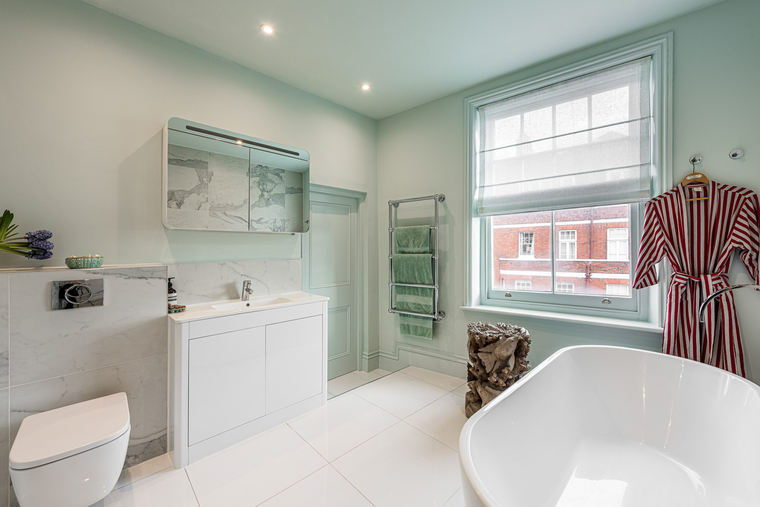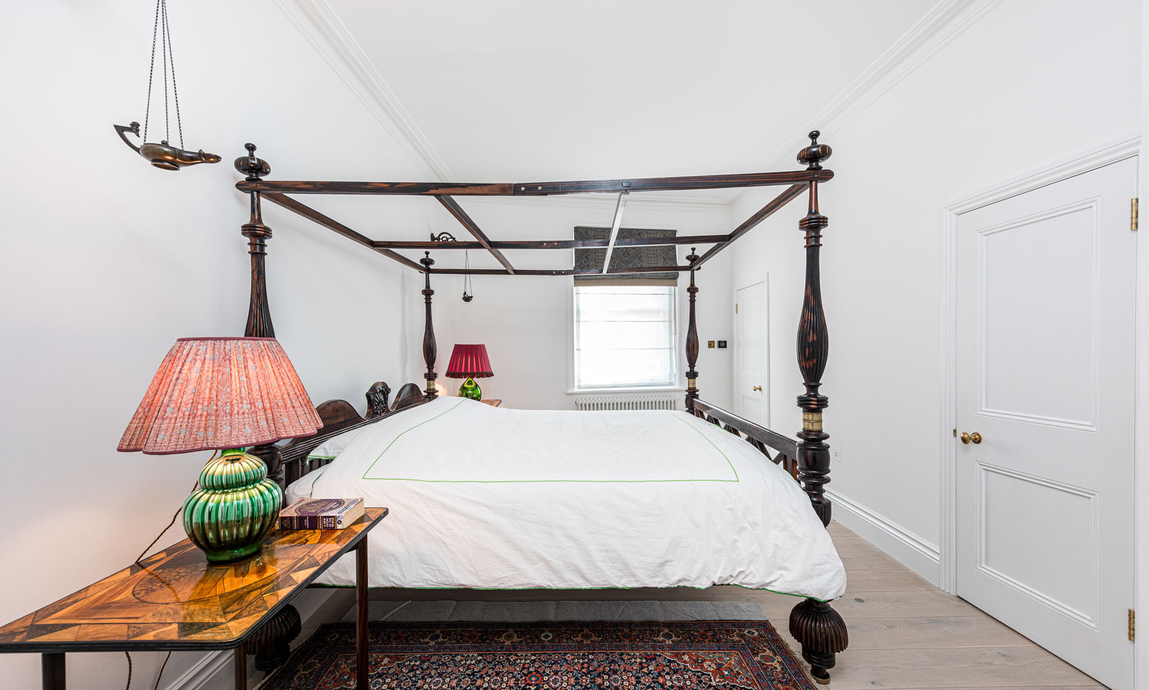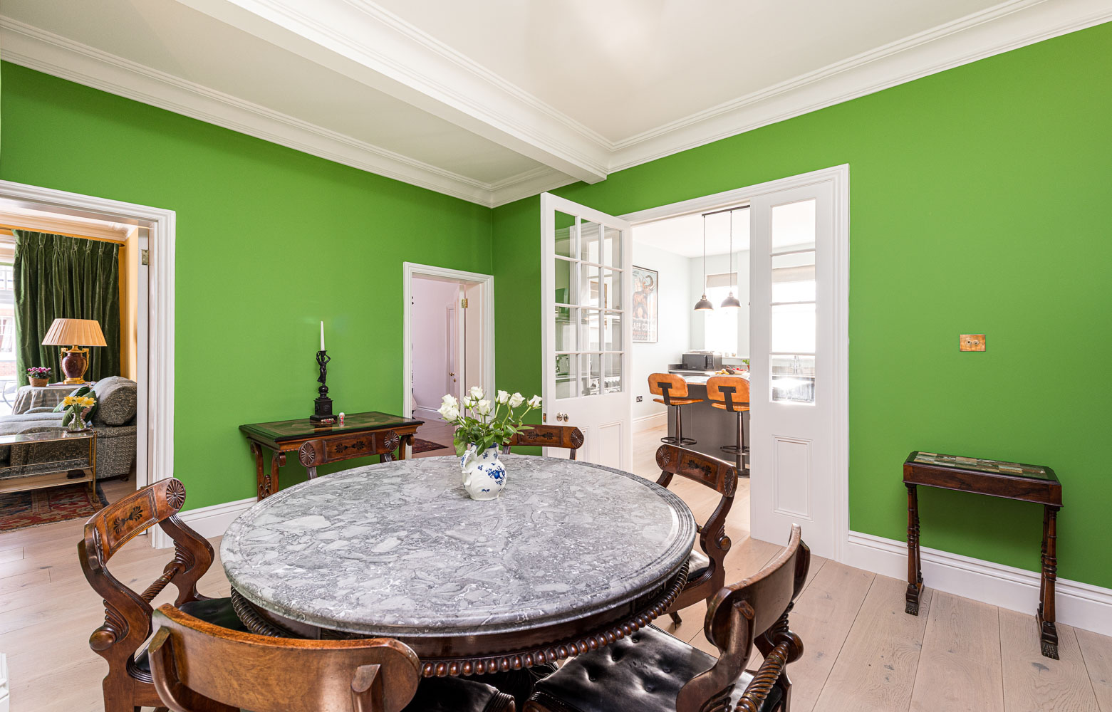 The flat has recently undergone a complete refurbishment to the highest possible specification. The south facing kitchen brings in wonderful natural light which continues into the central dining hall. There is a reception room with access to a balcony that provides park views. The master bedroom has a dressing room and en-suite bathroom. There is a second double bedroom (currently used a study and library) and a third double bedroom both served by a family bathroom.
